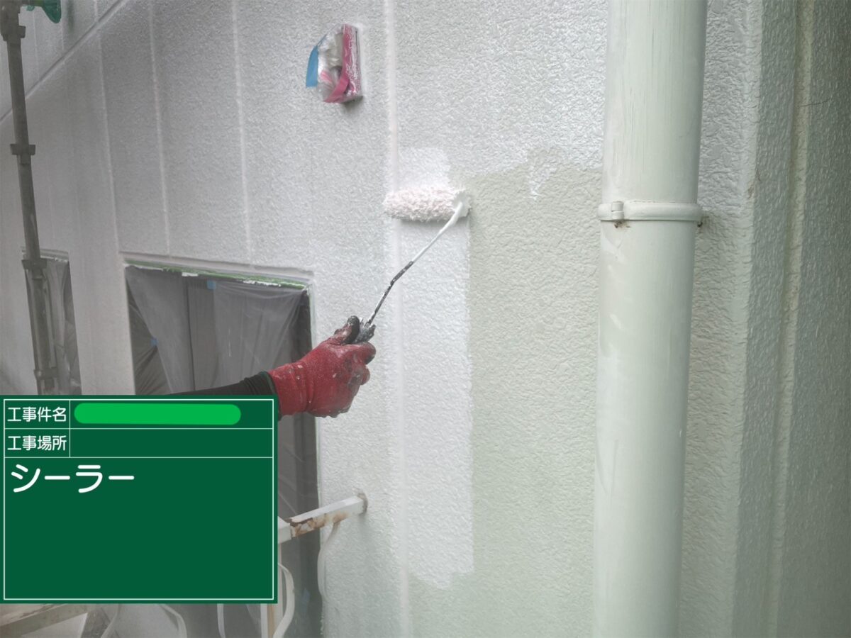 ALCの外壁の塗装になります。まずは高圧洗浄作業をおこない、経年劣化による外壁の汚れや、日当たりが悪い面に発生している藻や苔を洗浄作業で取り除きます。続きまして、シーリングの作業になりますが、サッシ廻りはシーリングの打ち換えとなりますが、打ち継ぎ目地は増し打ちのシーリングとなります。ALCパネルは不燃の軽量気泡コンクリートで、耐火性・防火性に優れているのが特徴になりますが、防水性が低いので、定期的なメンテナンスが必要な外壁材になります。外壁の塗装の下塗り材には、アステックペイントのエクセルエポシーラーを使用です。エクセルエポシーラーは、マイクロエマルション樹脂とエポキシ樹脂を配合した樹脂で構成されていて、このマイクロエマルション樹脂は、一般的な水性形下塗材と比較して樹脂サイズが非常に小さいため、下地の奥まで浸透できます。またエポキシ成分により、樹脂と下地、樹脂同士の付着力を向上させることができる高浸透固着性のシーラーになります。また、エクセルエポシーラーは、カチオン系の樹脂を採用しており、プラス(+)の電荷をもっています。一般的にコンクリートやモルタルなどの下地は、マイナス(-)の電荷をもち、通常の付着力と併せて電気的な付着力が発揮されるため、従来の水性系下塗材よりも付着力が高くなる、強付着性があります。中塗りと上塗りの塗装には、エクセルエポシーラーとの相性のよい、スーパーラジカルシリコンGHのオフホワイトを使用し、外壁の塗装を仕上げました。