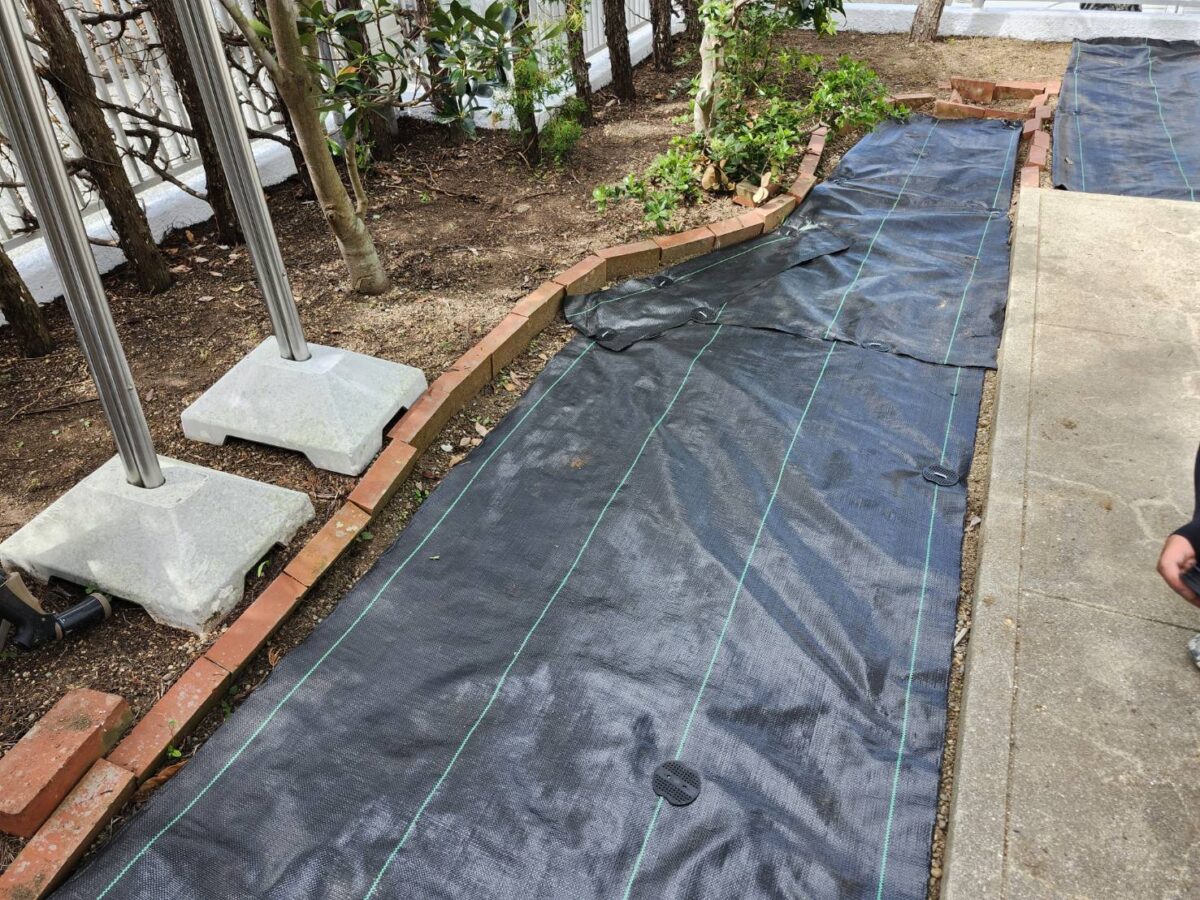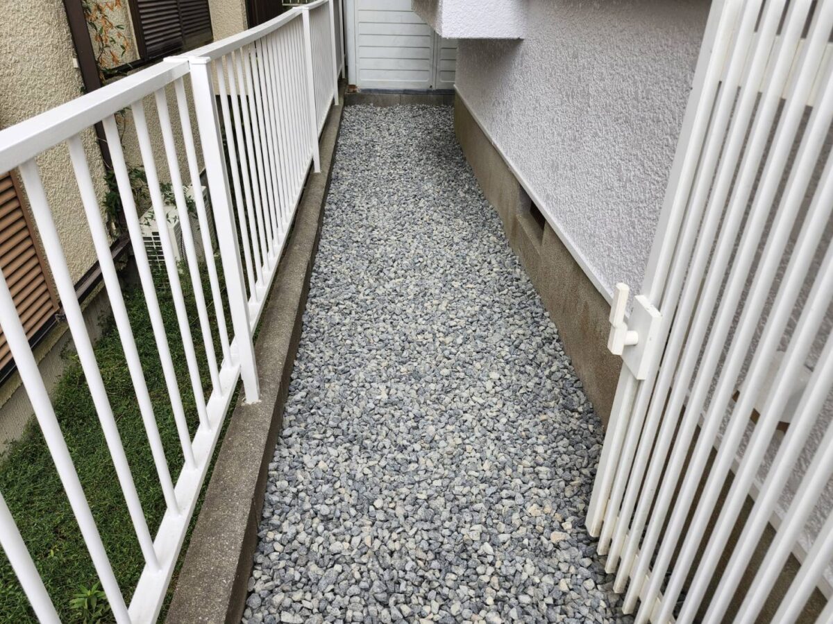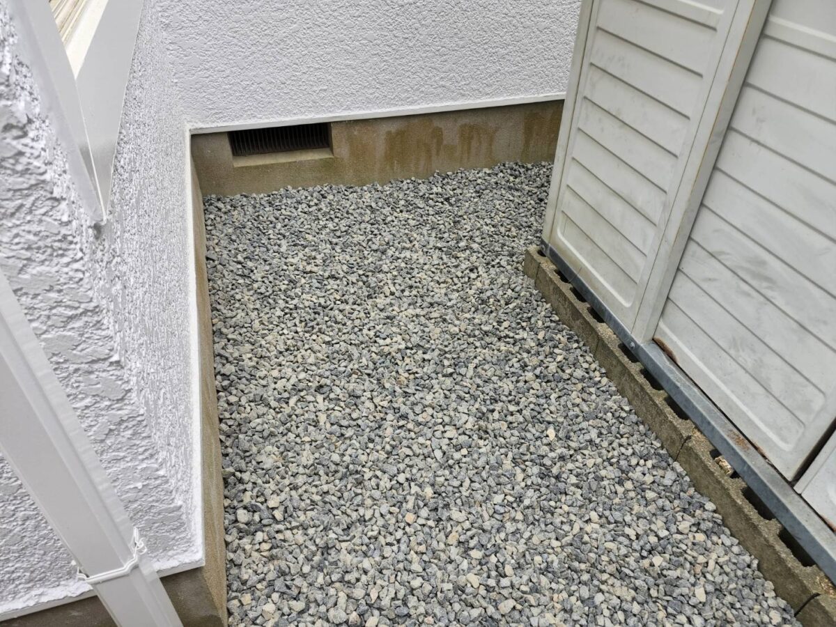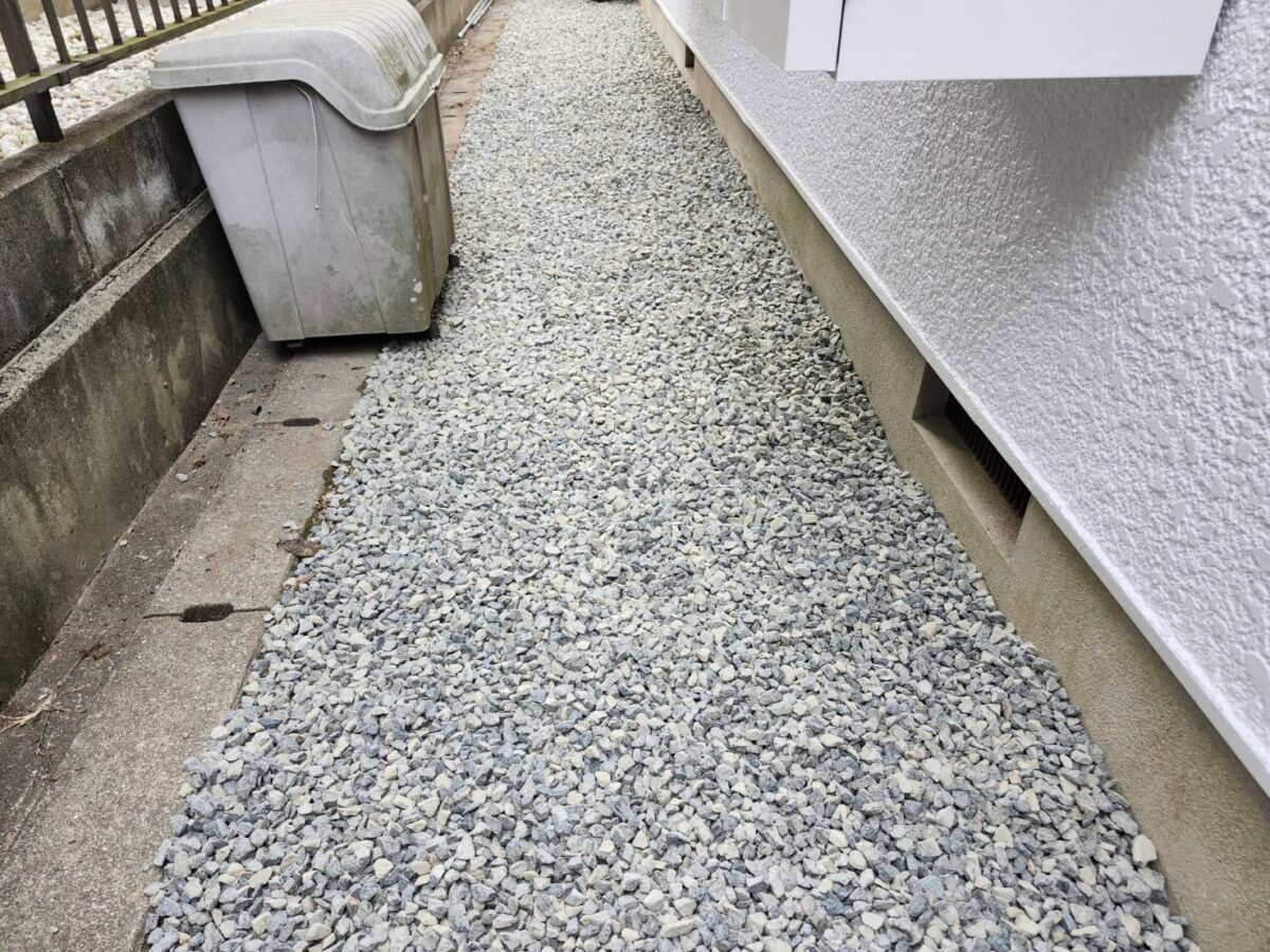 砕石バラス敷きになります。そのまま砕石バラスを土の上に敷いてしまうと雑草が生えてくるリスクが高くなりますので、間に防草シートを敷くことで、雑草が生えてくるリスクを軽減します。今回の施工では、お家の周りすべてに砕石バラスを敷く予定で施工をさせて頂きました。これで雑草問題が解決しそうですね!