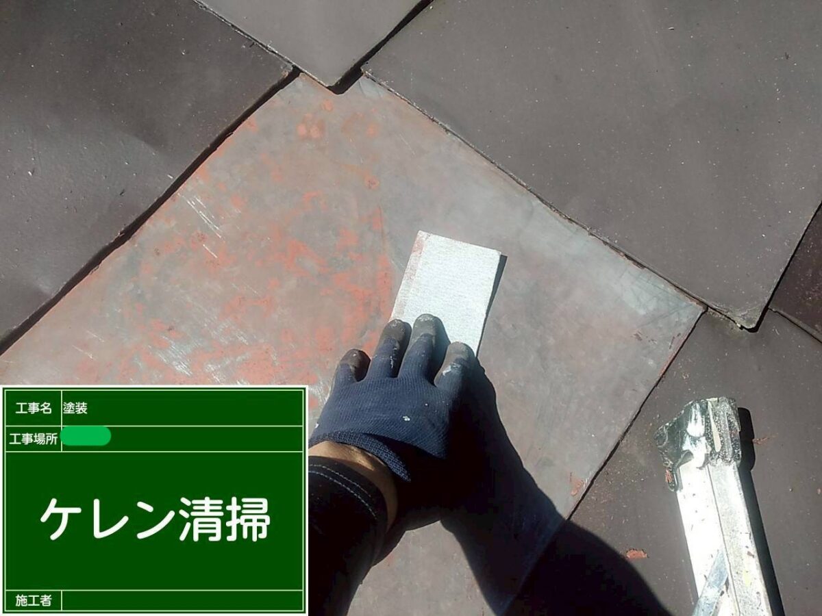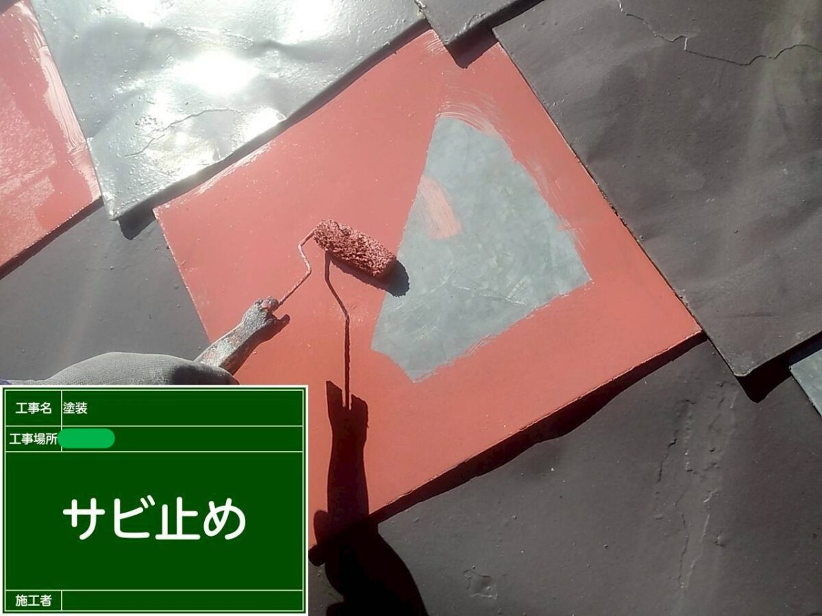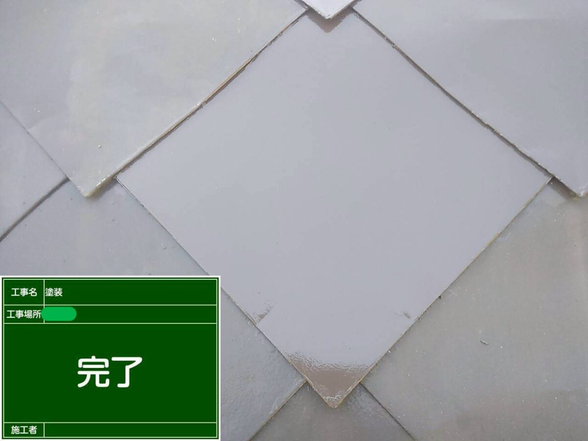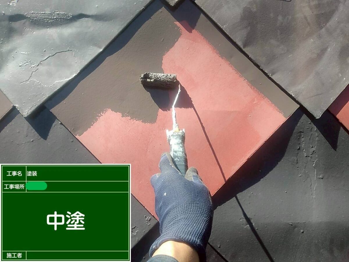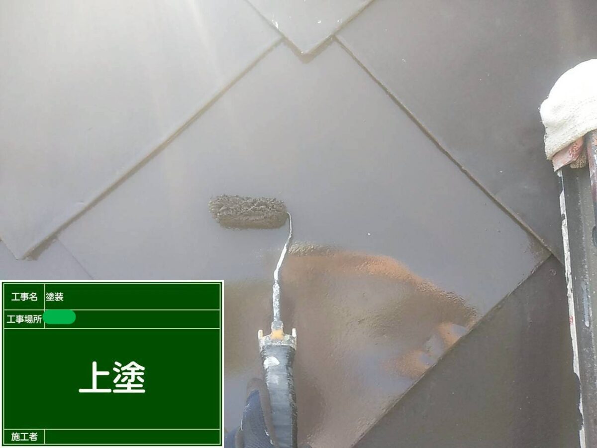 中塗り塗装から完了までの塗装工程をご紹介します。今回、使用の塗料は日本ペイントのファインウレタンになります。現状色に近づけての塗装になりますので、塗料は現場で調色作業をおこないました。既存の屋根は経年劣化により艶がありませんでしたので、今回塗装した箇所は艶があり、少しの間は目立ってしまいますが、徐々に周りの色に馴染んで来ると思われます。下塗りの錆止めの塗装から合わせて、3回塗りで屋根の塗装を仕上げました。