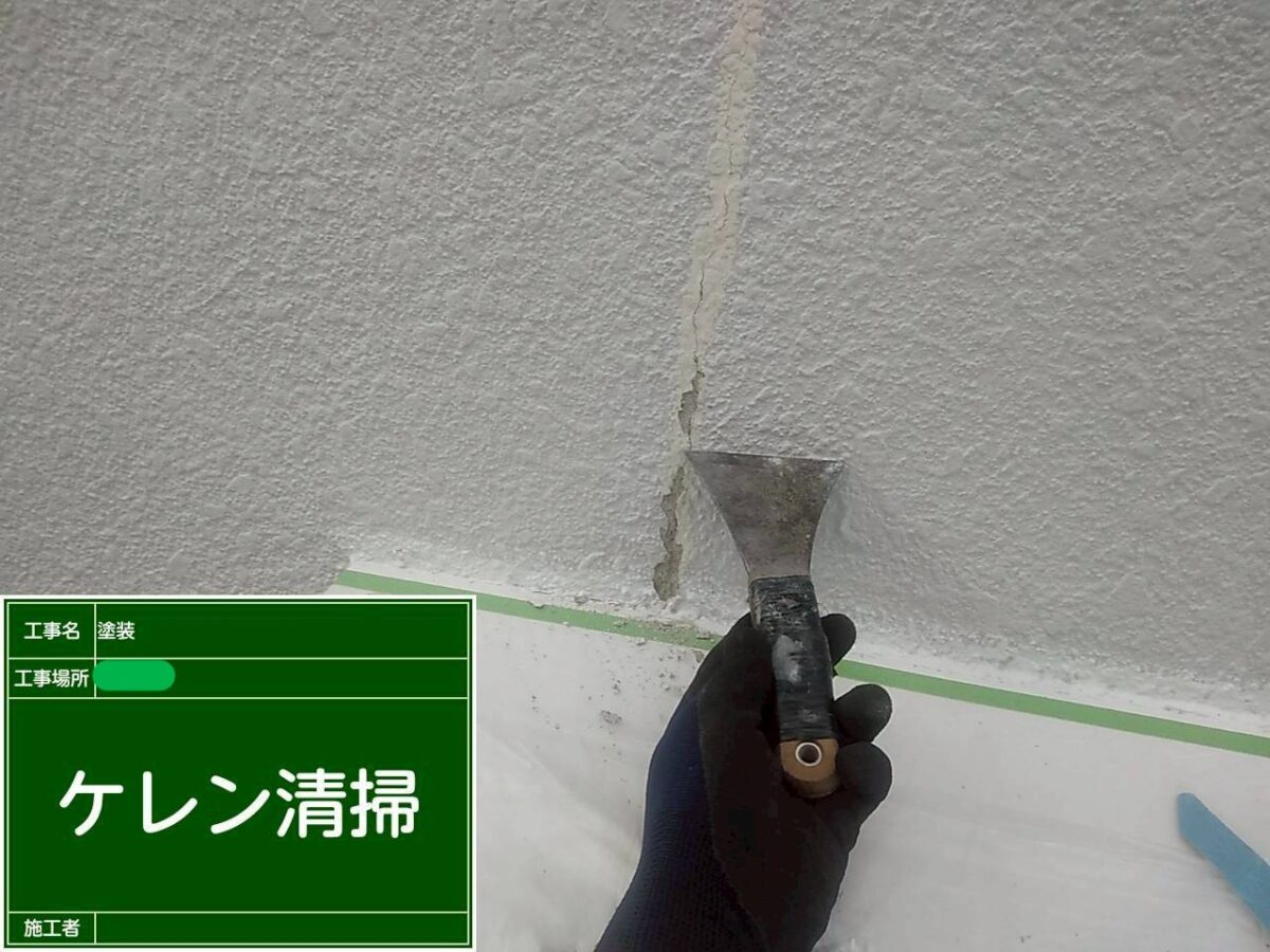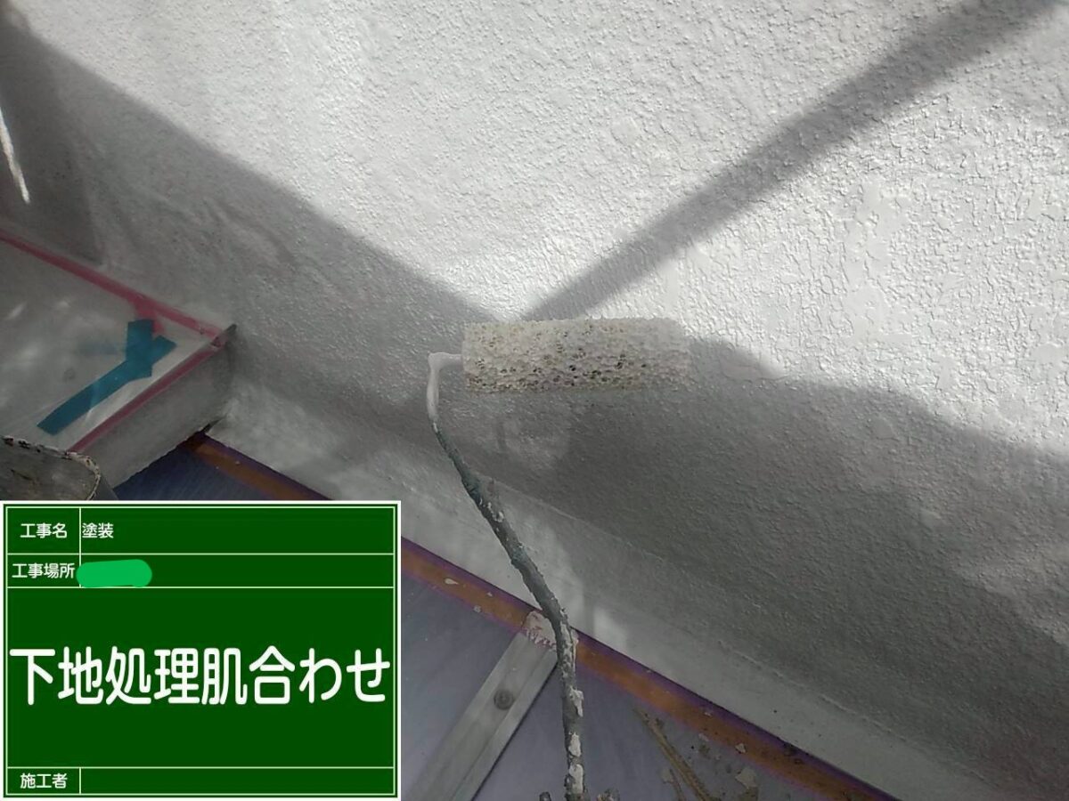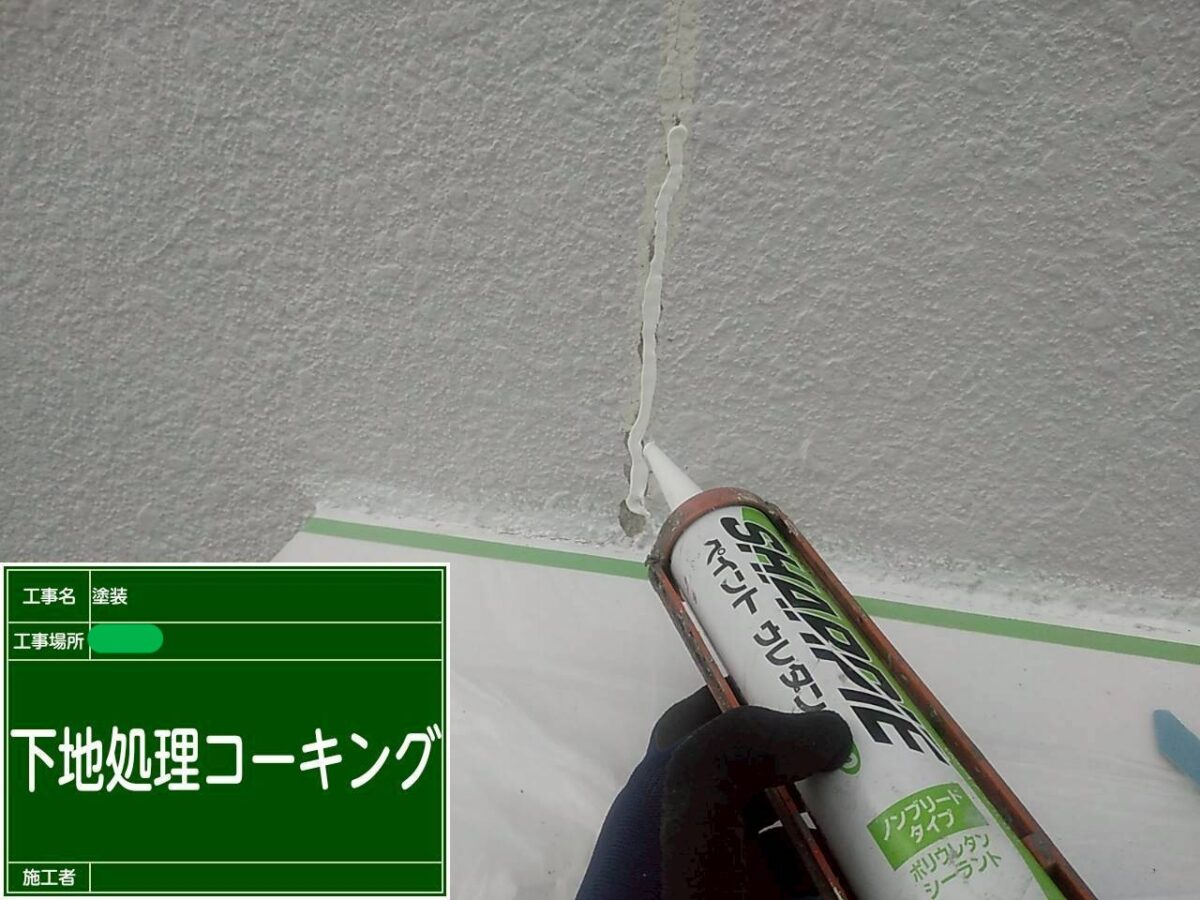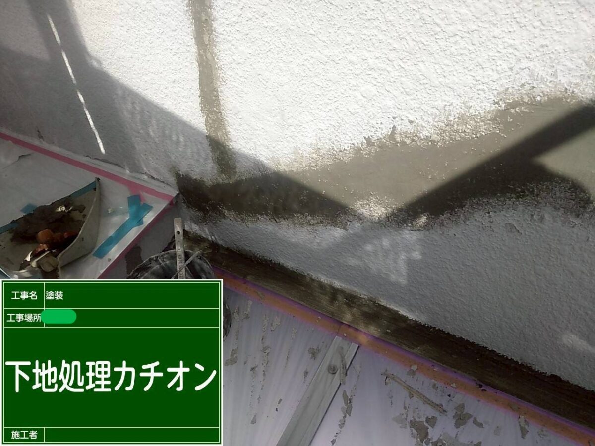 塗装前の外壁の下地処理になります。既存の外壁はモルタルの外壁になっており、クラック(ひび割れ)が多くありました。施主様が以前、自身でクラック部分を補修されたそうですが、シーリング部分が完全に劣化している状態でしたので、まずは既存のシーリングの撤去をおこないました。続きまして、シャープ科学工業のペイントウレタンを使用し、シーリングの撤去をおこなった箇所にシーリング材を充填し、塗装後にシール跡が目立たないように、その周り全体をカチオン樹脂モルタルを使用し、下地処理をおこなってから、周りの凹凸模様に合わせるように、日本ペイントのタイルラックベースを使用し肌合わせの作業をおこないました。タイルラックベースは、凹凸模様・ヘッド押さえ模様・小柄凹凸模様・ゆず肌模様など様々な仕上がりが可能な複層仕上げ材になります。外壁の下地処理の工程に続き、外壁の下塗り塗装・中塗り塗装・上塗り塗装の工程となります。