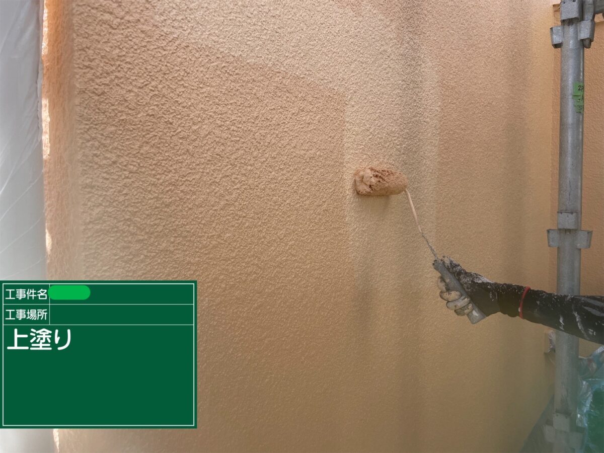 モルタル壁の外壁の塗装になります。高圧洗浄をおこない、外壁のゴミやホコリを丁寧に洗浄し、外壁の下地処理となります。既存の外壁はクラック(ひび割れ)が多くありましたので、ウレタンコーキングとカチオン樹脂モルタルで下地処理をおこないました。続きまして下塗りの塗装となりますが、今回は既存の外壁にクラック(ひび割れ)が多くあることから、塗装後に補修箇所が目立ってしまいますので、下塗りの塗装には、フィラーを使用したパターン出しの作業をおこないました。パターン出しとは、スポンジ状のマスチックローラーを使用し、凹凸模様を付ける作業になります。この作業をおこなうことで、塗膜に厚みがつきますので、補修した箇所が目立たなくなります。使用材料はアステックペイントのホワイトフィラーAⅡになります。中塗り塗装と上塗りの塗装にも、同じくアステックペイントのスーパーラジカルシリコンGHを使用です。塗料の商品名にもなっているラジカル(紫外線によって発生する劣化因子のラジカル)を光安定剤のHALSとラジカルの発生自体を抑える白色顔料を採用することで、紫外線や直射日光・雨・風などから外壁を長期間保護します。その他にも、防藻・防カビ性があり、柔らかい層を強靭な層でコーティングした二重構造のアクリルシリコン樹脂を採用しており、汚れが付着しにくい「低汚染性」を実現しています。表面にツヤのある塗膜を形成し、付着した汚れもある程度の雨水で流れ落ちるため、建物の美観を長く保てます。今回はアプリコット色で外壁の塗装を仕上げました。