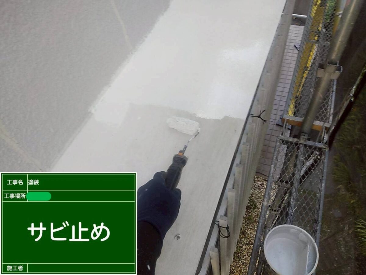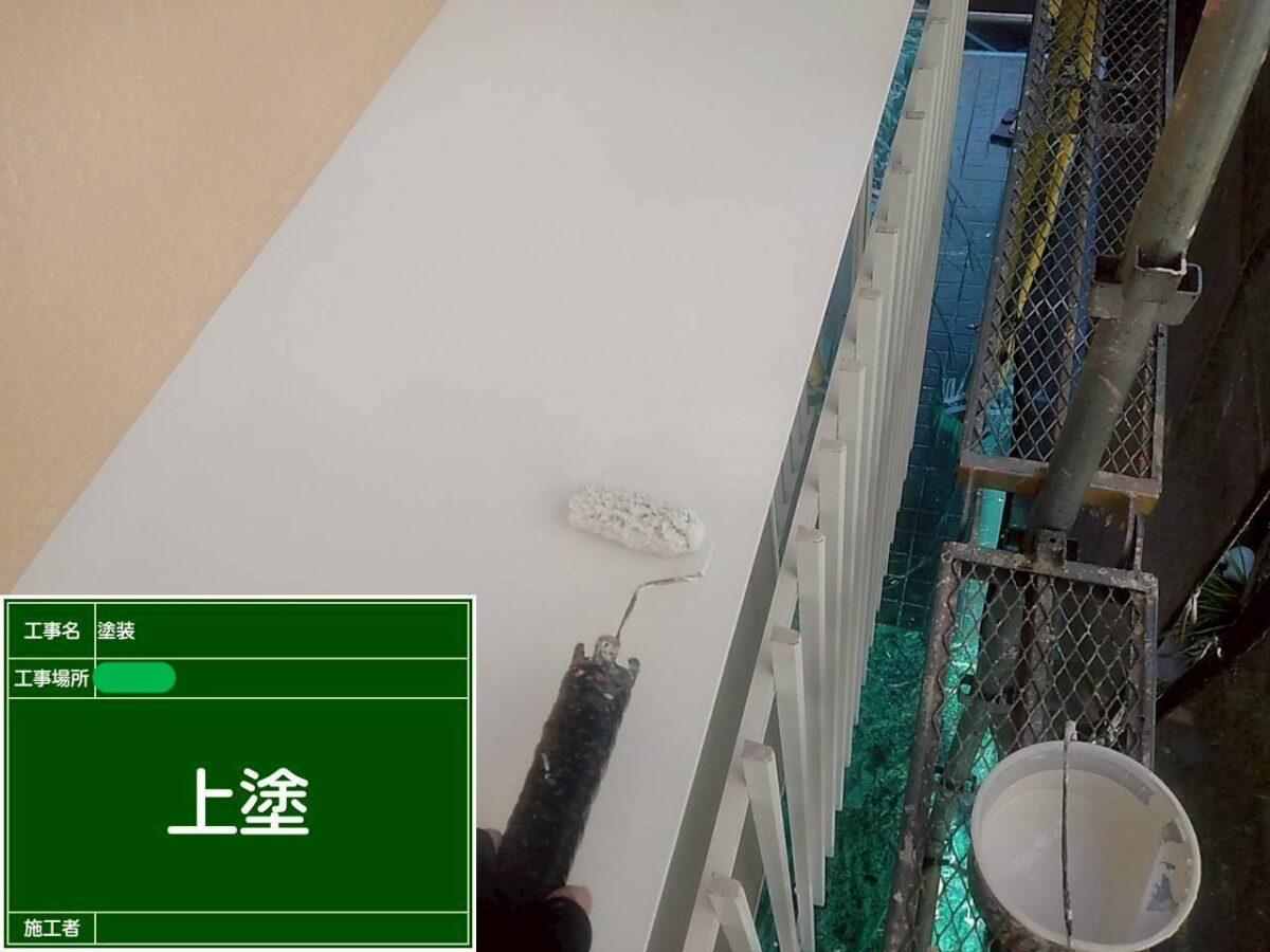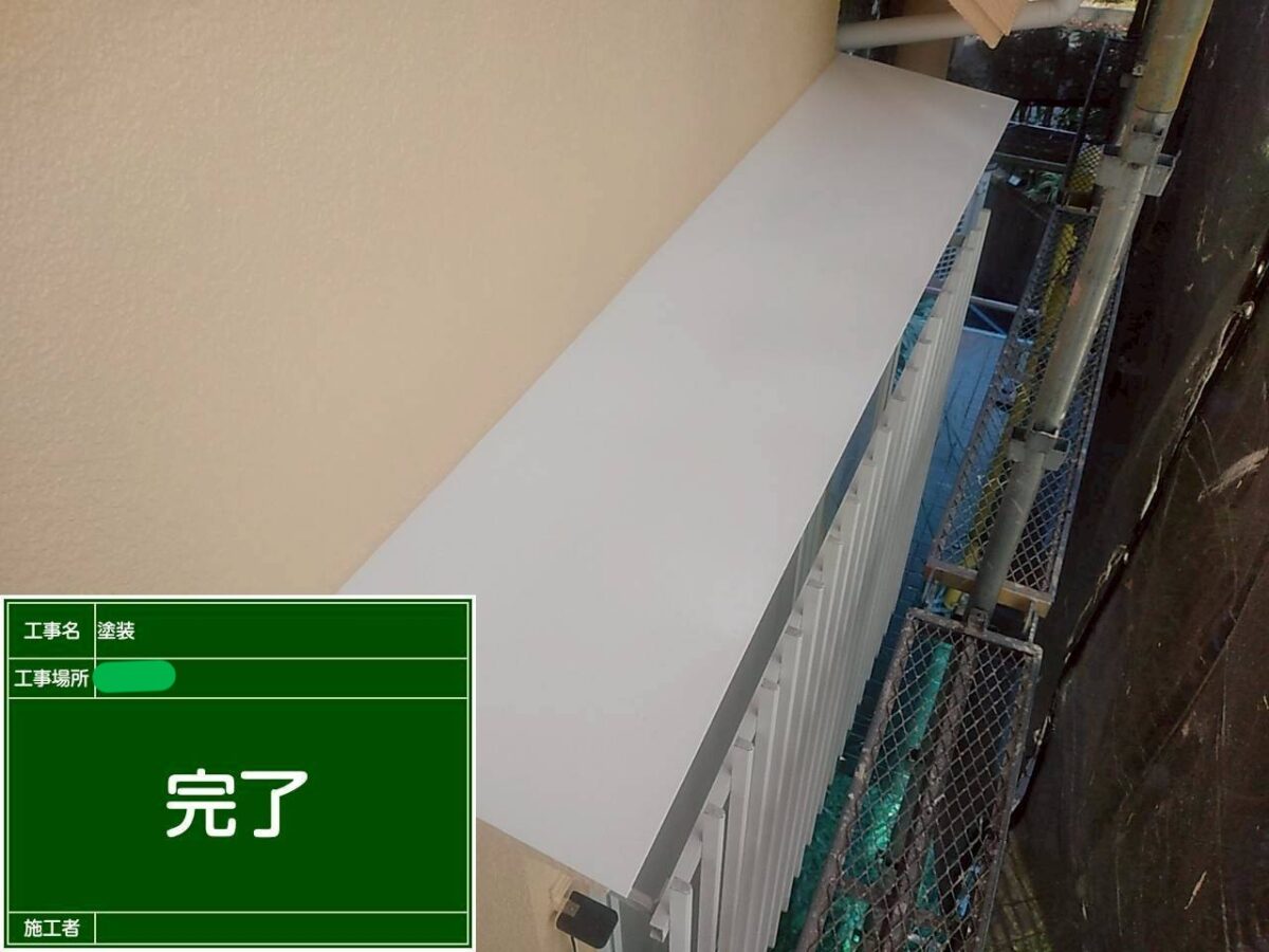 庇の塗装になります。鉄部の付帯物になりますので、目粗しのケレン作業をおこない、下塗りの塗装には、錆止めを塗装する必要がありますので、日本ペイントの1液ハイポン・ファインデグロのホワイトを使用し、下塗りの錆止めの塗装作業をおこないました。2液型エポキシ樹脂と同等の高い防錆力がありますので、下地にもよりますが、一般的なご家庭の鉄部の下塗りの錆止めの塗料としてよく使用している塗料になります。亜鉛メッキやアルミニウム・ステンレスなど、幅広い下地に塗装可能になり、速乾性の塗料でもありますので、手離れがよいのも一つ塗料の特徴になります。上塗り材には、同じく日本ペイントのファインSiを使用です。隠ぺい性が良く、塗装時の発泡も無く、抜群の塗りやすさがあります。低汚染性、防藻、防カビ効果にも優れているので建物の美観を損なう雨垂れ汚染や藻類、菌類による汚染から建物を保護する事が可能で、しかも耐候形1種の耐候性を持っているので、色褪せや艶引けに対しても、優れた抵抗力を持っています。また、ファインSiはターペン可溶なので、環境にも優しく、透湿性もある塗料なので、膨れや剥がれに強い塗料になります。