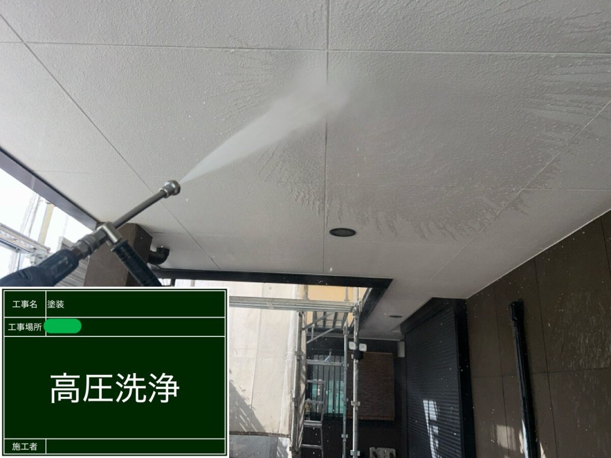 駐車場の天井の塗装になります。既存の天井は、ケイカル板にリシンの吹付仕様になっております。汚れやホコリが多く付着しておりましたので、今回は、天井の高圧洗浄をおこないました。このような天井は上からの水漏れによって、よく塗膜が膨れていたり、剥がれていたりしますが、そのような箇所はなく、全体的にホコリで黒く汚れている程度でしたので、洗浄後は、下地処理などなく塗装可能な状態です。