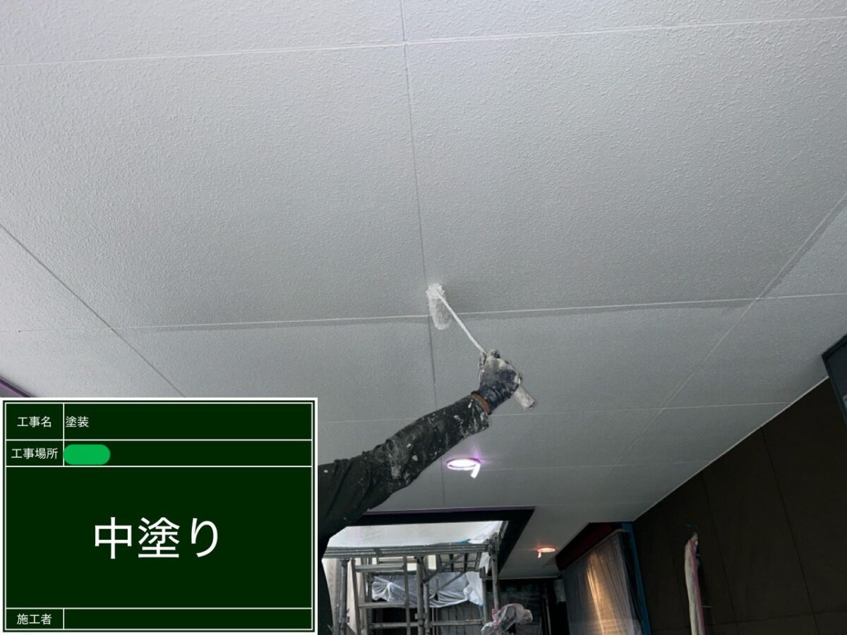 今回、天井の塗装には、日本ペイントの水性ケンエースを使用です。水性ケンエースの特徴は、水系、非危険物、1液形の塗料のため、臭気が少なく、ポットライフがない塗料になり、取り扱いやすい塗料になります。1液水性反応硬化形なので、密着性にすぐれており、やに止め性・付着性・耐水性にすぐれています。また、藻やカビの発生を抑える効果があります。水性ケンエースはシーラーレスで施工が可能な塗料になり、下塗りの塗装工程を省くことが出来ますが、旧塗膜の状態によっては下塗りの必要がありますので、そこは注意が必要です。水性ケンエースは落ち着きのある艶消しの塗料になり、今回は、日塗工のN-90で天井の塗装を仕上げました。