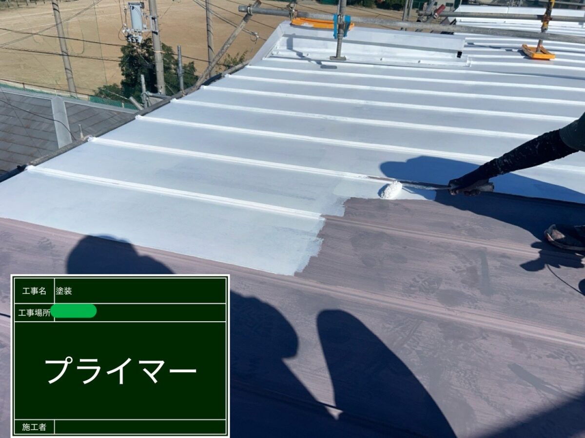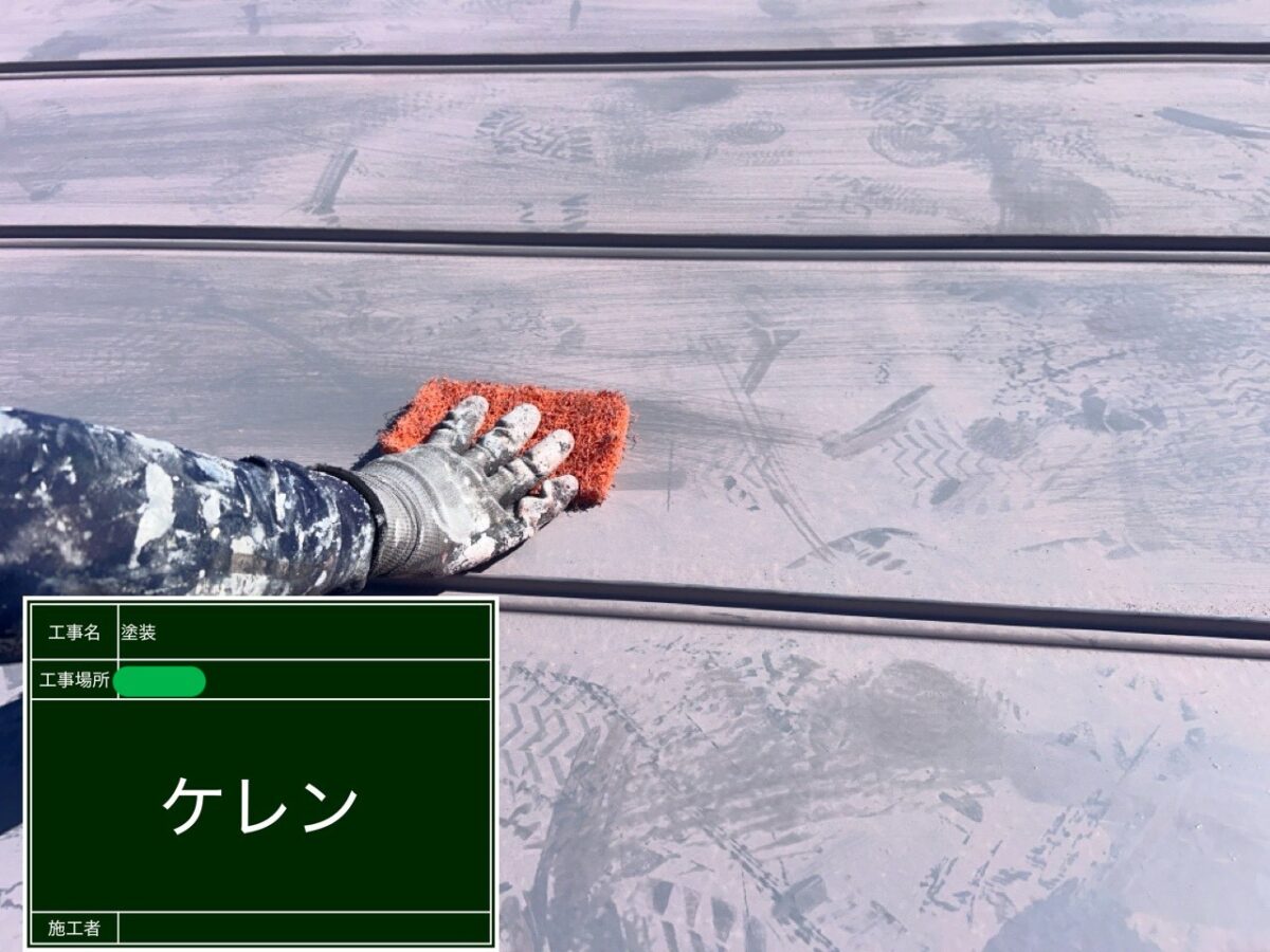 屋根の塗装になります。既存の屋根の状態ですが、前回はグレーに塗り替えされたそうですが、紫外線や直射日光を受けて退色し、現在は全体の色が、ご覧の色に退色したそうです。まずは高圧洗浄で、出来るだけチョーキングが残らないように洗浄作業をおこない、屋根全体のケレン作業をおこないました。今回、屋根の下塗り材には、アステックペイントのサーモテックメタルプライマーを使用です。サーモテックメタルプライマーの特徴は、金属屋根や外壁の錆を防ぐ効果があり、住宅街や市街地などの一般的な環境で十分な防錆性を発揮するように設計されています。また、屋根や外壁への太陽熱の吸収を抑える遮熱性もある塗料になります。上塗り材には、同じくアステックペイントのシャネツテックF-JYを使用です。シャネツテックⅡF-JYは、弱溶剤の2液型のフッ素塗料になります。遮熱顔料と熱放射セラミックを配合することで、高い遮熱性能を持っています。これにより、室内への熱の侵入を抑制し、屋根への蓄熱によるダメージを軽減します。耐用年数は16年から20年となります。