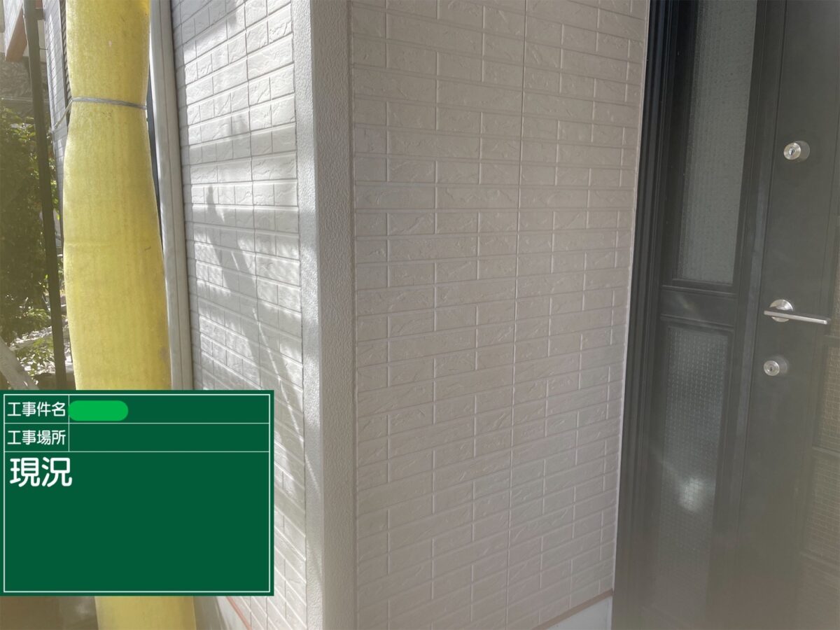 洗浄前の外壁の状態ですが、手で外壁を触るとご覧のように手が白くなるチョーキング現象(白亜化現象)が酷く、塗膜が完全に劣化している状態でした。チョーキング現象は、紫外線や雨・風などの影響で時間の経過とともに塗膜が劣化します。これは塗料に含まれている合成樹脂が分解され、顔料が粉状になって外壁表面に現れる現象で、塗装のサインの目安にもなります。シーリングの状態も、完全に劣化しており、紫外線や温度変化による膨張・収縮を繰り返し、経年劣化によってシーリング材が硬化することで、ひび割れをおこし防水性が失われている状態です。
