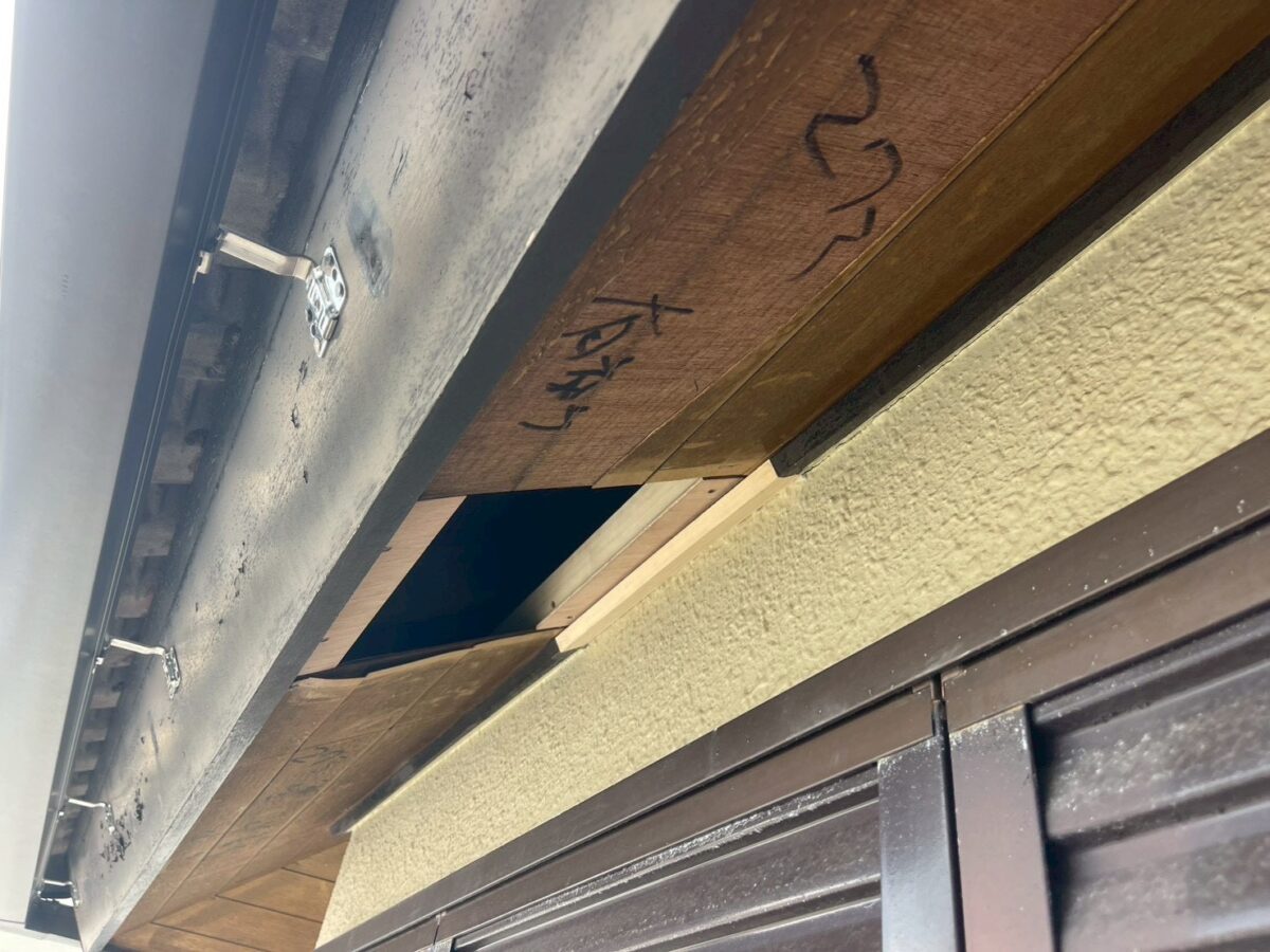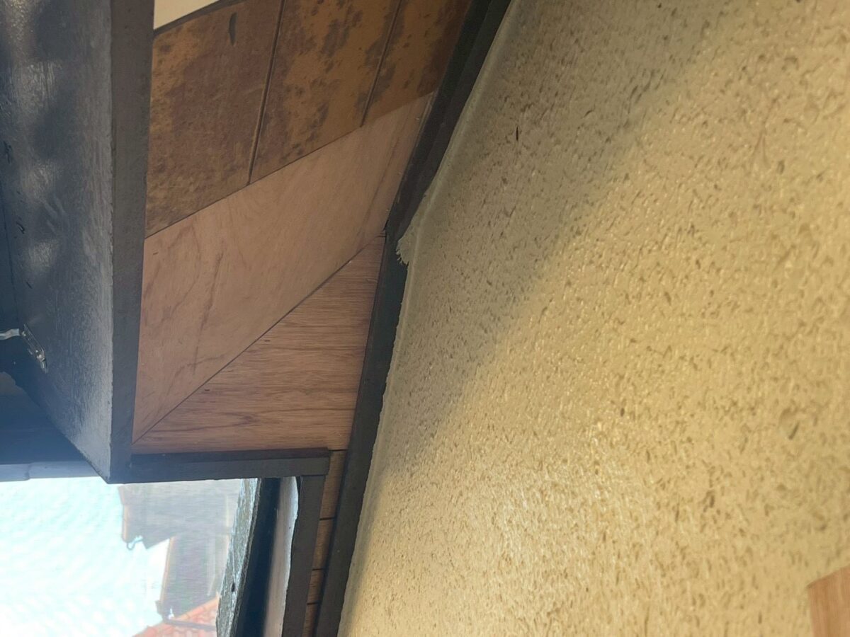 軒天井の張替えと塗装になります。既存の軒天井は、ご覧のように全体的に経年劣化により天井全体が、捲れており、換気ガラリが落ちそうになっている箇所もあり、今回の施工では、軒天井すべてケイカル板に張替える作業をおこないました。まずは既存の軒天井が完全に劣化してしまっている箇所を撤去し、下地補修として4mmのべニア板を貼り付けました。続きまして、軒天井のサイズに合わせて、ケイカル板を加工し、軒天井に取り付ける作業をおこないます。最終、軒天井の取り合い部分は変性シリコンを使用し、軒天井の張替え作業が完了となります。