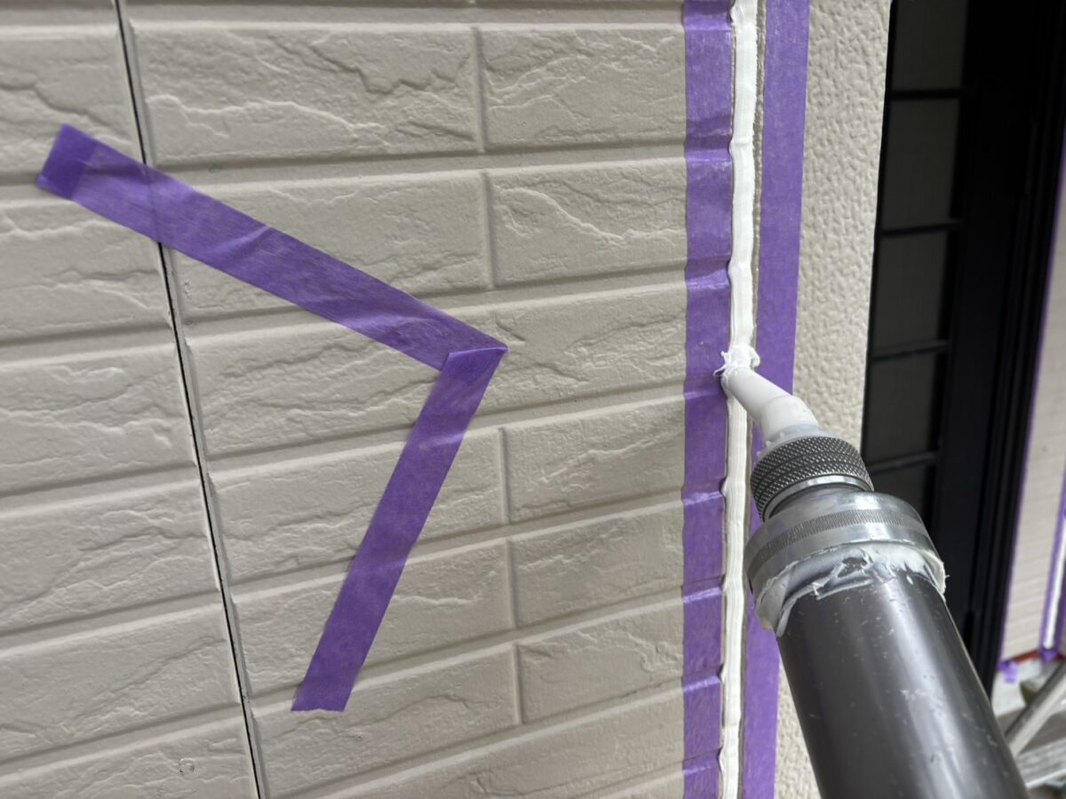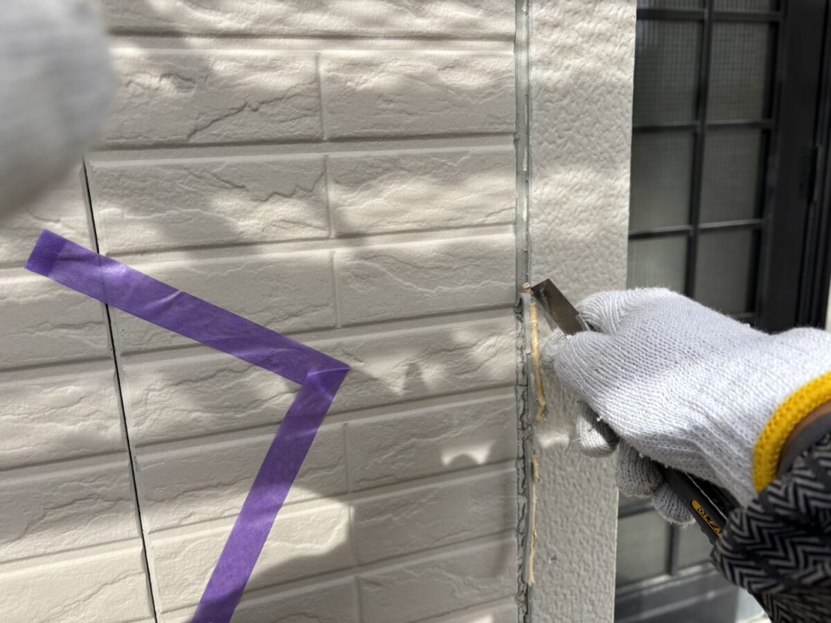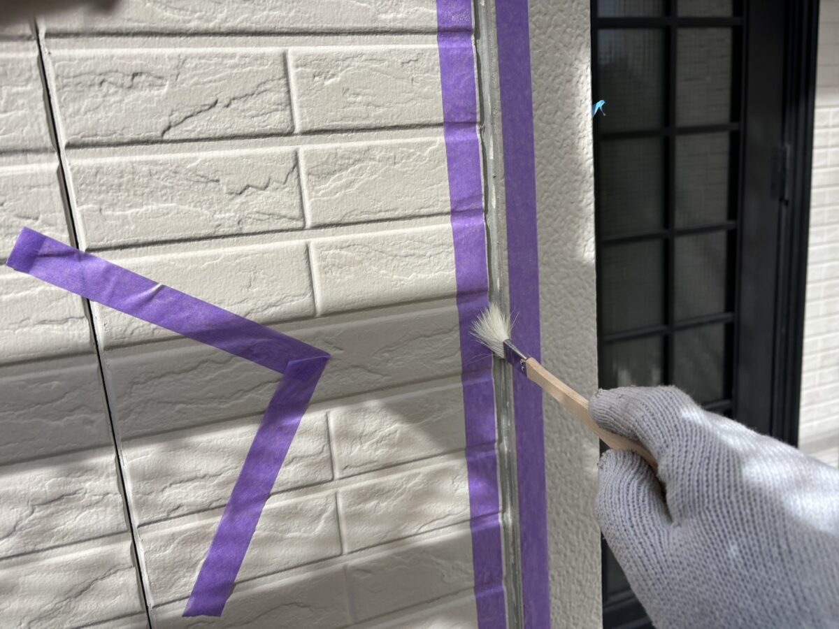 外壁下部のシーリングの打ち換え作業になります。まずは外壁の高圧洗浄をおこない、シーリングの打ち換え作業となります。既存のシーリング材の状態は、経年劣化により、ひび割れや痩せている箇所がほとんどでした。シーリングの施工内容は、既存シールの撤去をおこない、養生→プライマーを塗布→シーリング材充填→仕上げ→完了となります。外壁塗装を施工する際は、シーリングの打ち換え工事も一緒に施工することをおススメします。