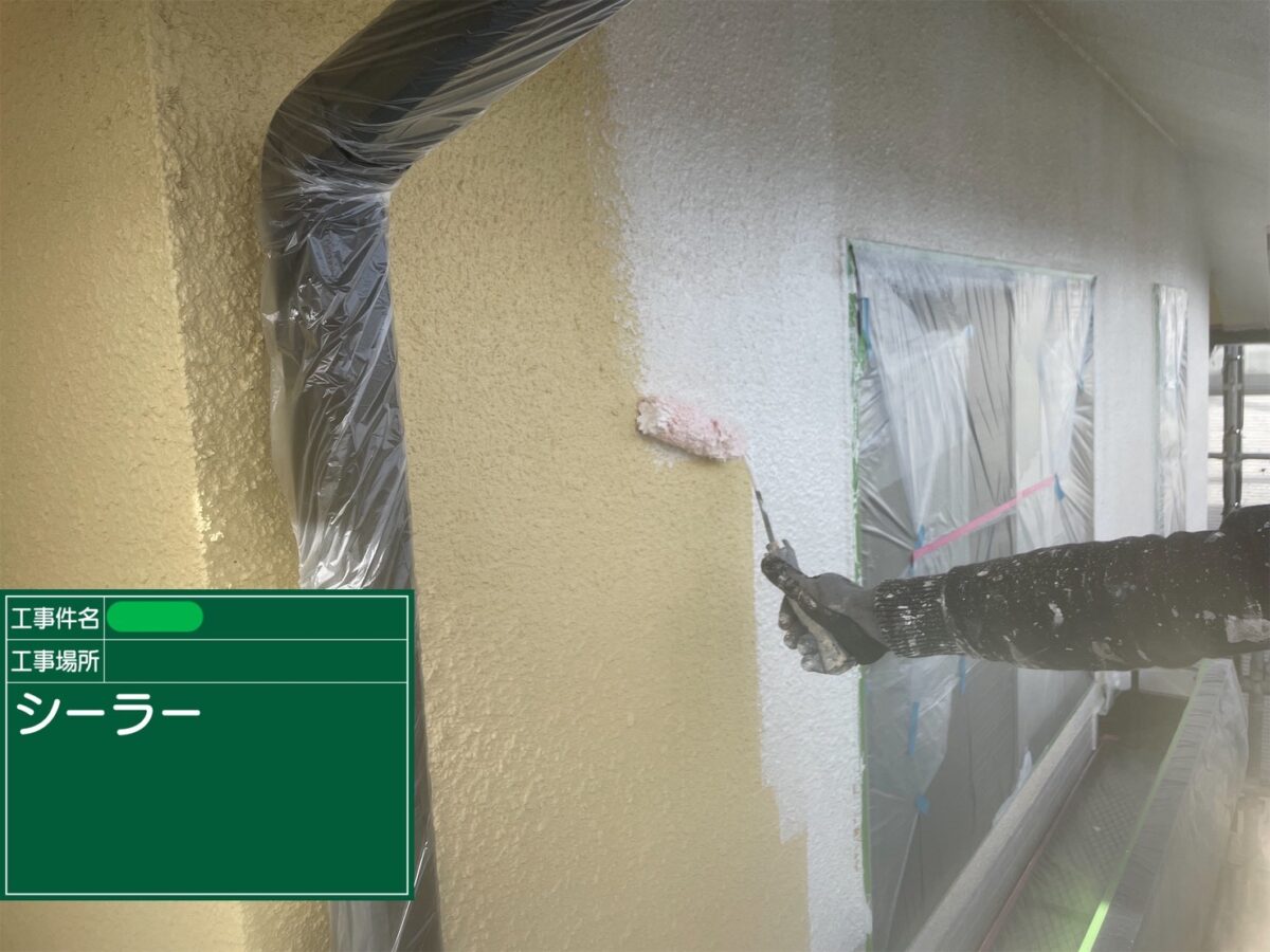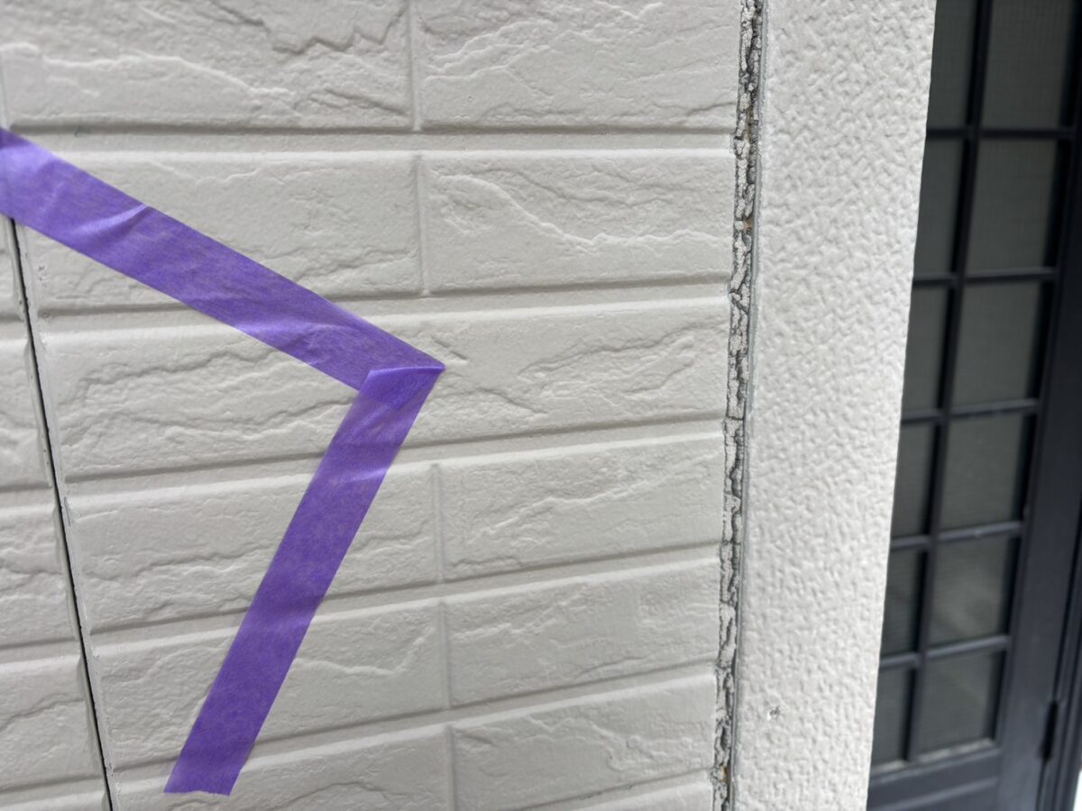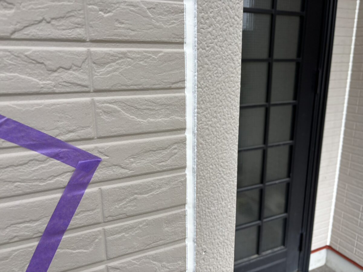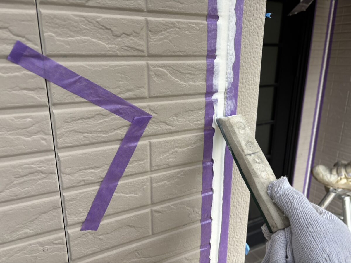 外壁下部のシーリングの打ち換え作業になります。まずは外壁の高圧洗浄をおこない、シーリングの打ち換え作業となります。既存のシーリング材の状態は、経年劣化により、ひび割れや痩せている箇所がほとんどでした。シーリングの施工内容は、既存シールの撤去をおこない、養生→プライマーを塗布→シーリング材充填→仕上げ→完了となります。外壁塗装を施工する際は、シーリングの打ち換え工事も一緒に施工することをおススメします。