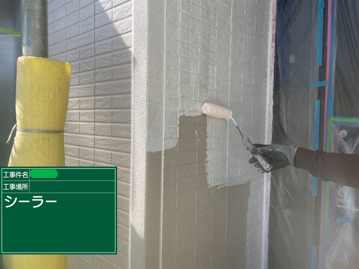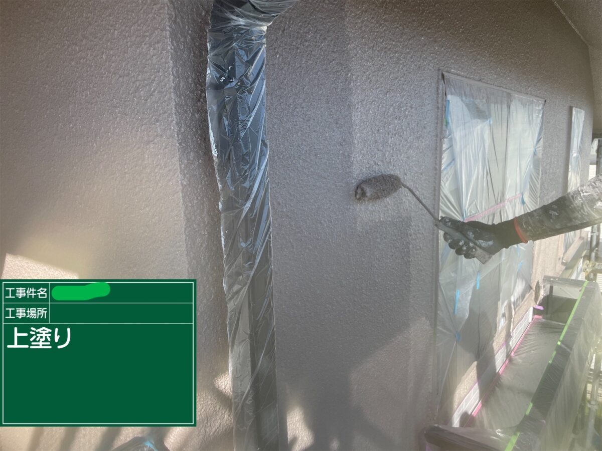 外壁の上部の塗り替え塗装になります。既存の外壁は下地補修などはありませんでしたので、下塗りのシーラーの塗装からご紹介します。アステックペイントの浸透性と付着力があるエポパワーシーラーを使用です。マイクロエマルション樹脂とエポキシ樹脂を配合しており、一般的な水性下塗り材よりも樹脂の粒子が小さく、下地の奥まで浸透する特徴があります。上塗り材には同じく、アステックペイントのスーパーラジカルシリコンGHのグレージュ色で、中塗り塗装と上塗りの塗装をおこないました。スーパーラジカルシリコンGHには、従来の塗料に使われる酸化チタンの代わりにこの顔料を使うことで、ラジカルの発生自体を抑制する、ラジカル制御型白色顔料と、塗膜中で発生したラジカルをHALSが捕捉し、塗膜の劣化を防ぐHALS(光安定剤)を配合しています。ラジカルの発生を抑える2つの技術が採用されている塗料になります。