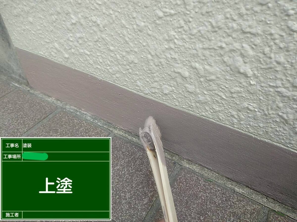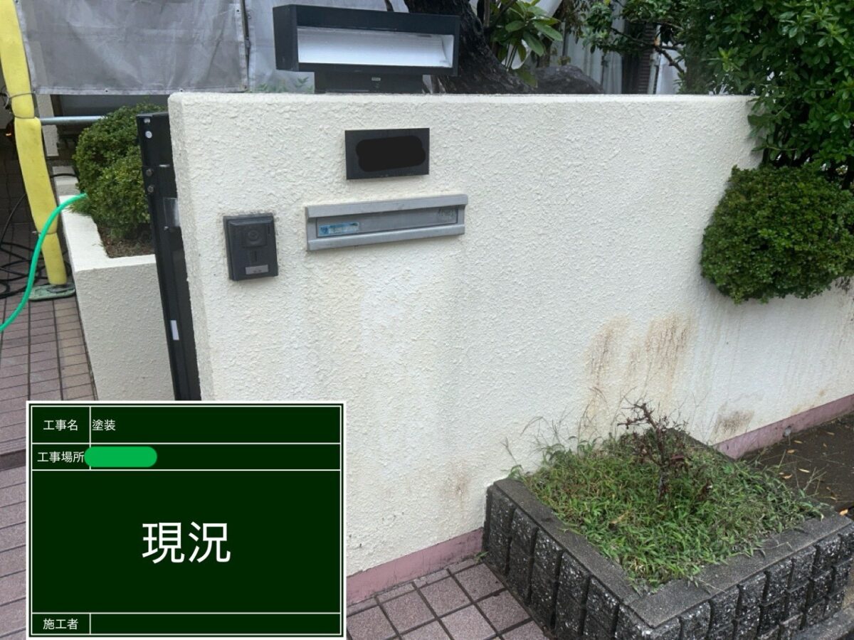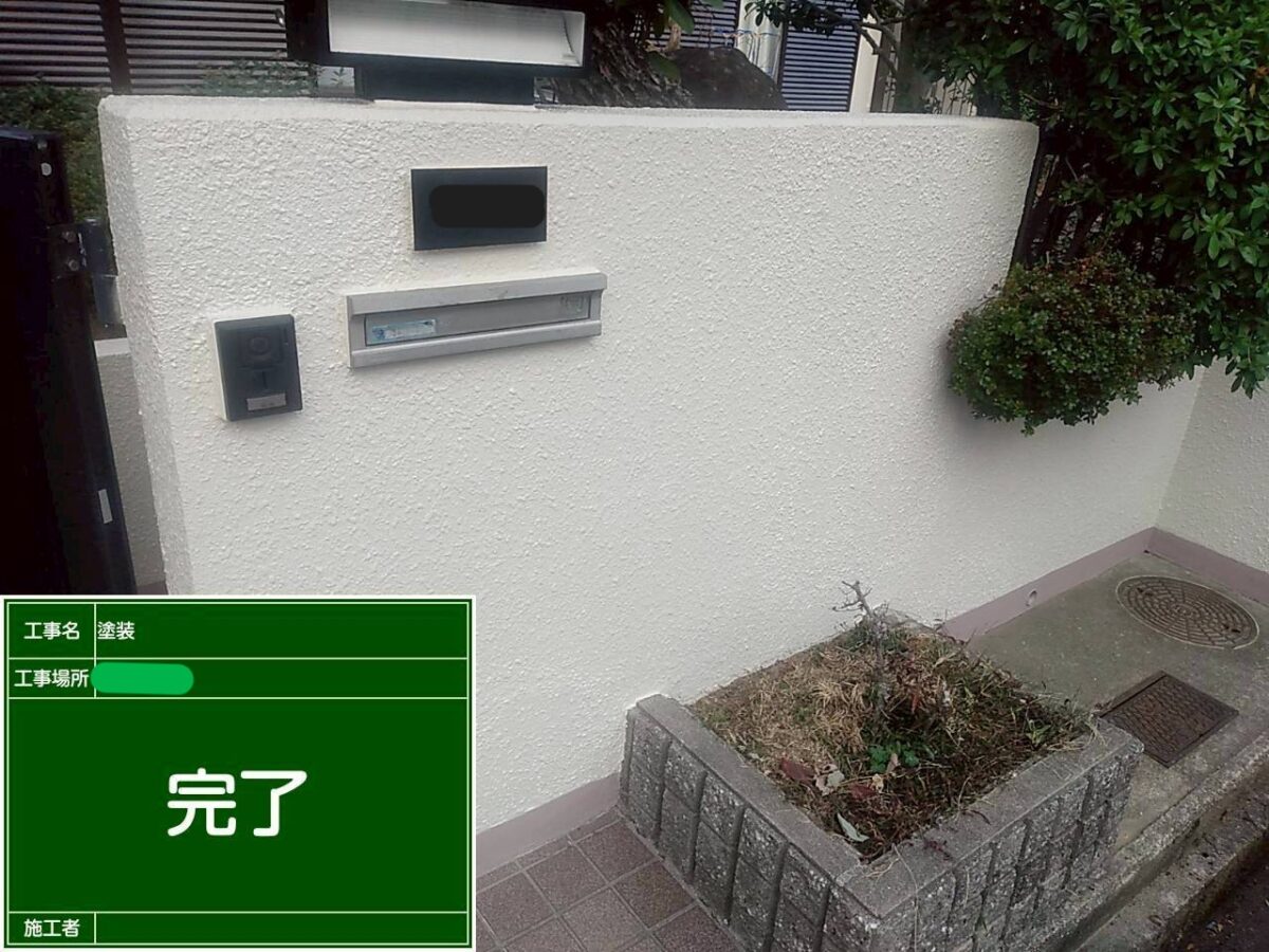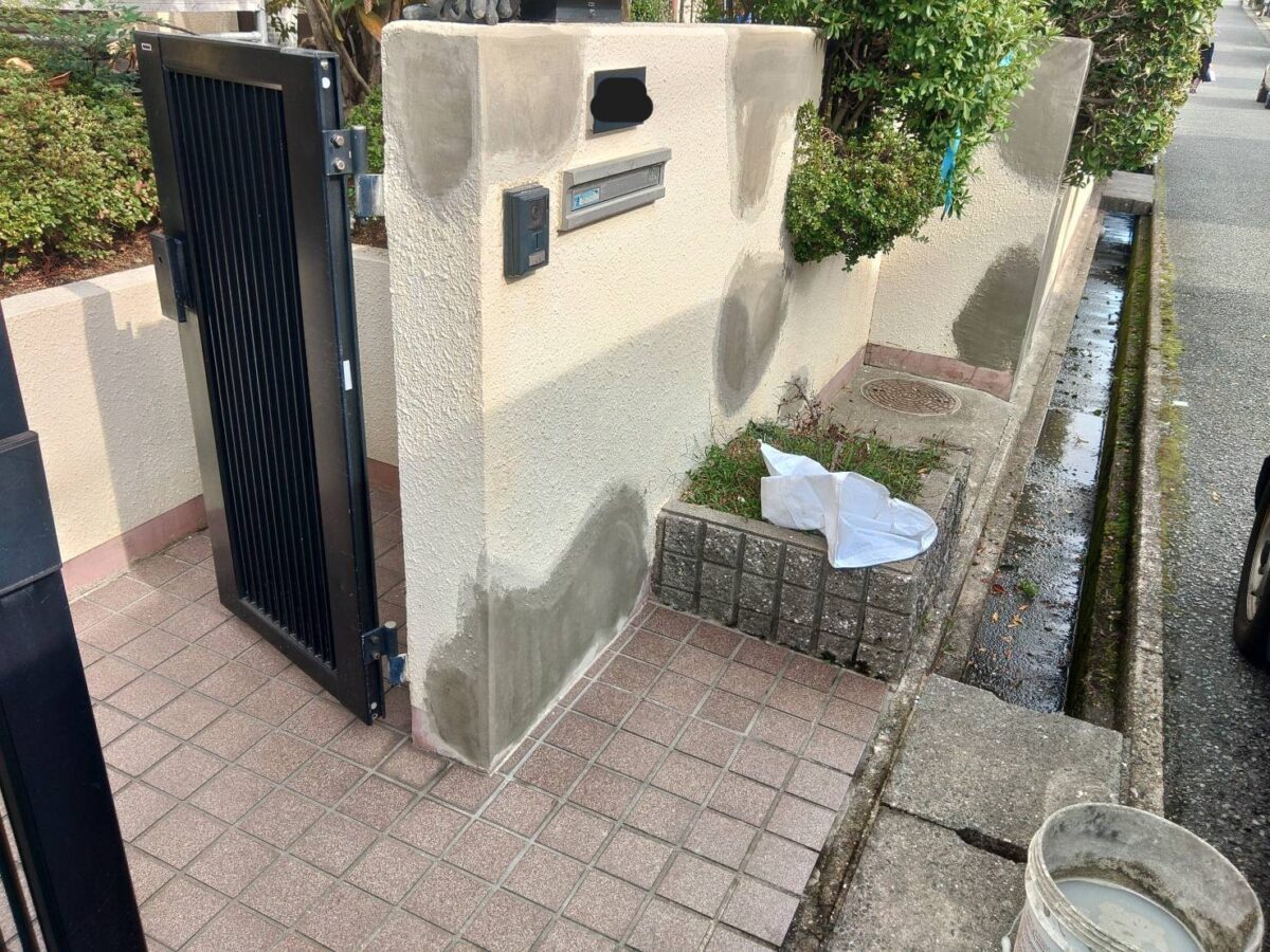 擁壁の塗装になります。既存の擁壁は塗装前の調査の段階で塗膜が浮いている箇所が多くある状態でした。まずは擁壁全体の高圧洗浄をおこない、浮いている塗膜の撤去作業になります。塗膜の浮きは、擁壁全体にありましたので、打診棒で擁壁の調査をおこないながら、撤去作業をおこないました。続きまして、下地の補修作業になりますが、今回は、補修箇所が多く、左官屋さんに依頼し、モルタルで下地補修をお願いしました。下塗りの塗装をおこない、補修箇所をそのまま塗装してしまうと、補修跡が目立ってしまいますので、肌合わせの吹付作業をおこない、中塗り塗装・上塗り塗装で擁壁の塗装を仕上げました。下の巾木部分も劣化しクラック(ひび割れ)が多くありましたので、巾木全体をカチオン樹脂モルタルで下地処理をおこない、浸透性シーラーを塗装後に、中塗り・上塗りの塗装で仕上げました。色は既存色に合わせて現場調色し色を作りました。