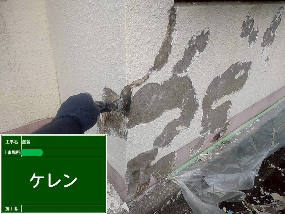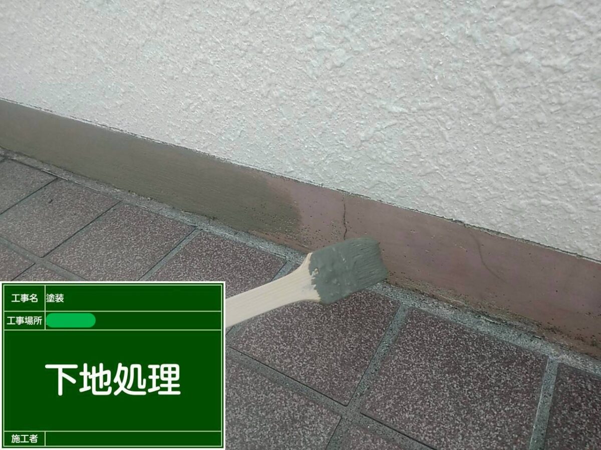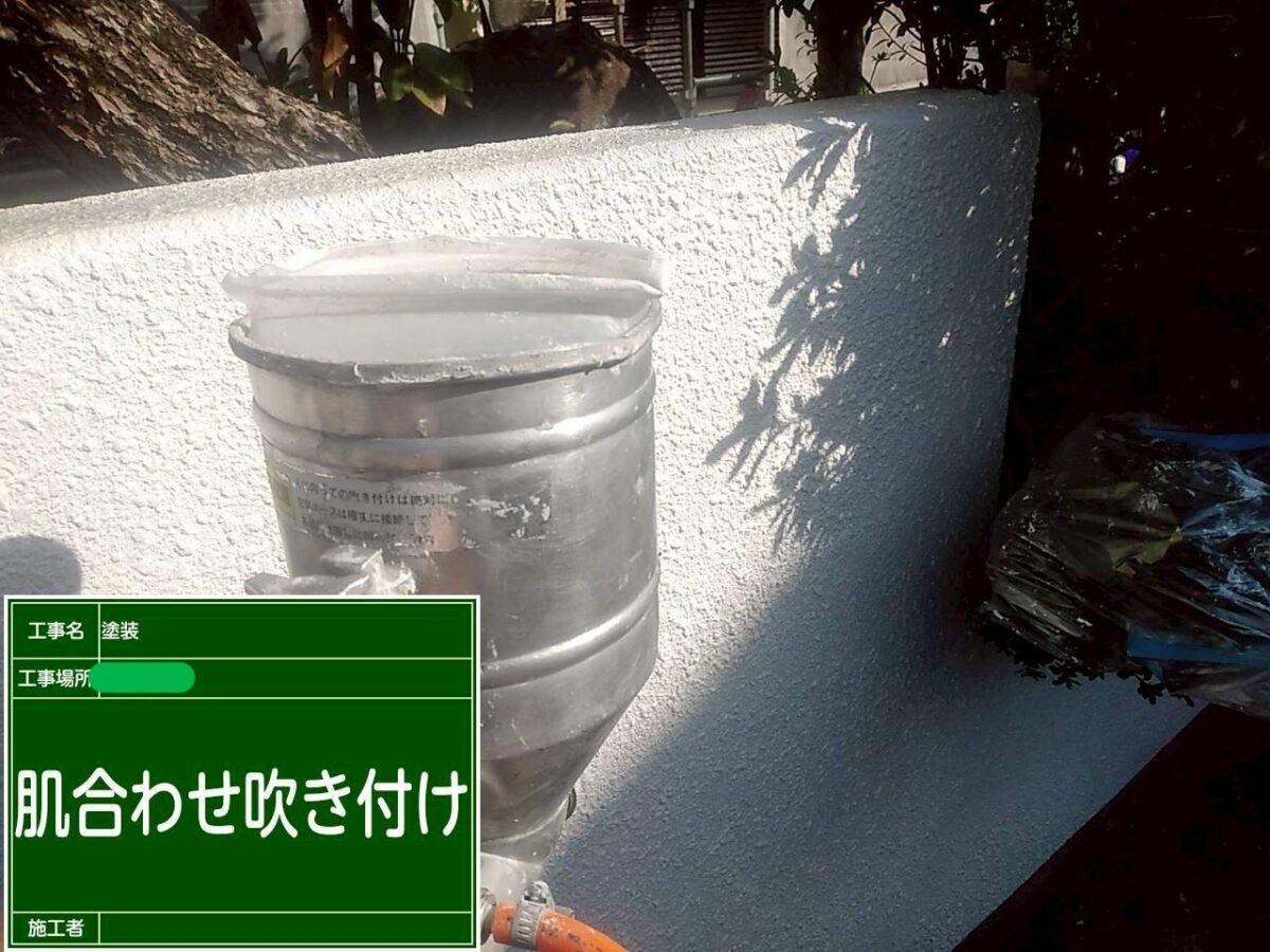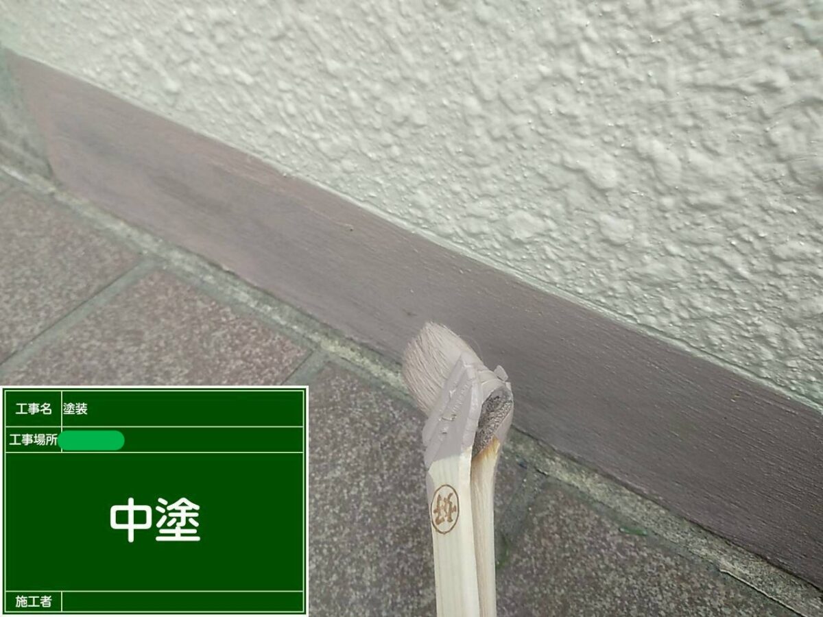 擁壁の塗装になります。既存の擁壁は塗装前の調査の段階で塗膜が浮いている箇所が多くある状態でした。まずは擁壁全体の高圧洗浄をおこない、浮いている塗膜の撤去作業になります。塗膜の浮きは、擁壁全体にありましたので、打診棒で擁壁の調査をおこないながら、撤去作業をおこないました。続きまして、下地の補修作業になりますが、今回は、補修箇所が多く、左官屋さんに依頼し、モルタルで下地補修をお願いしました。下塗りの塗装をおこない、補修箇所をそのまま塗装してしまうと、補修跡が目立ってしまいますので、肌合わせの吹付作業をおこない、中塗り塗装・上塗り塗装で擁壁の塗装を仕上げました。下の巾木部分も劣化しクラック(ひび割れ)が多くありましたので、巾木全体をカチオン樹脂モルタルで下地処理をおこない、浸透性シーラーを塗装後に、中塗り・上塗りの塗装で仕上げました。色は既存色に合わせて現場調色し色を作りました。