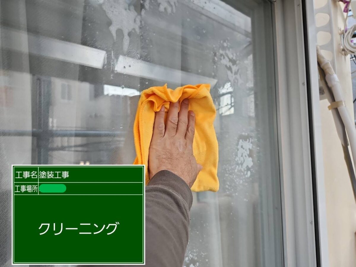外壁塗装で壁が綺麗になり、付帯物といわれる部分(樋や庇・雨戸)などが綺麗になると、意外と窓の汚れが目立つ場合があります。丸太工房では、窓のクリーニング作業をサービス工事として、どの施工現場でも実施しております。施主様からは、普段は拭き掃除が出来ない、高い場所にある外窓が綺麗になり、大変喜んで頂いております。他にも塗装以外で、お困りごとがありましたら、お気軽にご相談ください。出来る限り対応させていただきます。