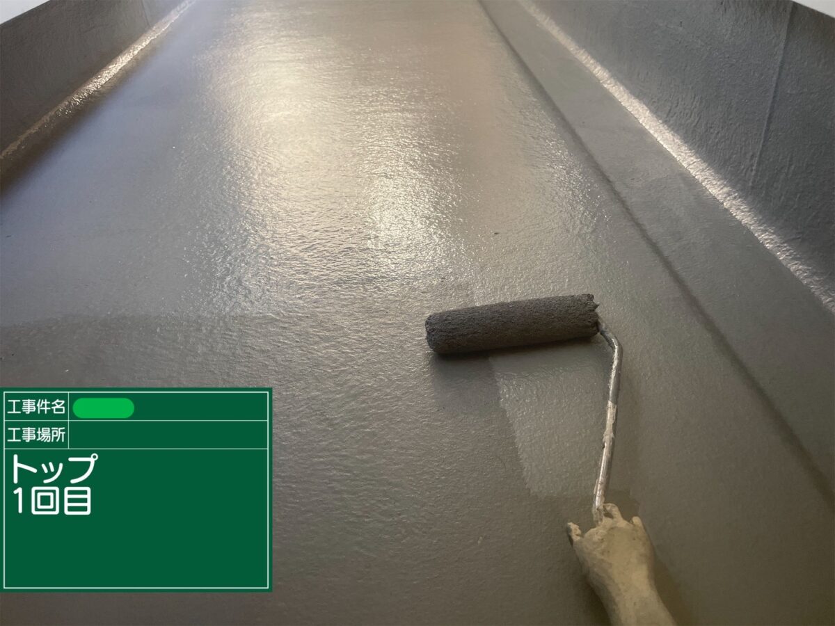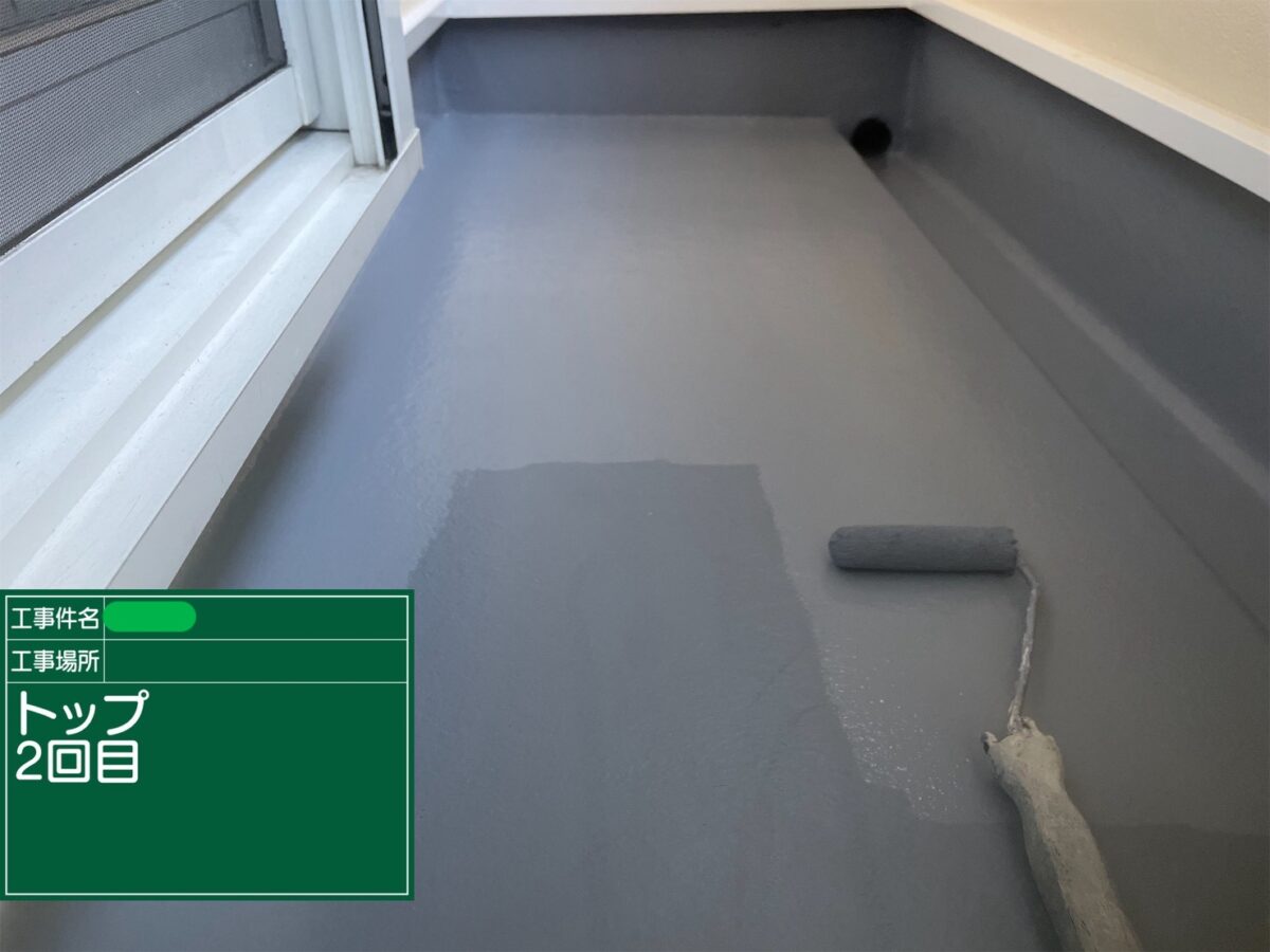 バルコニー床の塗装になります。既存の床材はFRPになり、今回の施工では、トップコートの施工になります。現状、色褪せや大きな劣化などもなく、高圧洗浄後はそのまま塗装可能な状態でした。今回、バルコニー床で使用の塗料は、カナエ化学工業の水性FRPトップになります。水性FRPトップは、通常必要となる研磨作業やアセトン拭きが不要で、特別なポリエステルとアクリルをハイブリットさせた特殊樹脂が配合されており、FRP基材への密着性や耐久性に優れている材料になります。今回の施工では、骨材入りの材料を使用しておりますので、施工後に滑りにくい仕上がりになっております。