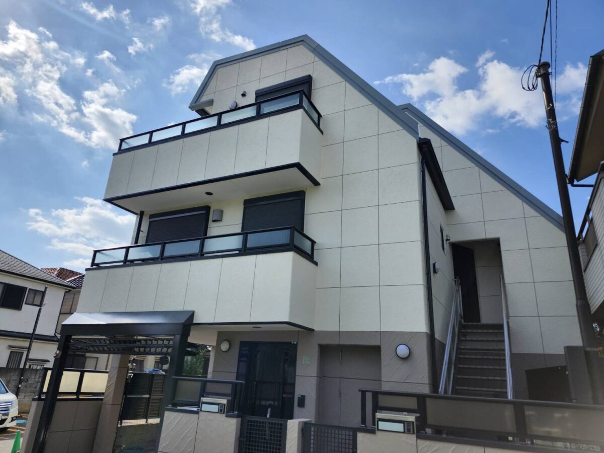 今回、外壁塗装は色分け塗装をおこないました。使用塗料は、アステックペイントの超低汚染リファイン1000MF-IR(フッ素塗料)になります。色は、ベイジュとブロークンホワイトになります。超低汚染リファイン1000MF-IRは、塗膜に無機成分を配合することで、ガラスのように緻密で強靭な構造を形成します。これにより、微細な排気ガスやホコリなどの汚染物質が塗膜の隙間に入り込むのを防ぎます。さらに、親水性(水になじみやすい性質)が高いため、万が一汚れが付着しても、雨水が汚れと塗膜の間に入り込み、汚れを洗い流してくれます。これにより、長期間にわたって建物の美観を保つことができます。
