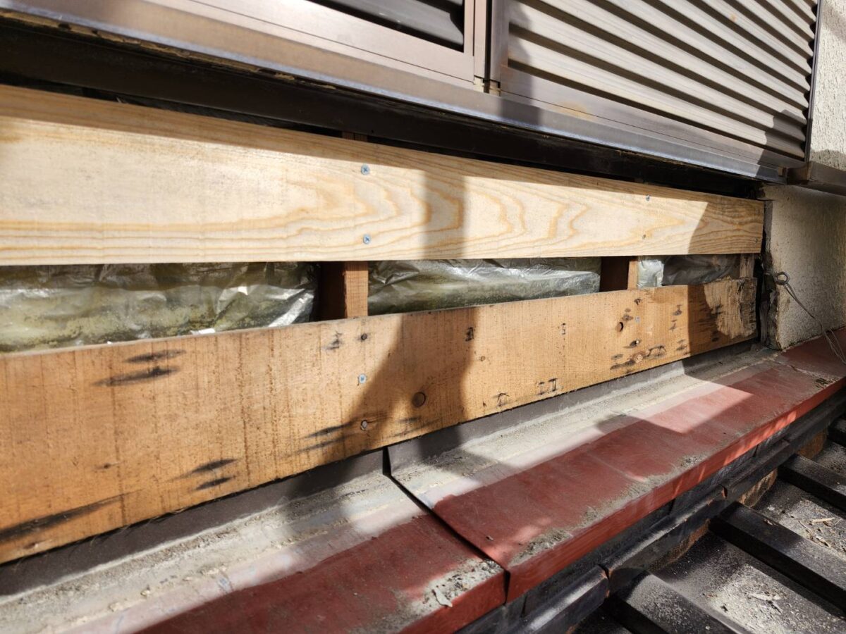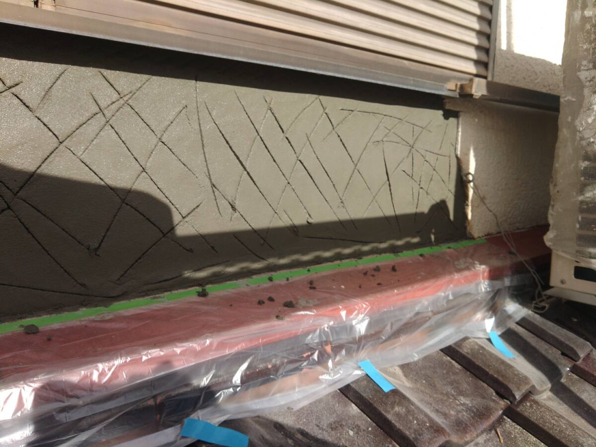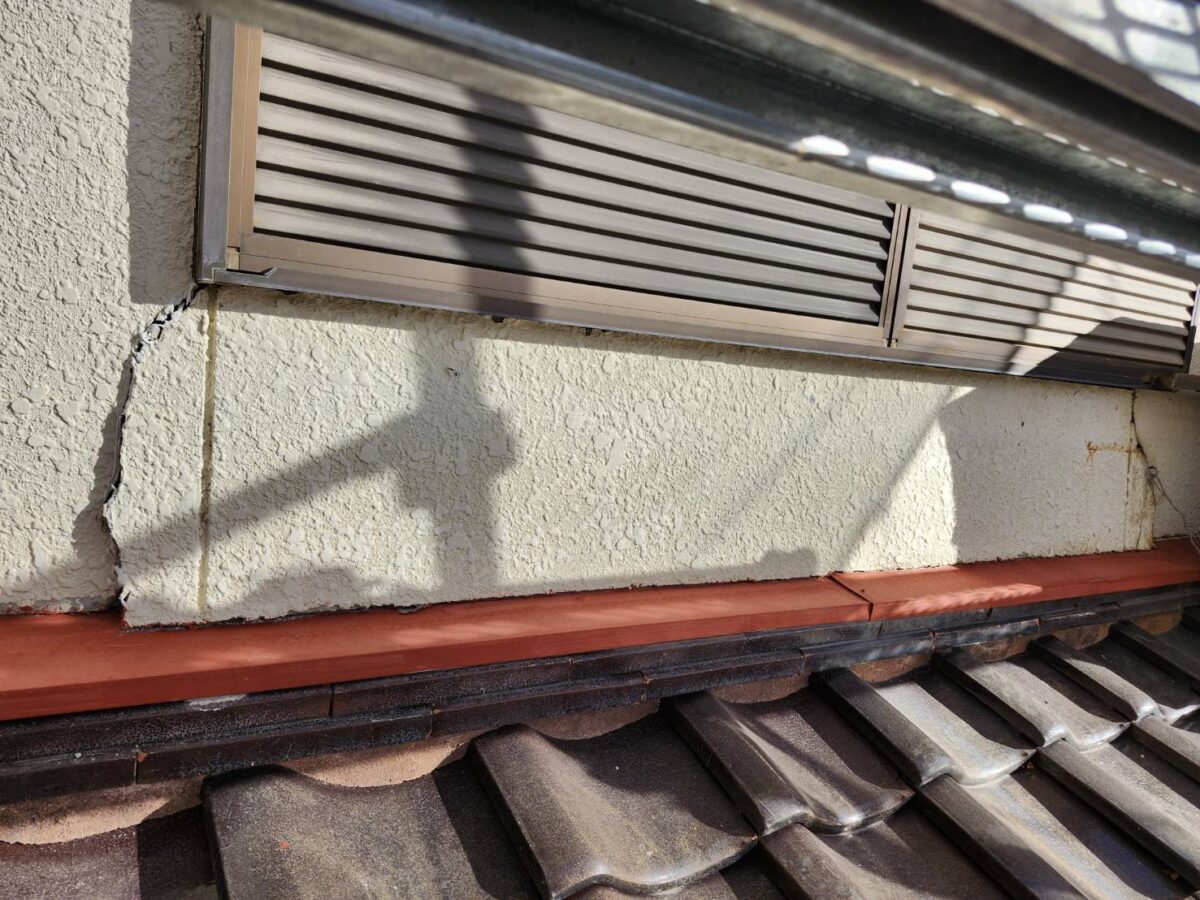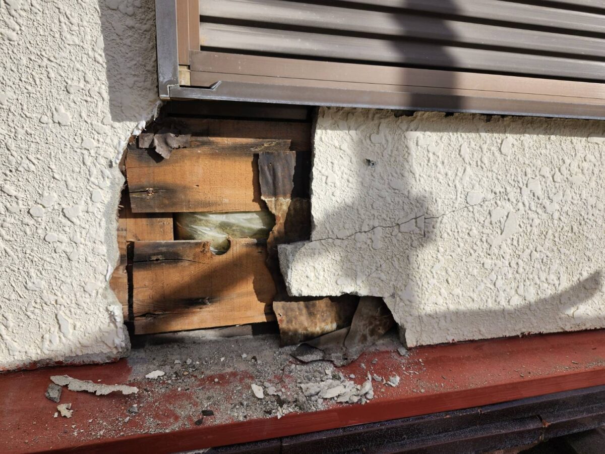 外壁の補修箇所になります。ご覧のように水切りと雨戸の間の外壁が大きくひび割れしており、外壁が、今にも落ちそうな状態になっていました。現場現調時にかなり危険な状態でしたので、ビスで仮固定させていただきました。外壁の補修ですが、まずは仮固定しているビスを取り外し、既存の外壁を少しづつ斫って取り除きます。中のバラ板の状態を確認しましたが、やはり水が回っており、バラ板は腐っている状態でしたので、新しいバラ板に取り換えました。続きまして、防水シート貼り、ラス網を取り付けました。ラス網を取り付けることで、壁の補強とひび割れ防止になり、建物の耐久性を高めるために、とても重要な役割があります。最終のモルタル仕上げですが、厚みを付ける必要がありましたので、2日間に分けてモルタルを塗り付けました。モルタルで補修した部分は凹凸模様がありませんので、吹付で肌合わせの作業をおこない、まわりの柄と合わせる予定にしております。