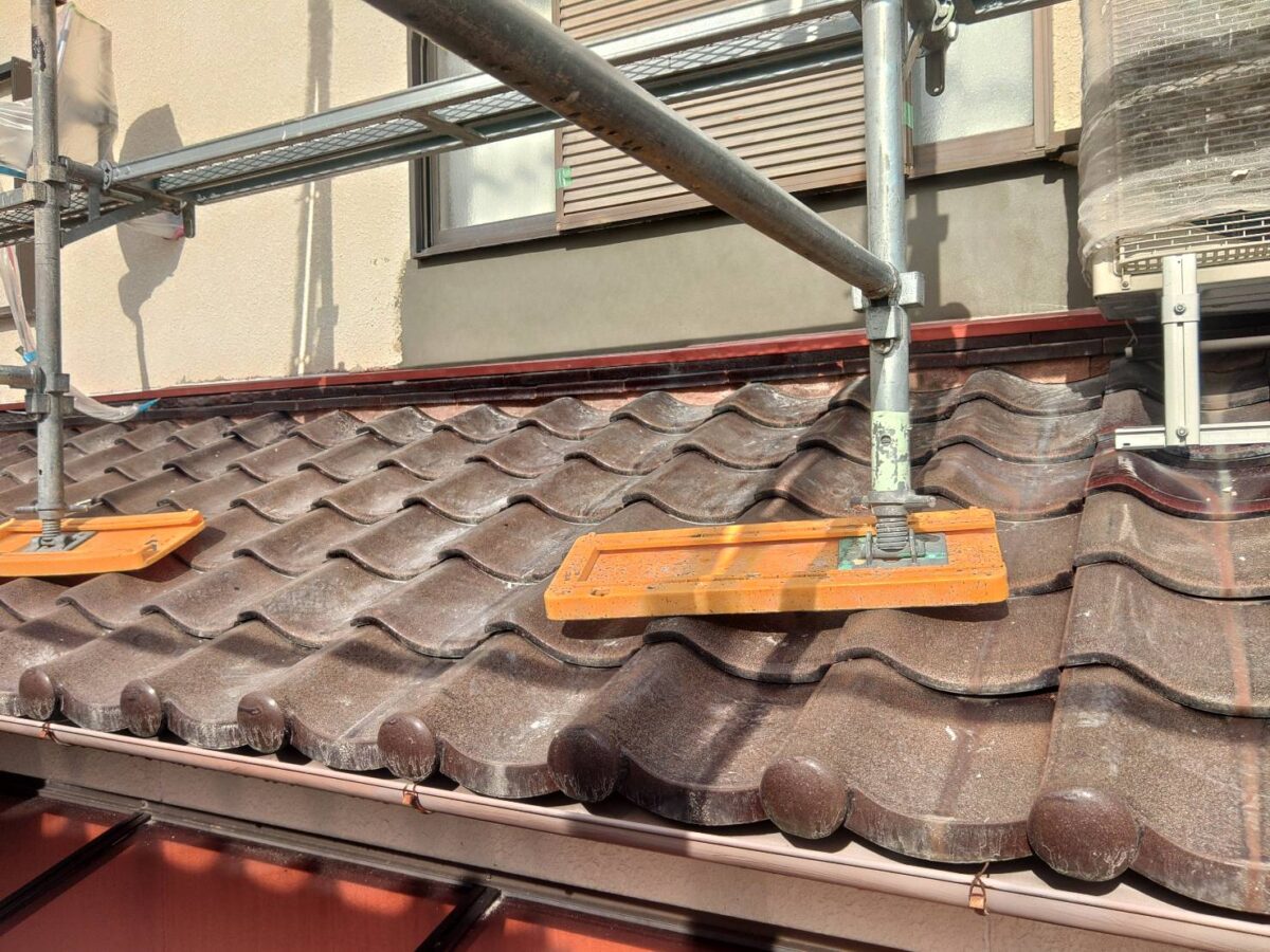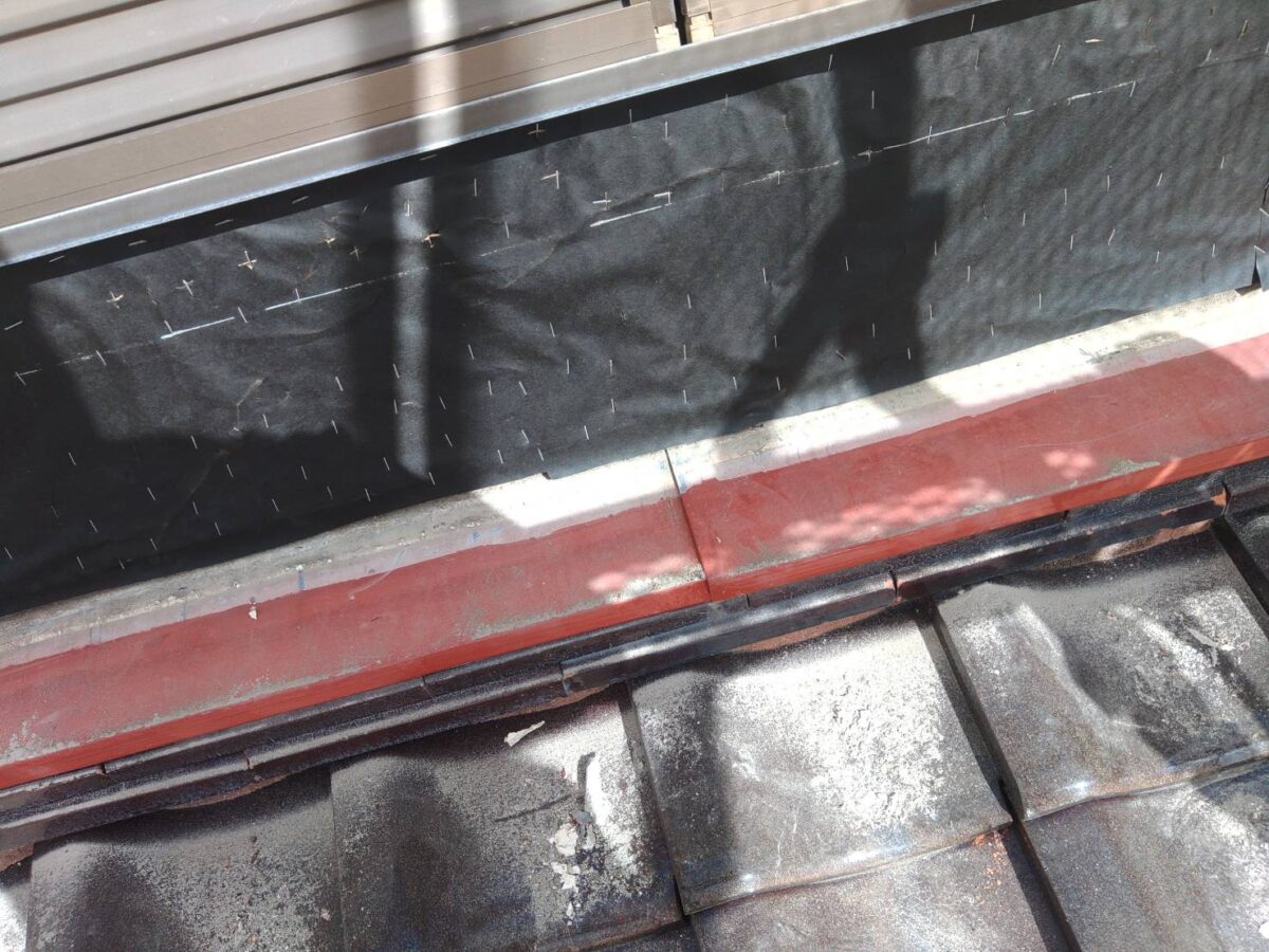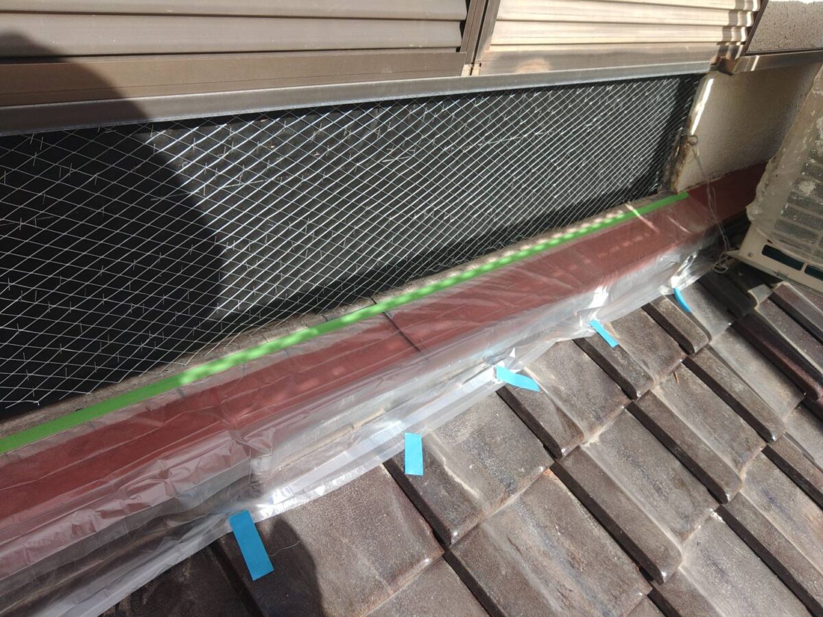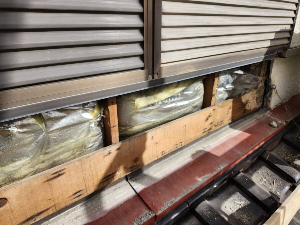 外壁の補修箇所になります。ご覧のように水切りと雨戸の間の外壁が大きくひび割れしており、外壁が、今にも落ちそうな状態になっていました。現場現調時にかなり危険な状態でしたので、ビスで仮固定させていただきました。外壁の補修ですが、まずは仮固定しているビスを取り外し、既存の外壁を少しづつ斫って取り除きます。中のバラ板の状態を確認しましたが、やはり水が回っており、バラ板は腐っている状態でしたので、新しいバラ板に取り換えました。続きまして、防水シート貼り、ラス網を取り付けました。ラス網を取り付けることで、壁の補強とひび割れ防止になり、建物の耐久性を高めるために、とても重要な役割があります。最終のモルタル仕上げですが、厚みを付ける必要がありましたので、2日間に分けてモルタルを塗り付けました。モルタルで補修した部分は凹凸模様がありませんので、吹付で肌合わせの作業をおこない、まわりの柄と合わせる予定にしております。