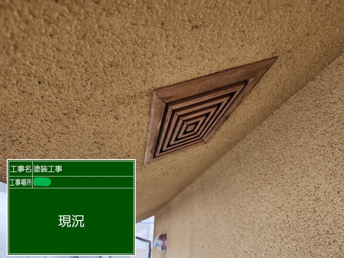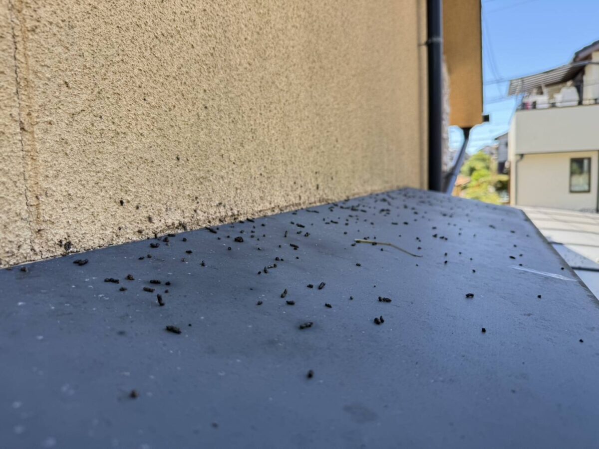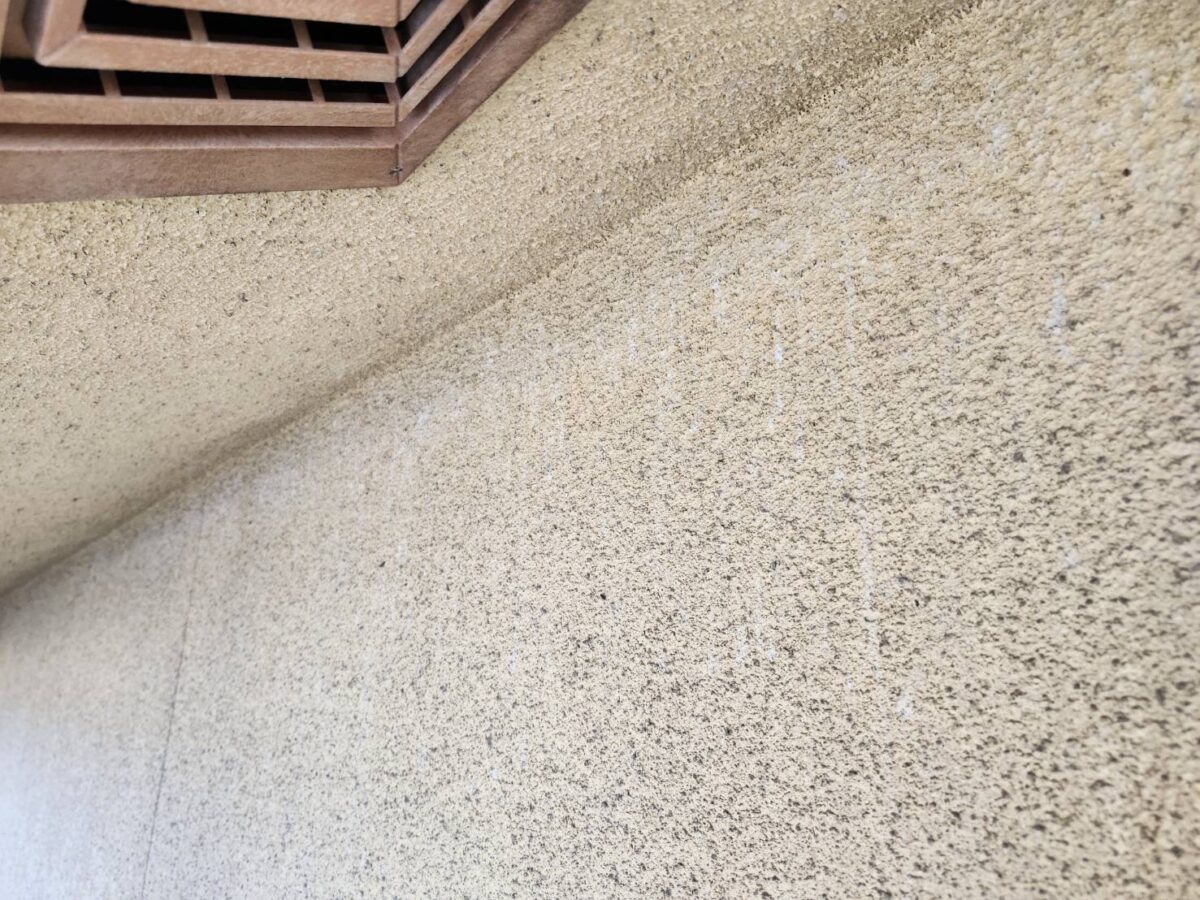 現場現調時に、換気ガラリ付近の外壁が白く汚れているのが気になり、ハシゴで確認すると、コウモリの尿で白くなっおりました。下のカーポートの屋根にもコウモリの糞が多くありましたので、これは間違いなく、コウモリがいると判断し、その付近を調査しましたところ、換気ガラリの隙間からコウモリが出入りしているようでした。今回は、コウモリ対策として換気ガラリの交換をおこないました。