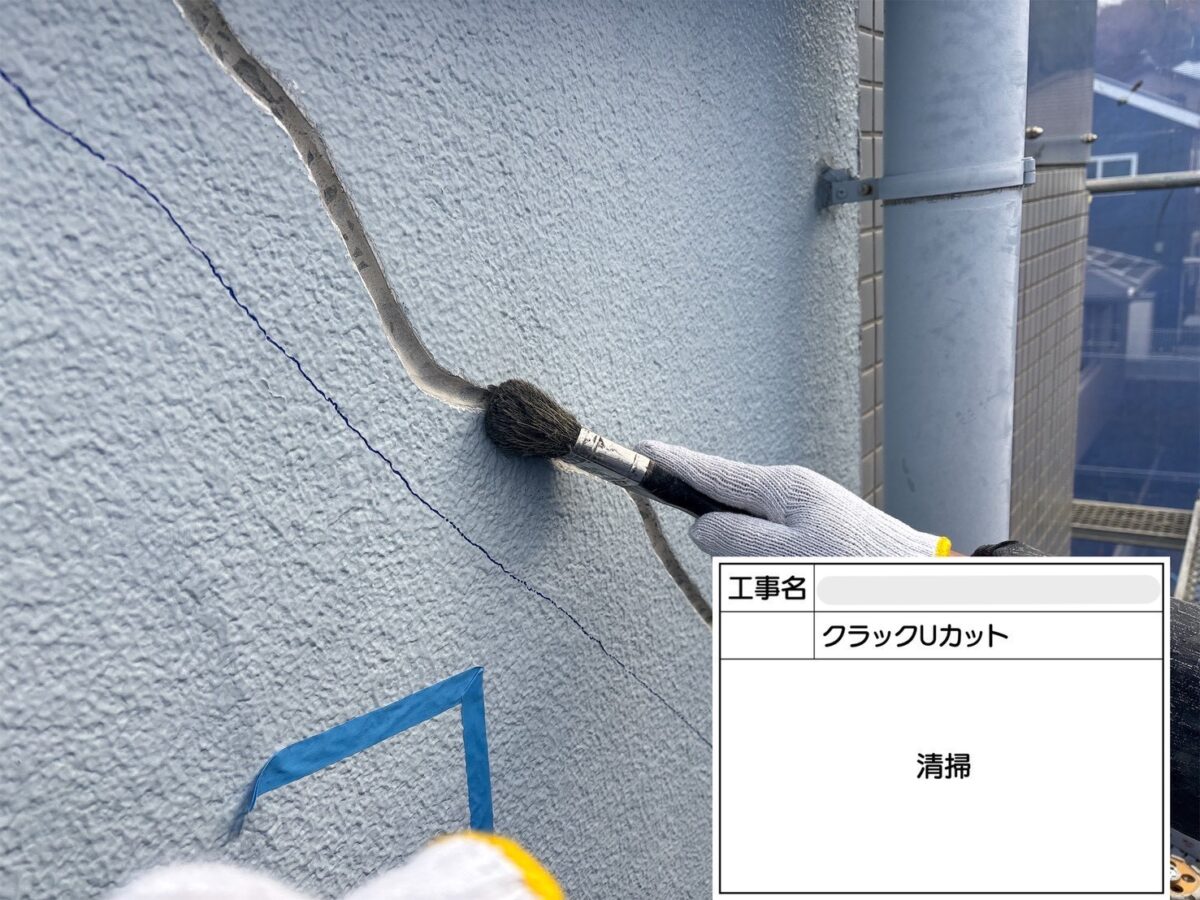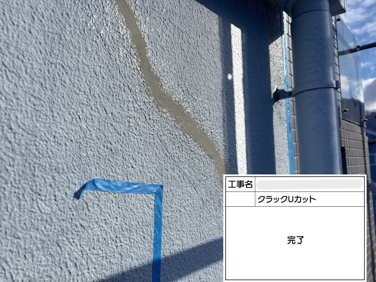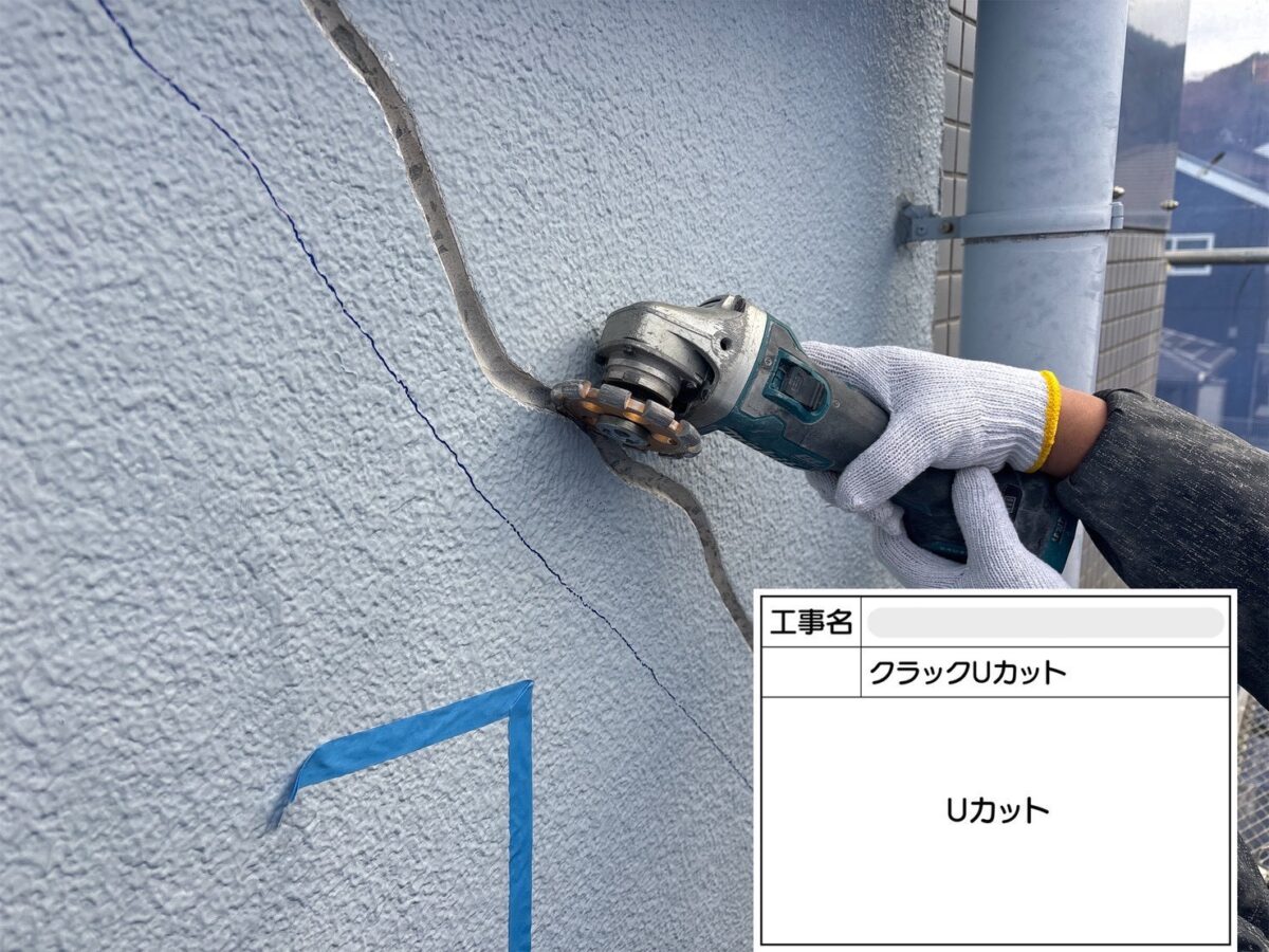 クラックのUカット補修になります。クラック(ひび割れ)をそのまま放置すると、そこから雨水や炭酸ガスが侵入し、建物の耐久性が低下したり、内部の鉄筋が腐食して爆裂や欠損につながる可能性があります。Uカット工法は、ひび割れをあえて広げることで、充填材がしっかりと密着し、同じ場所にひびが再発するのを防ぎます。また、防水性にも優れており、ひび割れの動きにも追従しやすい特徴があります。クラックUカットは、正式には、Uカットシーリング充填工法や、Uカットシールとも呼ばれております。