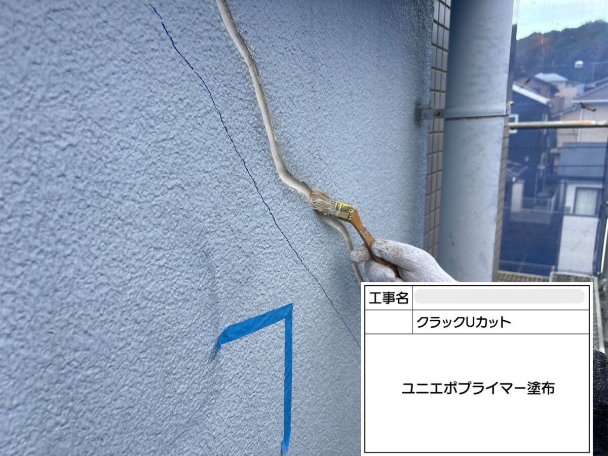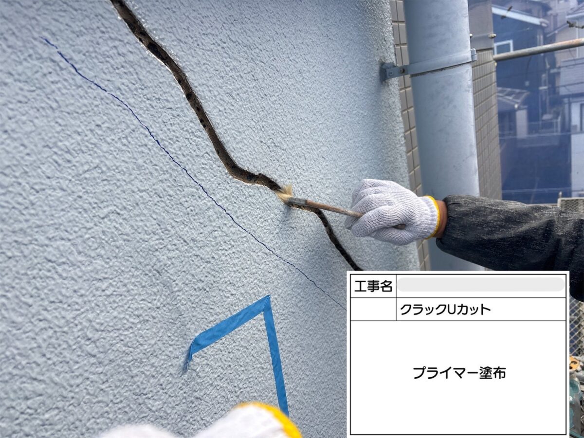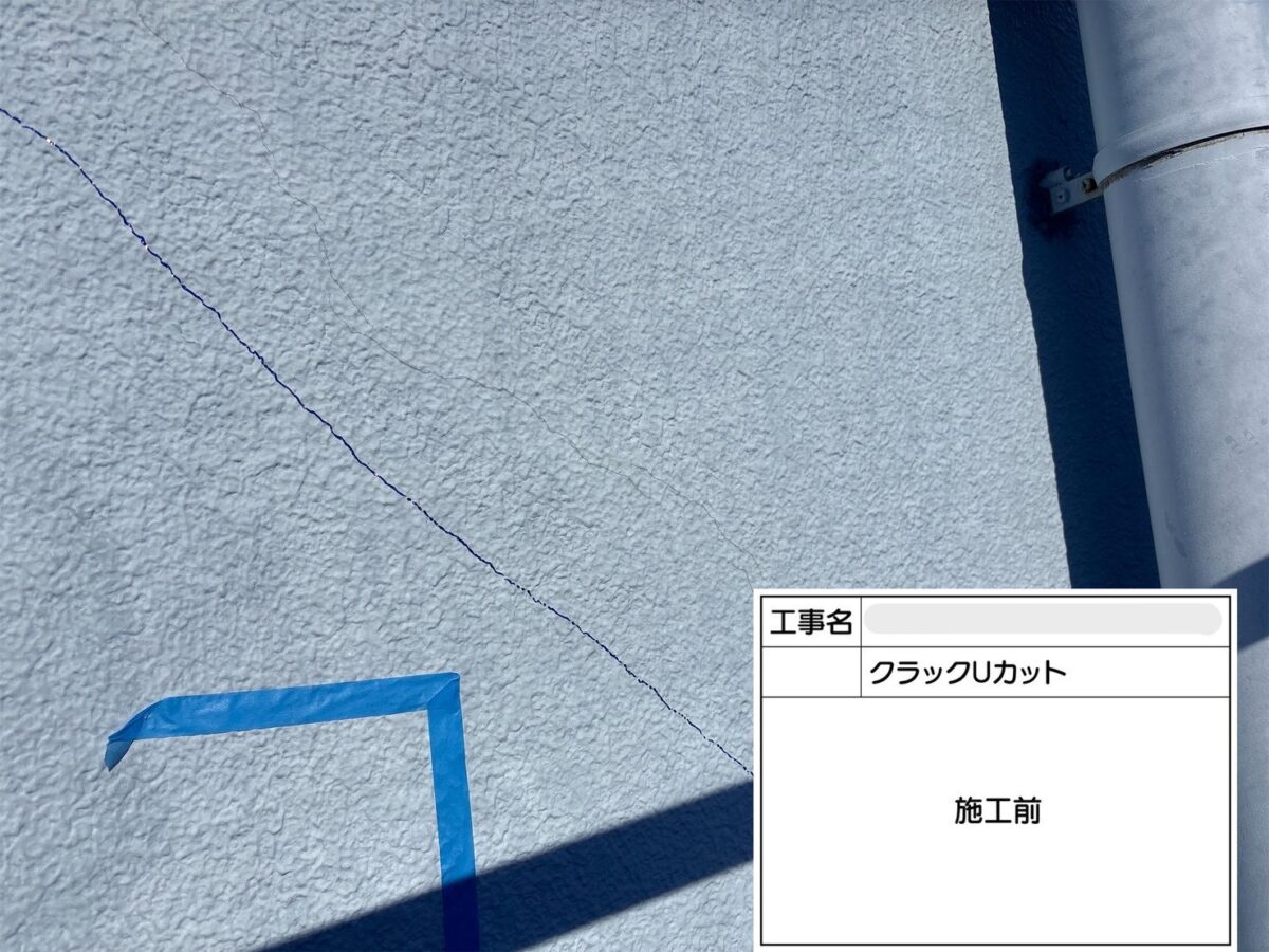 クラックのUカット補修になります。クラック(ひび割れ)をそのまま放置すると、そこから雨水や炭酸ガスが侵入し、建物の耐久性が低下したり、内部の鉄筋が腐食して爆裂や欠損につながる可能性があります。Uカット工法は、ひび割れをあえて広げることで、充填材がしっかりと密着し、同じ場所にひびが再発するのを防ぎます。また、防水性にも優れており、ひび割れの動きにも追従しやすい特徴があります。クラックUカットは、正式には、Uカットシーリング充填工法や、Uカットシールとも呼ばれております。