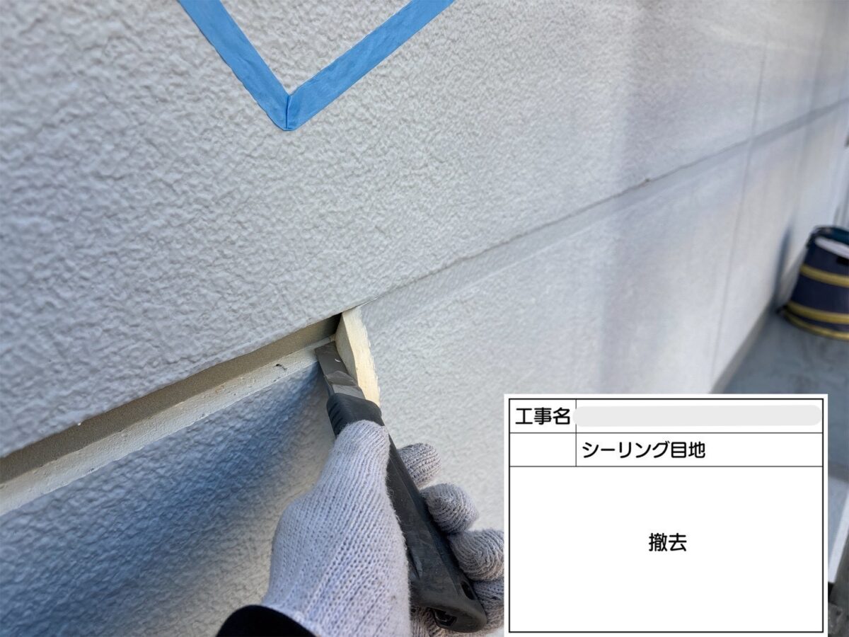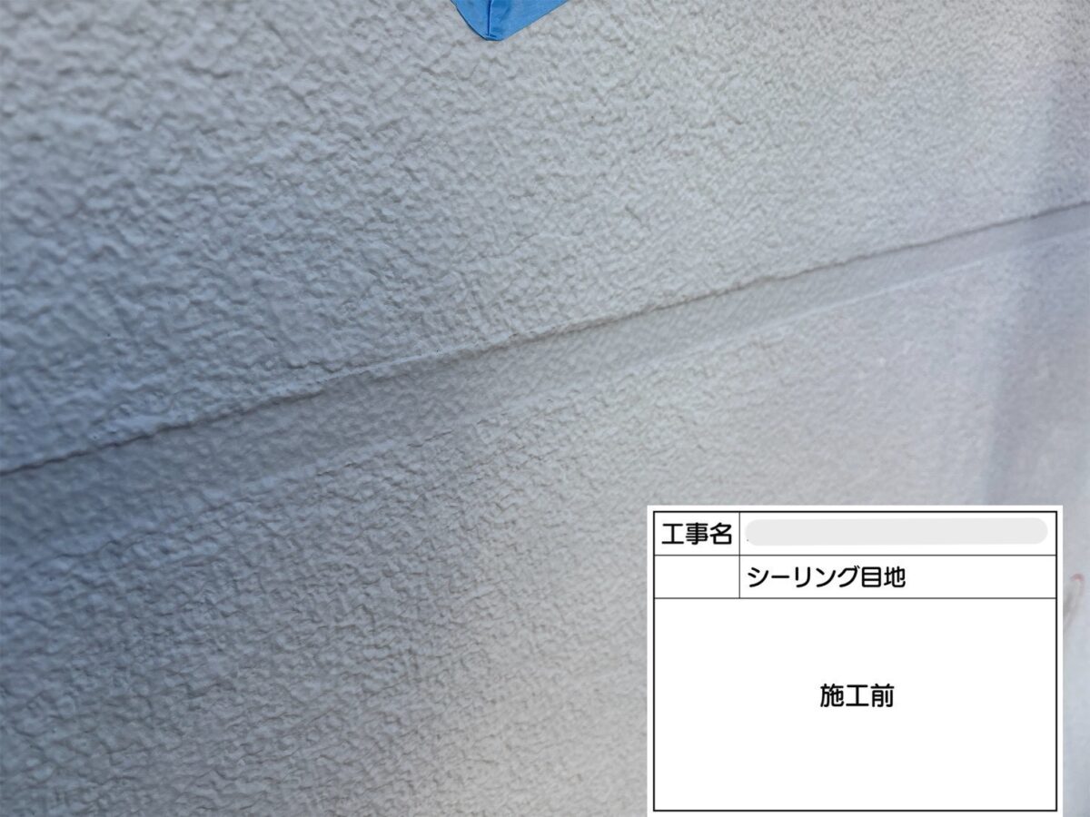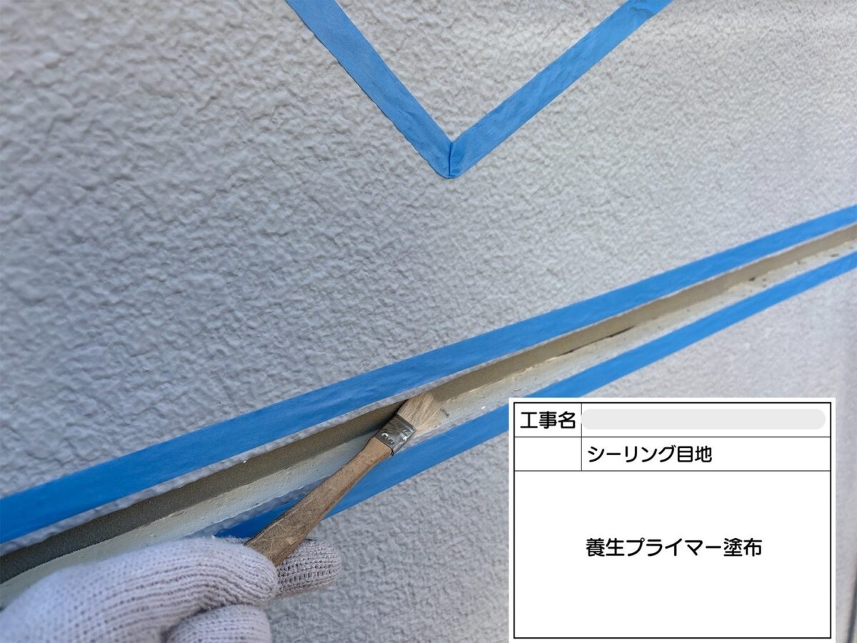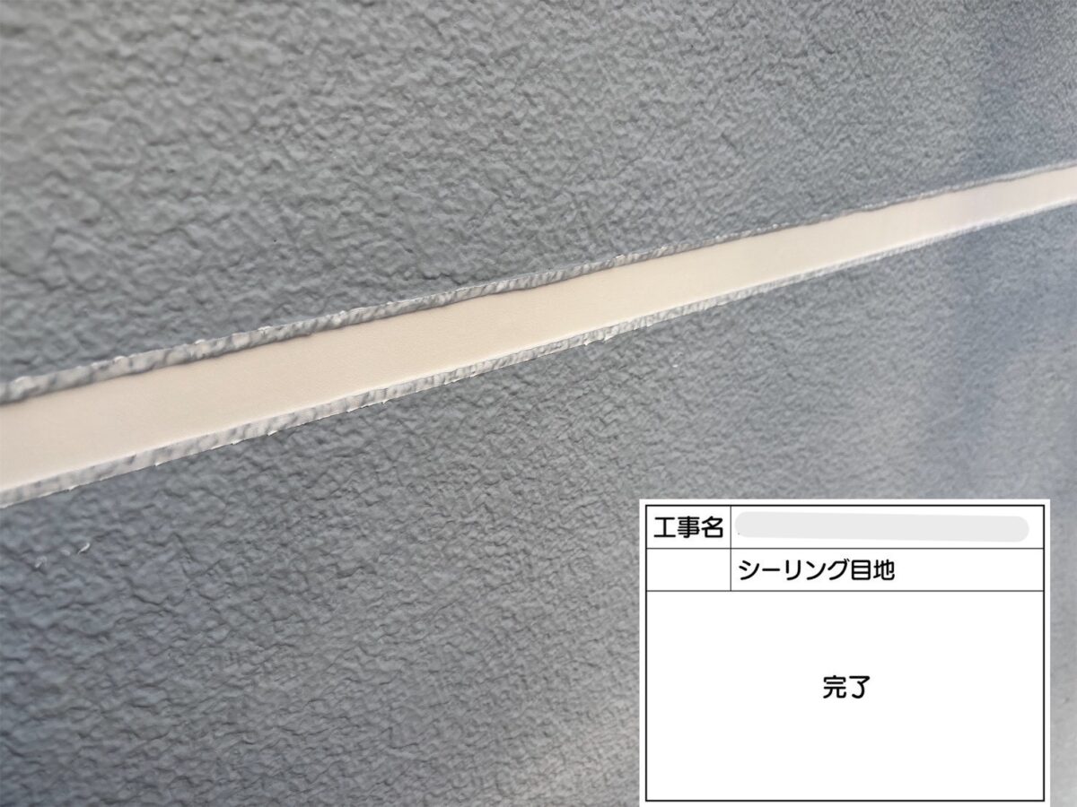 打ち継ぎ目地のシーリングの打ち換え工事になります。まずは既存のシーリング材の撤去をおこないます。撤去後、清掃をおこない、プライマーを塗布します。プライマーを塗布する理由は、建材とシーリング材の密着を高め、シーリング材が剥がれるのを防ぐための下塗り材になります。プライマーには密着性の向上だけでなく、建材からシーリング材への浸出物の移動を防いだり、シーリング材から下地への可塑剤などの移動を防ぐ役割もあります。続きましてシーリング材の充填作業をおこない、ヘラで余分なシーリング材を取り除き、養生テープを剥がしシーリングの打ち換え工事が完了となります。