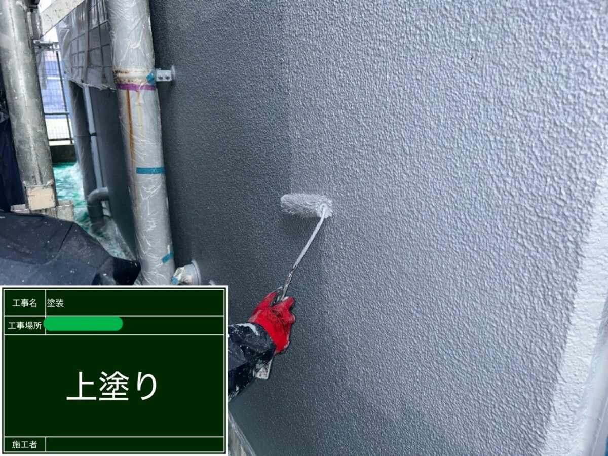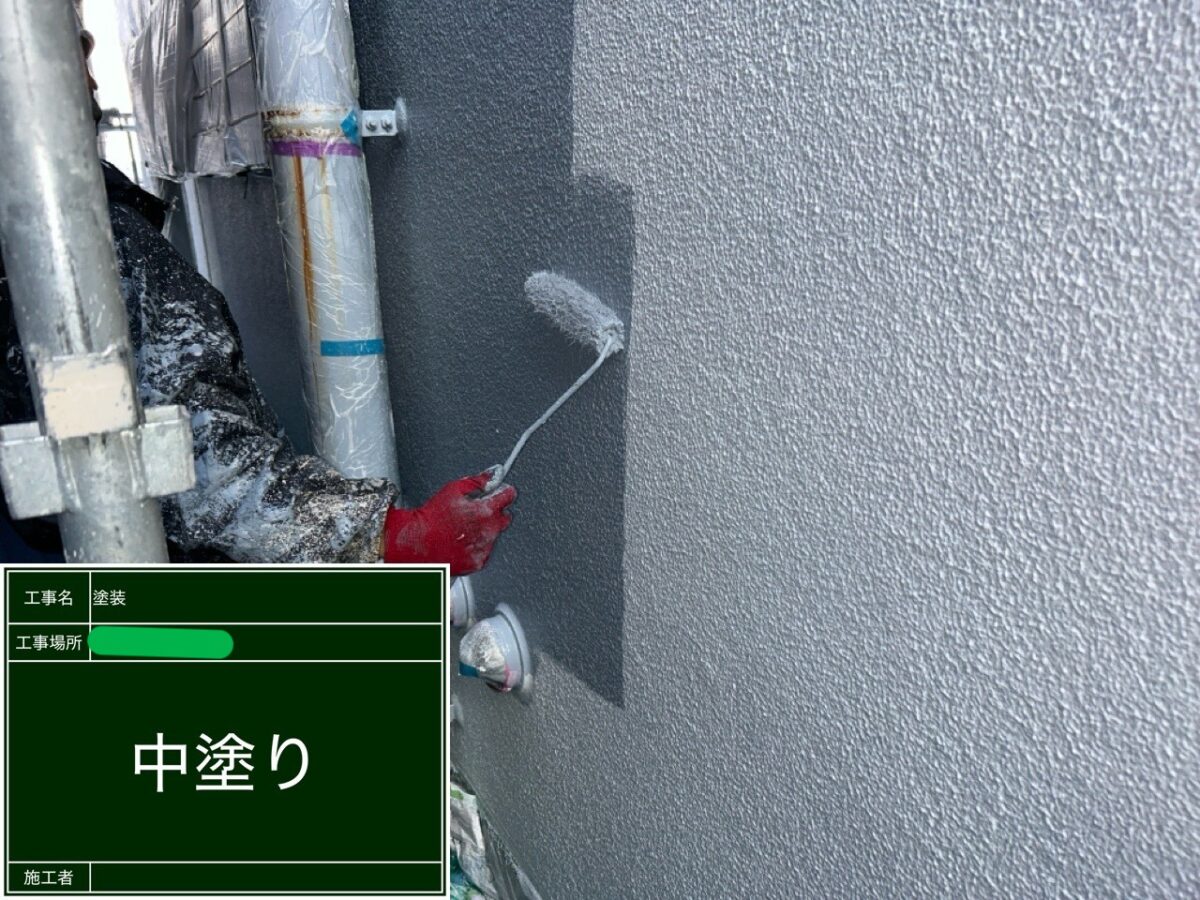 中塗りから上塗りの塗装になります。使用塗料は、アステックペイントのスーパーラジカルシリコンGHを使用です。ラジカル制御型白色顔料になり、従来の塗料に使用されている酸化チタンの代わりに、ラジカルが発生しにくい特殊な白色顔料を使用しており、ラジカルが発生した場合でも、シールド層で封じ込めて劣化を防ぎ、塗膜内で発生したラジカルを捕捉するHALSを配合することで、ラジカルによる塗膜の劣化をさらに防ぎます。また、二重構造のアクリルシリコンを樹脂を採用しており、塗面に汚れがつきにくい低汚染、カビや藻の発生を防ぐ、防藻・防カビ性も備えていますので、建物の美観を長期間保つことができるシリコン塗料になります。耐候年数は12年から14年となっておりますので、おススメの外壁塗料となっております。