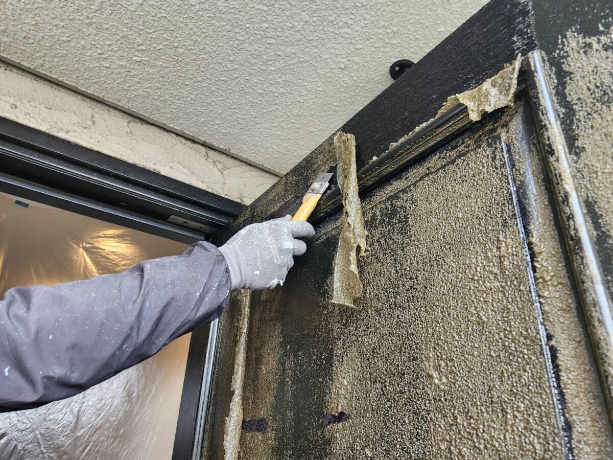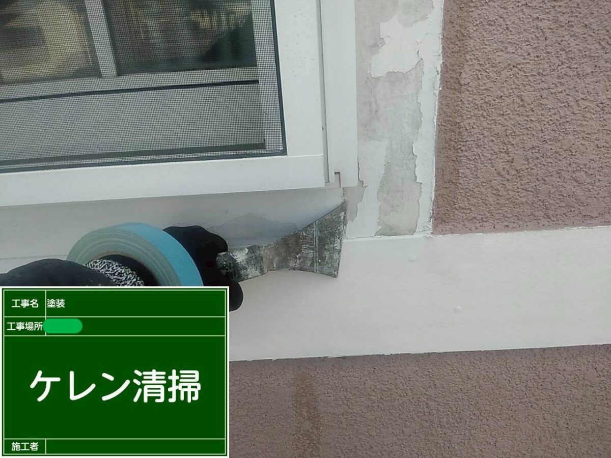 窓廻りはご覧のように塗膜が捲れておりましたので、そのまま洗浄作業をおこなうと、塗膜が飛散してしまいますので先にケレン作業で浮いている塗膜を取り除いてから、洗浄作業をおこないました。