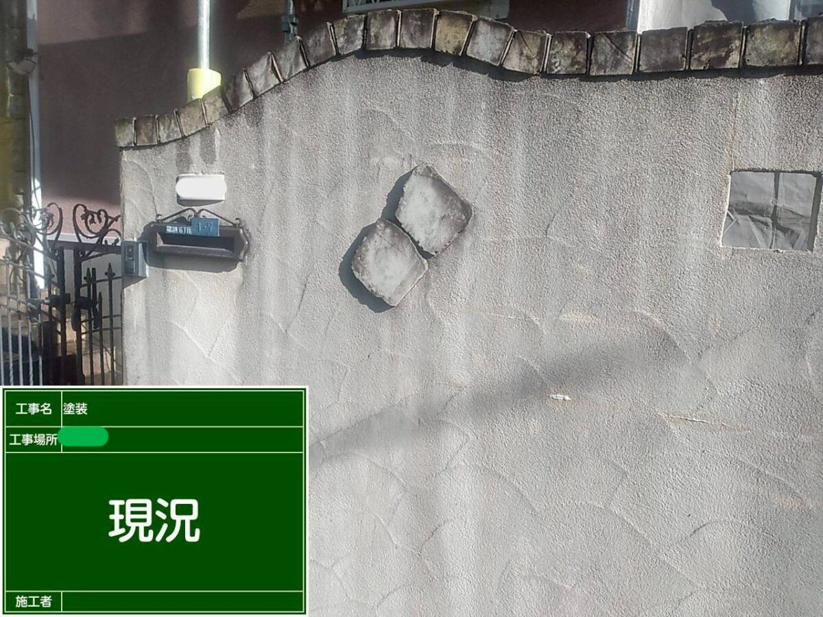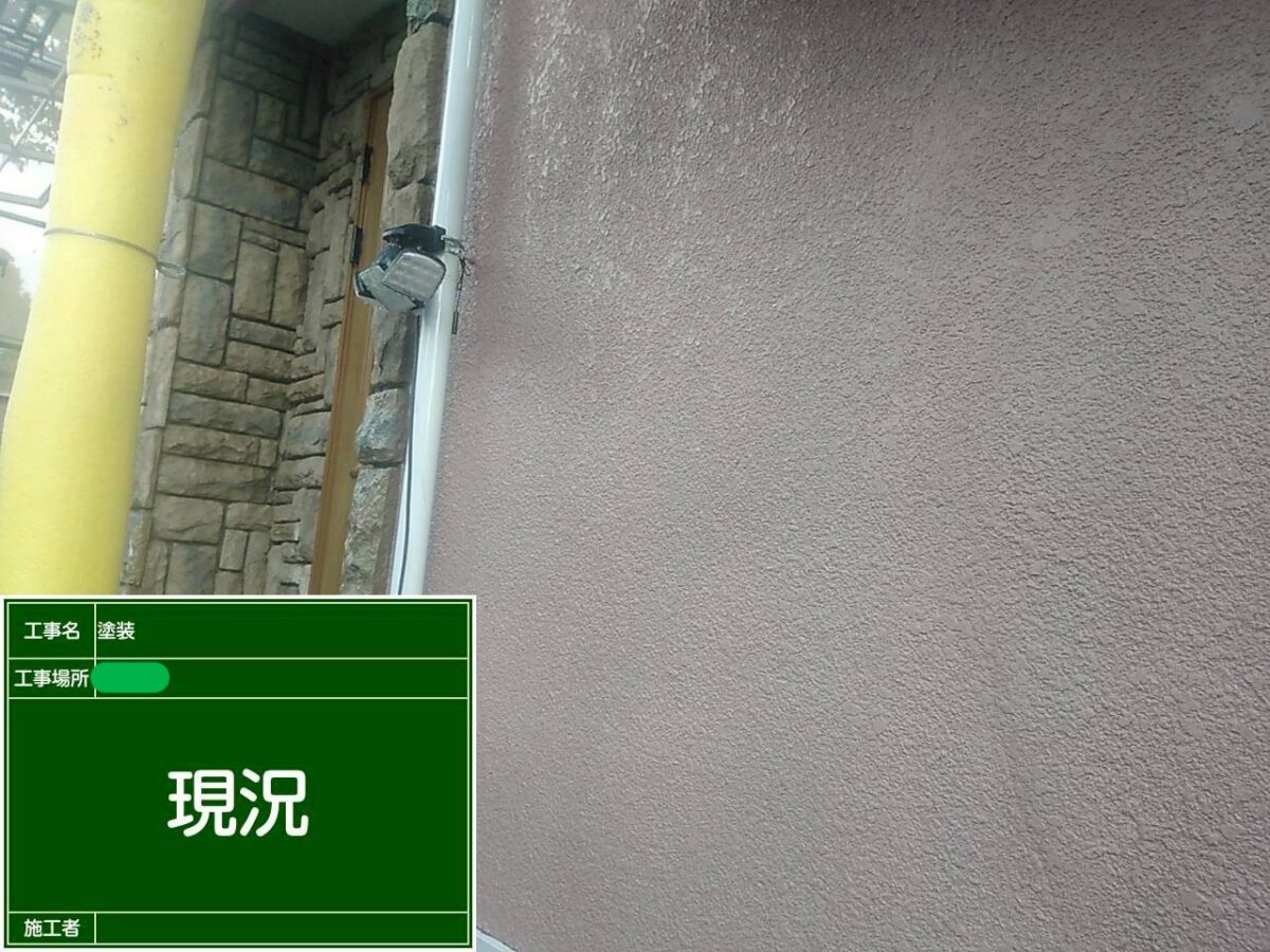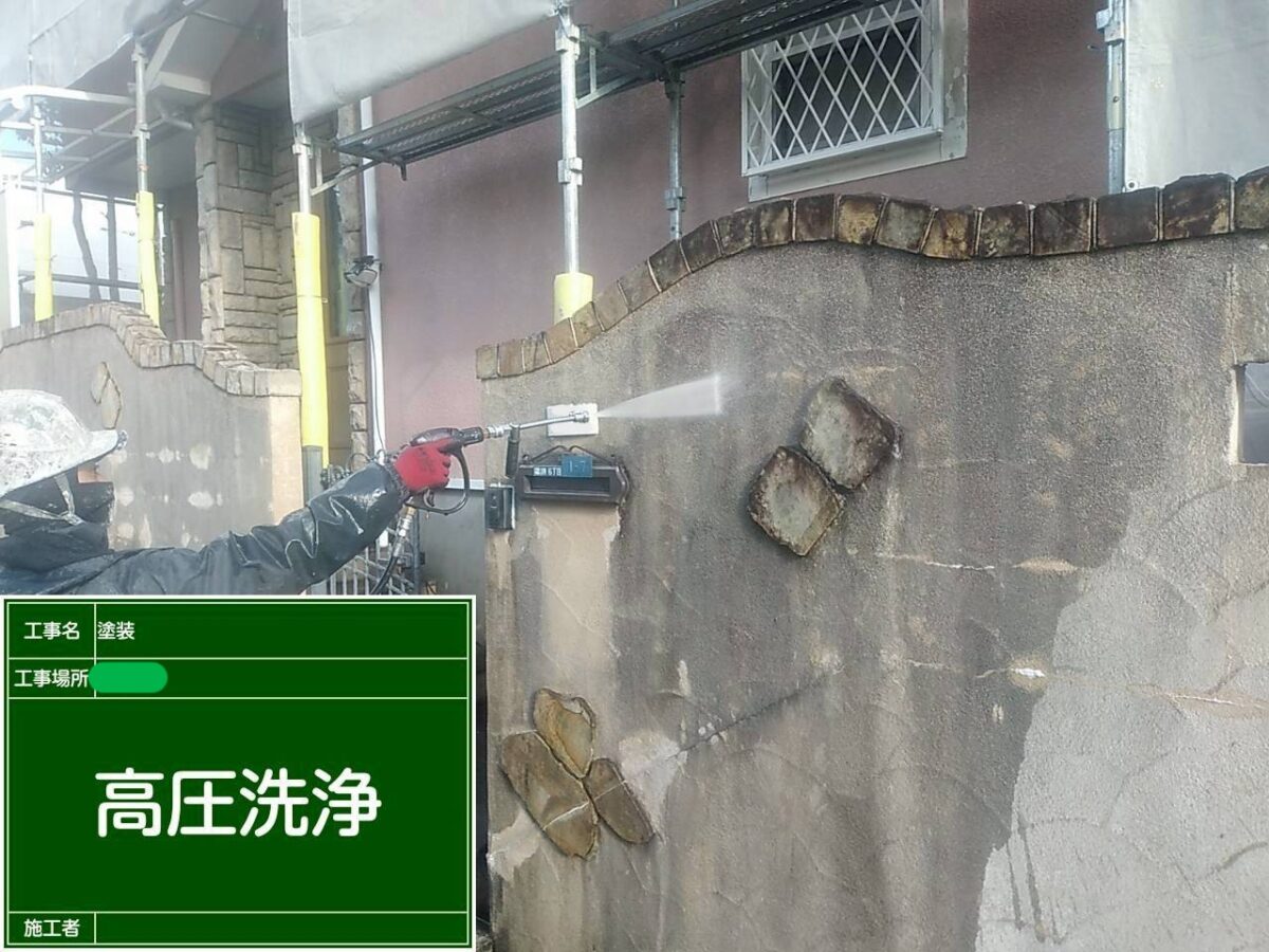 外壁の高圧洗浄になります。既存の外壁はモルタルの外壁になり、経年劣化による、色褪せが目立っている状態でした。また、以前、外壁塗装をした際の補修跡が目立っておりましたので、高圧洗浄後にどのような下地補修をおこなうか、現場で判断したいと考えております。そのまま塗装し、目立たなければ一番よいのですが・・・