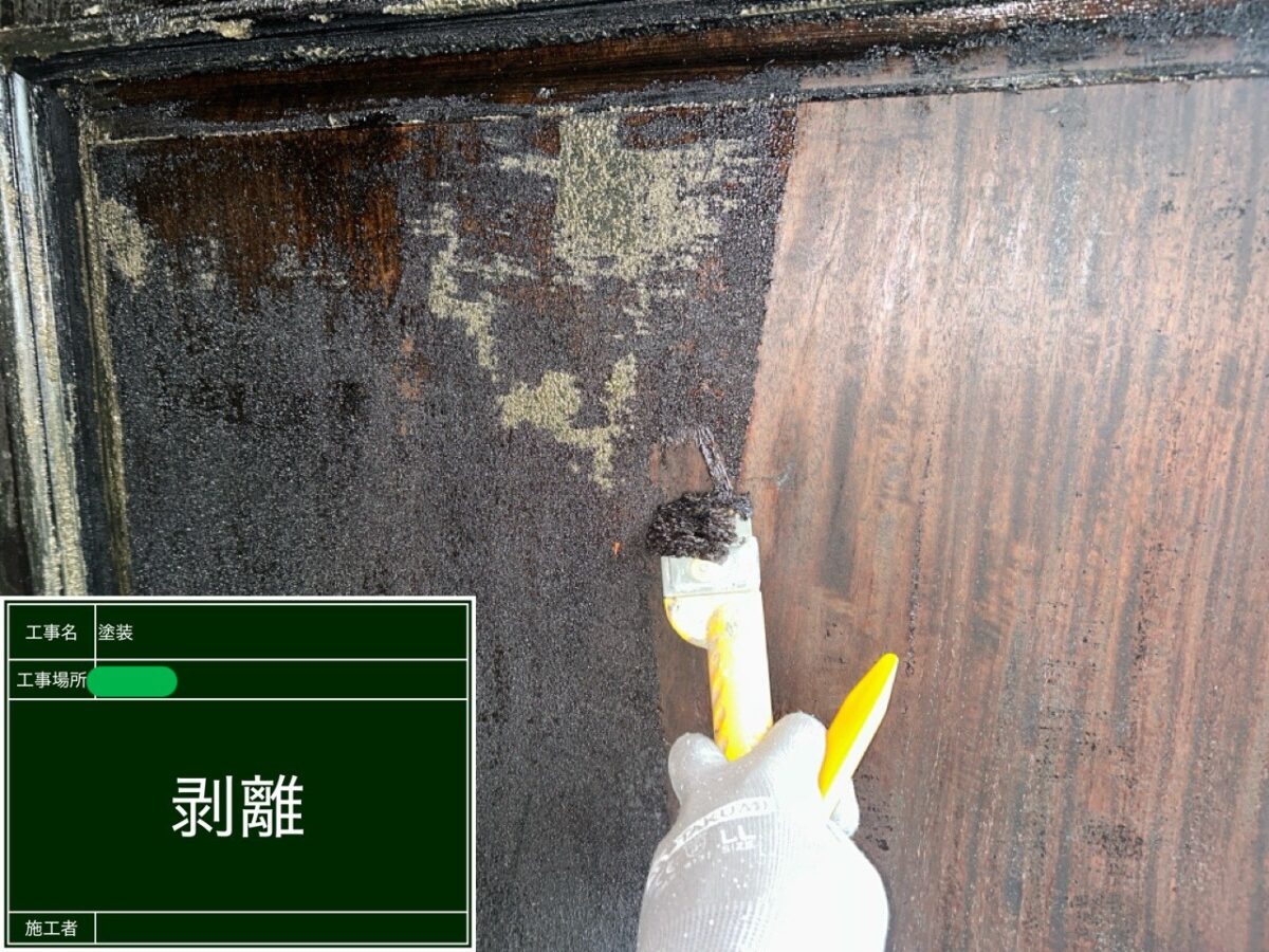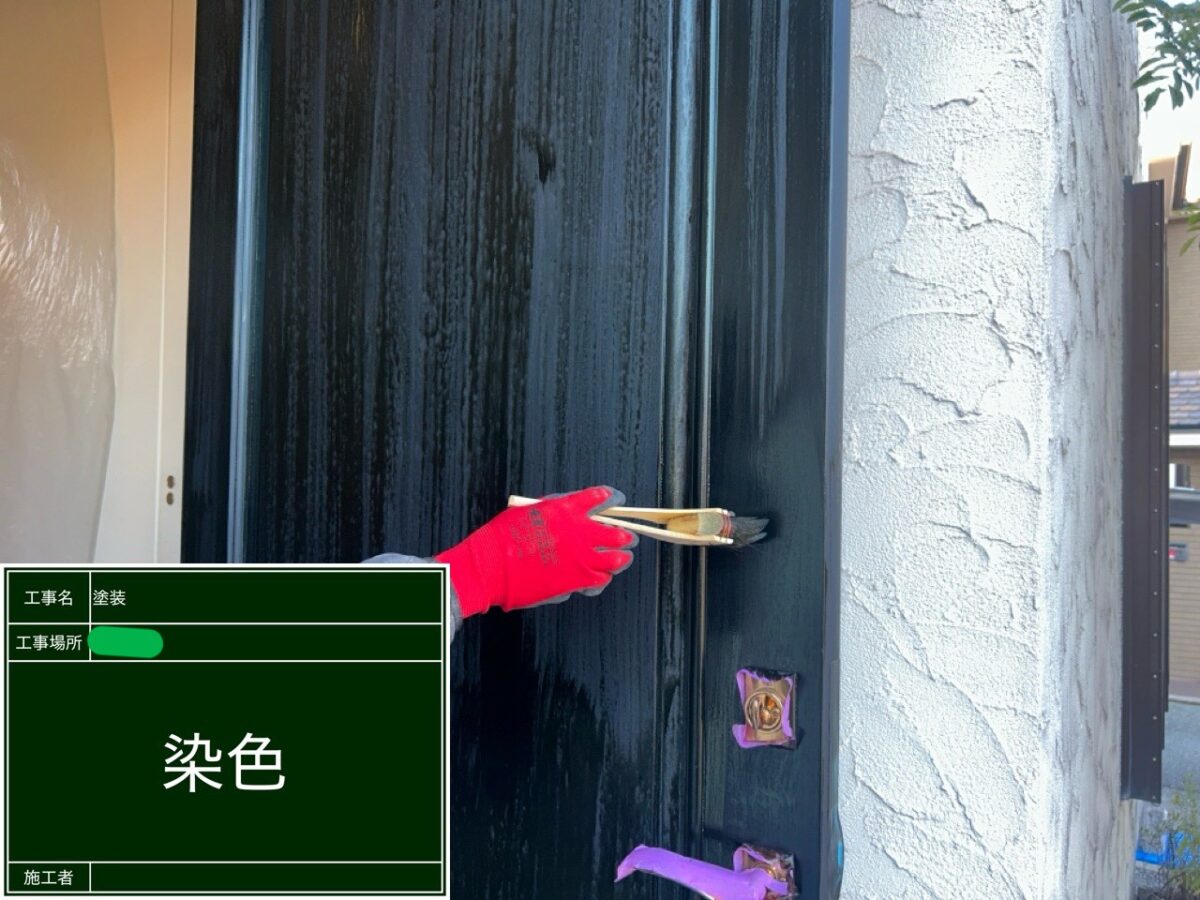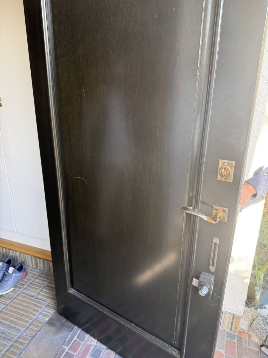 木製の玄関扉の塗装になります。既存の扉ですが、クリアが所々剥がれている箇所がありましたので、今回の施工では、既存のクリアー材を剥離作業で取り除き、染色塗装とクリア塗装で木製の玄関扉を仕上げます。まずは、剥離作業になりますが、扉全体に剥離剤を塗布します。しばらく放置する既存のクリアー材が浮き上がってきますので、スクレイパーで取り除きます。1回の剥離作業では、既存のクリアー材を取り除くことができませんでしたので、数回同じ剥離作業を繰り返し、既存のクリアー材を剥離します。剥離剤が残らないように綺麗に拭き取り作業をおこない、大阪塗料工業のWステインを使用し、染色作業となります。Wステインの特徴は、日光に強い水性顔料を使用しており、変色や退色がほとんどなく、透明度の高い顔料を使用しておりますので、木目が生かせ、刷毛ムラ、塗つぎムラになりにくい塗料になります。続きまして、中塗り塗装として、同じく大阪塗料工業のウルトラック・サンディングを吹付します。これは、上塗り塗料の密着性を高める役割があります。上塗りの仕上げの吹付には、同じウルトラックの木匠フラット50%消を使用し木製扉の塗装が完了です。塗装後はご覧の仕上がりになり、施主様に喜んでいただけました。