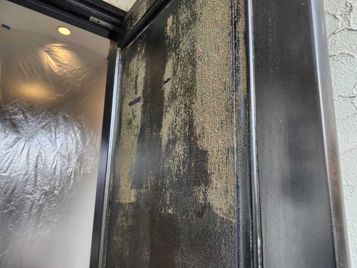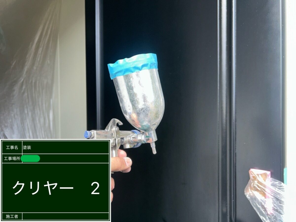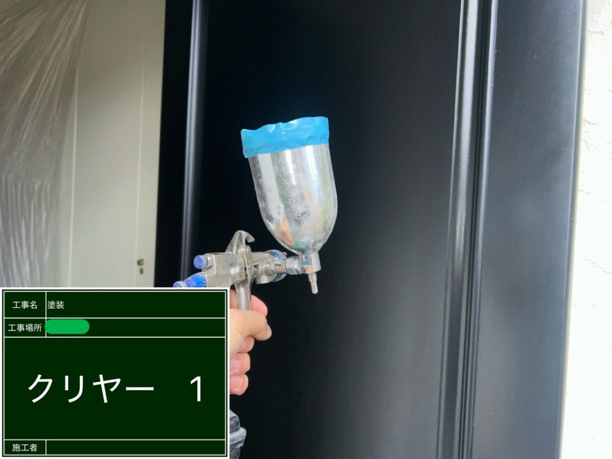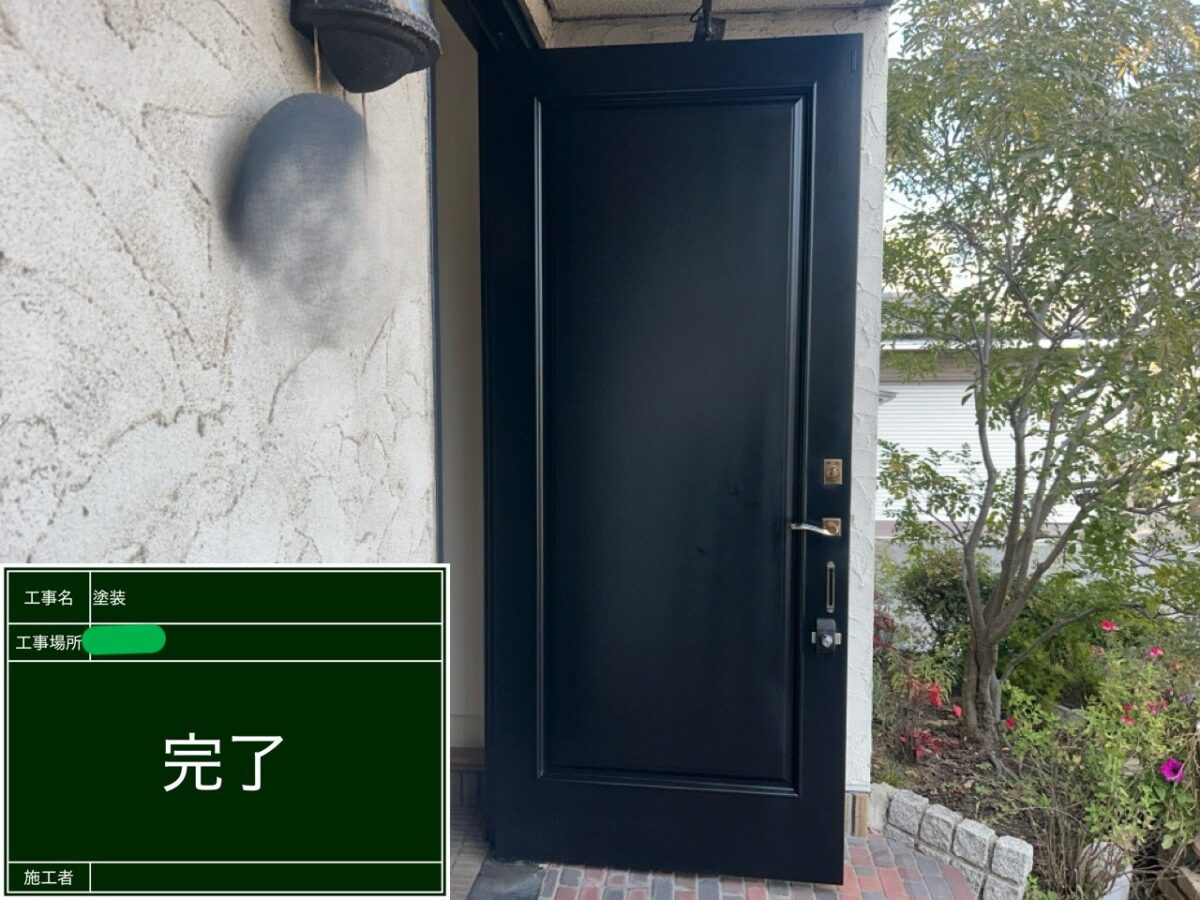 木製の玄関扉の塗装になります。既存の扉ですが、クリアが所々剥がれている箇所がありましたので、今回の施工では、既存のクリアー材を剥離作業で取り除き、染色塗装とクリア塗装で木製の玄関扉を仕上げます。まずは、剥離作業になりますが、扉全体に剥離剤を塗布します。しばらく放置する既存のクリアー材が浮き上がってきますので、スクレイパーで取り除きます。1回の剥離作業では、既存のクリアー材を取り除くことができませんでしたので、数回同じ剥離作業を繰り返し、既存のクリアー材を剥離します。剥離剤が残らないように綺麗に拭き取り作業をおこない、大阪塗料工業のWステインを使用し、染色作業となります。Wステインの特徴は、日光に強い水性顔料を使用しており、変色や退色がほとんどなく、透明度の高い顔料を使用しておりますので、木目が生かせ、刷毛ムラ、塗つぎムラになりにくい塗料になります。続きまして、中塗り塗装として、同じく大阪塗料工業のウルトラック・サンディングを吹付します。これは、上塗り塗料の密着性を高める役割があります。上塗りの仕上げの吹付には、同じウルトラックの木匠フラット50%消を使用し木製扉の塗装が完了です。塗装後はご覧の仕上がりになり、施主様に喜んでいただけました。