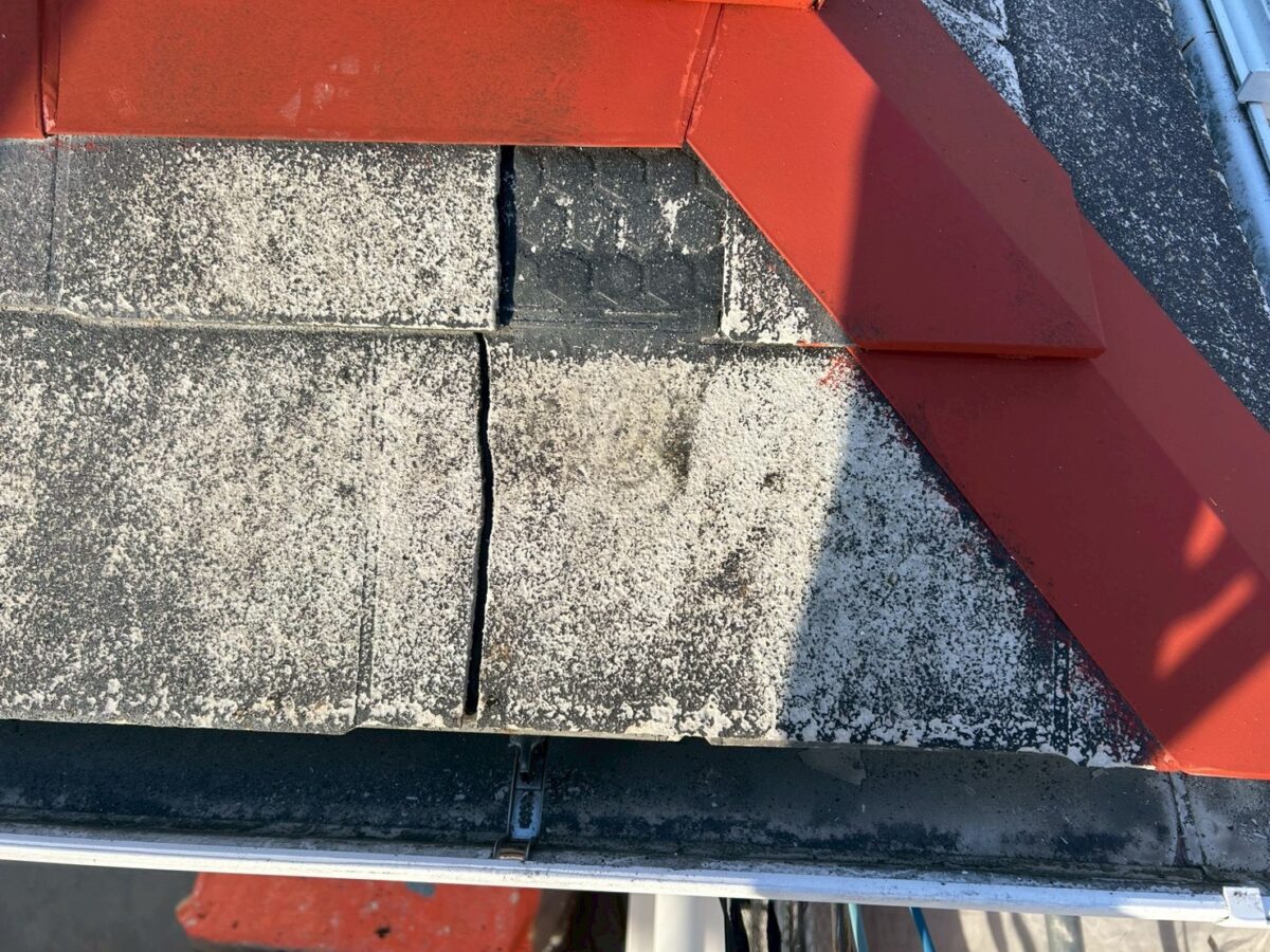 スレート屋根の塗装になります。経年劣化により、屋根に付着した汚れを高圧洗浄作業で綺麗に洗い流します。続きまして、先に棟板金まわりの塗装となります。棟板金の塗装には、日本ペイントの1液ハイポン・ファインデグロの赤さび色を使用です。ハイポン・ファインデグロは1液タイプの錆止め塗料ですが、2液タイプの変性エポキシ樹脂塗料に匹敵する優れた防錆力があり、幅広い下地に塗装可能な錆止め材になります。続きまして、屋根材が部分的に欠損している箇所がありましたので、今回は、板金カバーで補修をおこないました。屋根の下塗り塗装には、アステックペイントのサーモテックシーラーを使用し、中塗り塗装と上塗りの塗装には同じく、アステックペイントのスーパーシャネツサーモFを使用です。下塗り塗装に使用のサーモテックシーラーは、遮熱顔料が含まれているため、太陽の光に含まれる赤外線を反射し、内部への熱の伝達を抑える効果があります。また、下地への浸透性が非常に高いのが特徴で、下地に深く浸透して固めることで、スレートなどの素材を強化し、上塗り塗装の密着を高める役割もあります。上塗り材のスーパーシャネツサーモFは、フッ素塗料になり、こちらも優れた遮熱効果があり、屋根の温度上昇を抑えます。従来の塗料では、熱を吸収しやすかった黒や紺・緑といった人気の屋根色でも高い日射反射率がありますので、どの色を選ばれも遮熱効果が期待できます。4Fフッ素樹脂とチタン複合特殊無機顔料を用いることで、紫外線や酸性雨・雨風といった劣化要因に非常に強い耐久性があり、期待耐用年数は16年から20年と長く、屋根の塗装におススメの塗料となっております。