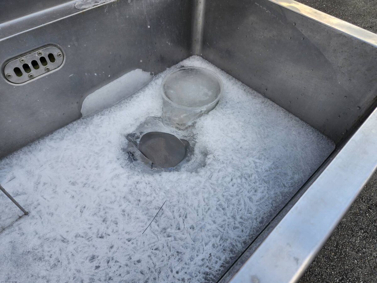 今日の1枚です。今朝は-6℃まで気温が下がっており、事務所裏のシンクがご覧の状態でした。