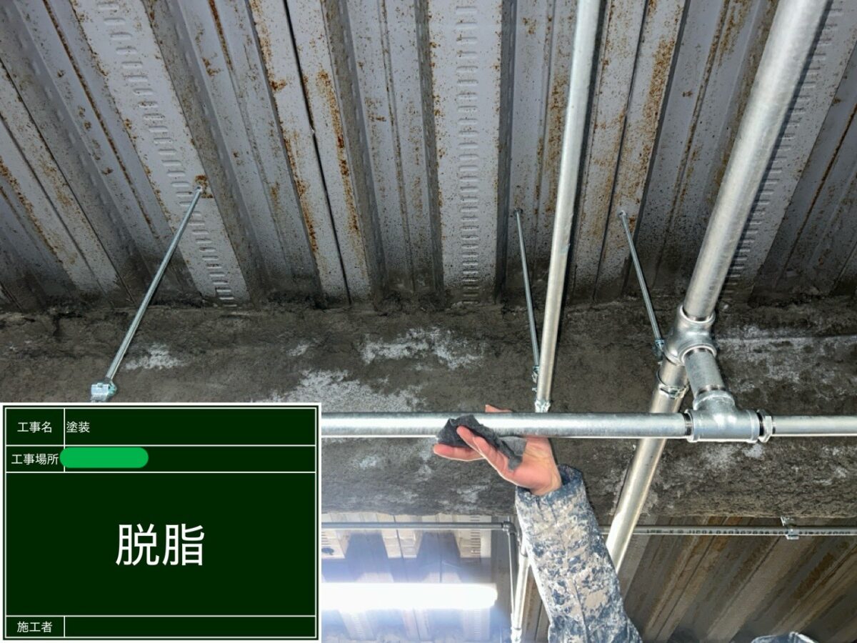 配管の塗装になります。新設の配管になりますので、表面の油分や汚れを除去する脱脂作業が必要となります。脱脂をせず、そのまま塗装してしまうと、塗料がしっかりと密着せず塗膜が剥がれてしまう原因にもなりますので、重要な工程となります。今回の脱脂作業には、アセトンを使用し脱脂作業をおこないました。続きまして錆止めの塗装となります。今回、配管の上塗り材の色分けが多くありましたので、どの上塗り色にも対応できるように、日本ペイントの1液のハイポン・ファインデグロのホワイト色を使用です。今回の色分けは黄・青・緑・ピンクの4色の色分けで配管の塗装をおこないました。使用塗料は、日本ペイントのファインウレタンになります。ファインウレタンは鉛などの重金属を含んでいないため、環境に優しい塗料になり、ホルムアルデヒトやクロルピリホスなども配合されていません。低汚染性や防藻・防カビ性もある塗料になりますので、今回のような紫外線や直射日光、雨や風などを受けにくい場所に塗装する場合に向いている塗料となります。