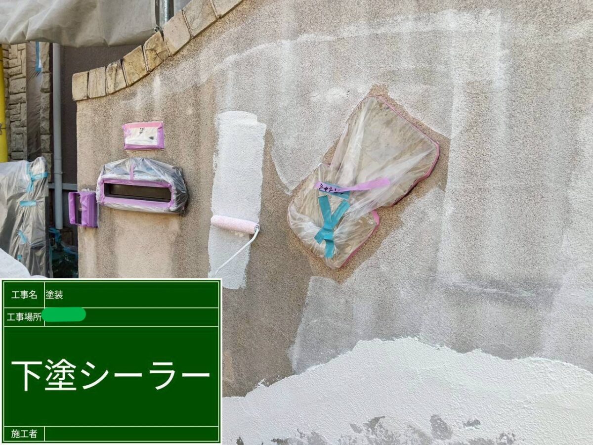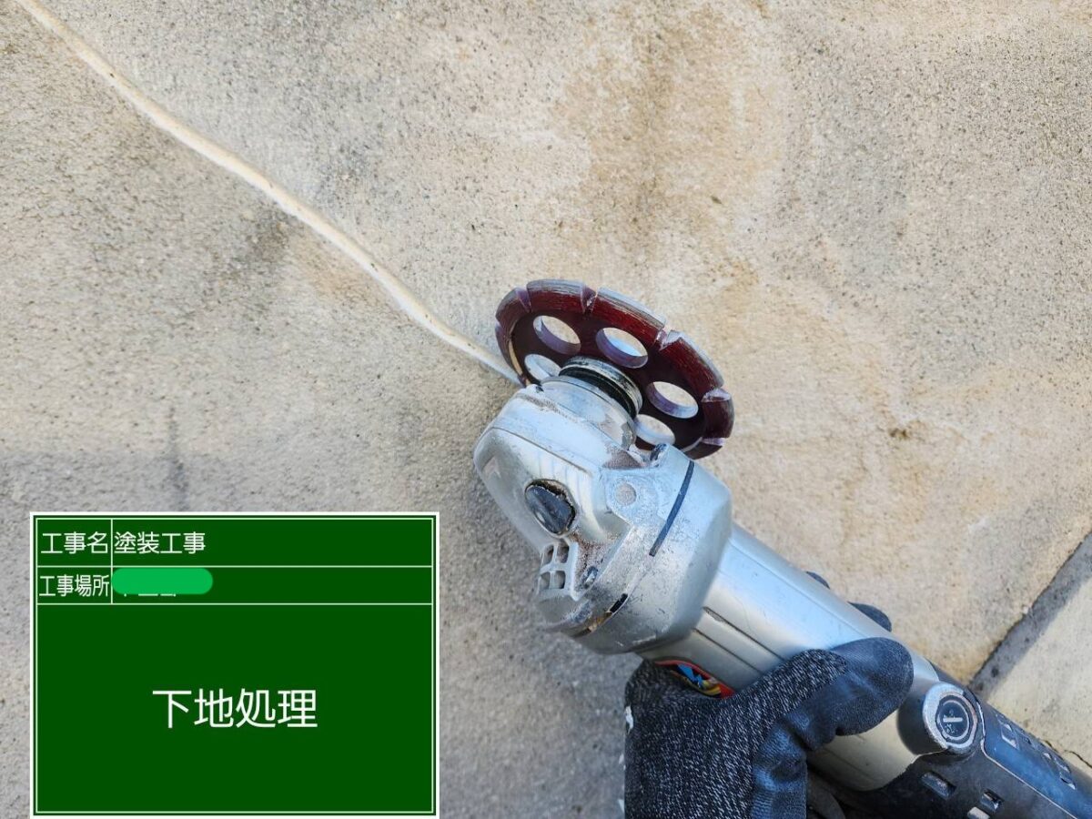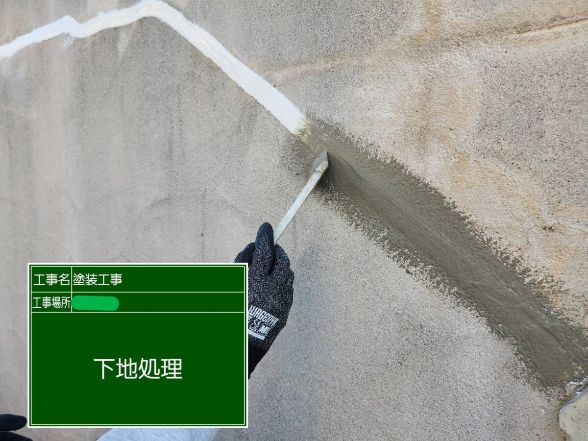 擁壁の塗装になります。既存の擁壁の状態ですが、黒く汚れが付着している部分や、クラック(ひび割れ)が多くあるなど、状態としてはあまりいい状態ではありませんでした。まずは擁壁全体の洗浄作業をおこない、下地処理の工程となります。まずはグラインダーを使用し、クラック部分をUカット処理し、プライマーを塗布し、Uカット処理をおこなった箇所にペイントウレタンを充填し、乾燥後にカチオン樹脂モルタルで擦り込みの作業をおこない、最終の下地処理として、ベルアートで周りの凹凸柄に合うように肌合わせの作業をおこないました。続きまして、下塗りのシーラーの塗装になります。今回、下塗りに使用の塗料は、エスケー化研の水性ミラクシーラーエコを使用です。中塗り塗装と上塗りの塗装にも、同じエスケー化研のアートフレッシュを使用し塗装をおこないました。アートフレッシュには、下記の機能がある塗料になり擁壁の塗装におススメの塗料となっております。