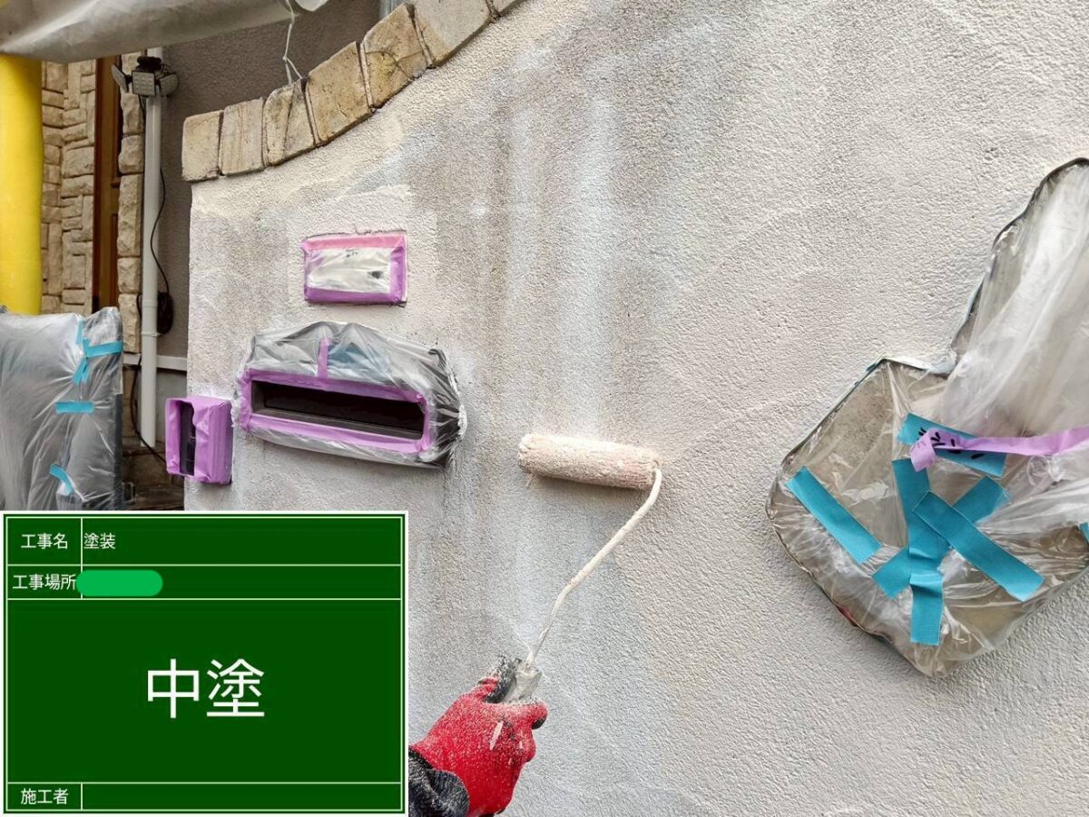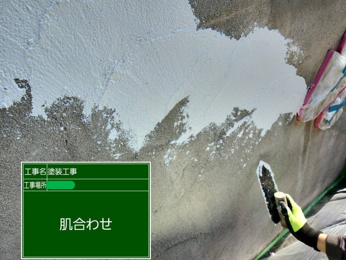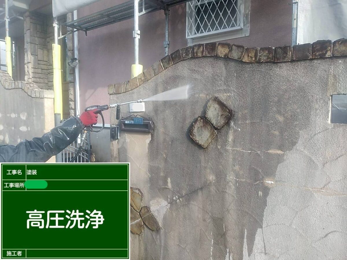 擁壁の塗装になります。既存の擁壁の状態ですが、黒く汚れが付着している部分や、クラック(ひび割れ)が多くあるなど、状態としてはあまりいい状態ではありませんでした。まずは擁壁全体の洗浄作業をおこない、下地処理の工程となります。まずはグラインダーを使用し、クラック部分をUカット処理し、プライマーを塗布し、Uカット処理をおこなった箇所にペイントウレタンを充填し、乾燥後にカチオン樹脂モルタルで擦り込みの作業をおこない、最終の下地処理として、ベルアートで周りの凹凸柄に合うように肌合わせの作業をおこないました。続きまして、下塗りのシーラーの塗装になります。今回、下塗りに使用の塗料は、エスケー化研の水性ミラクシーラーエコを使用です。中塗り塗装と上塗りの塗装にも、同じエスケー化研のアートフレッシュを使用し塗装をおこないました。アートフレッシュには、下記の機能がある塗料になり擁壁の塗装におススメの塗料となっております。