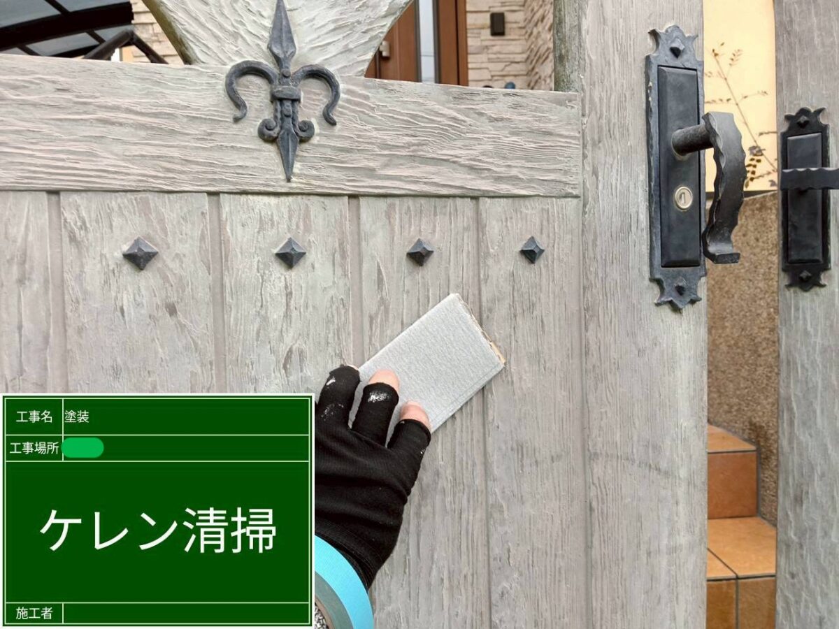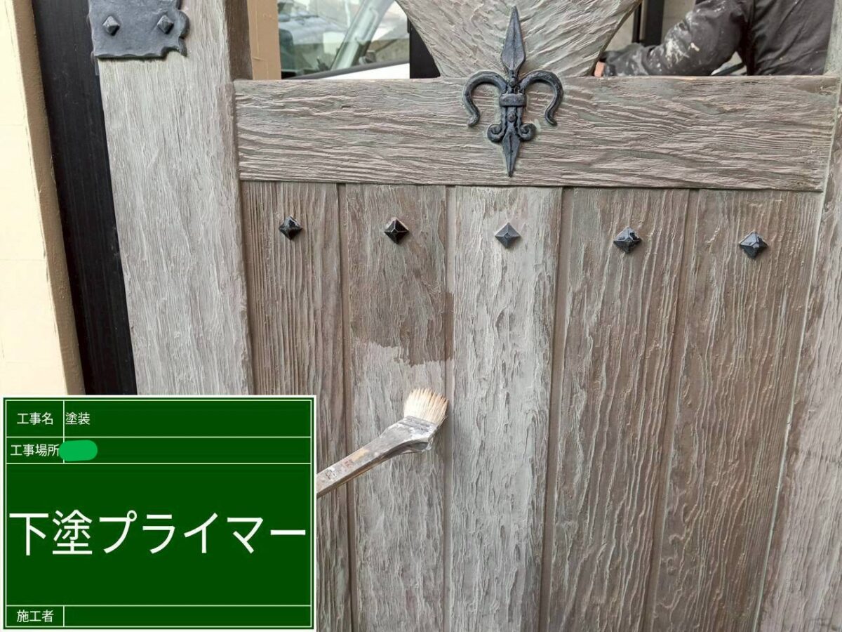樹脂系の門扉の塗装になります。既存の門扉の状態ですが、経年劣化により全体的に退色している状態でした。まずは、塗料が密着しやすいように、目粗しのケレン作業をおこないます。続きまして、下塗りの塗装になりますのが、樹脂系の下地になりますので、下塗り材には、染めQテクノロジィのミッチャクロンを使用です。ミッチャクロンはその商品名通り、樹脂やプラスチック・金属・アルミ・ステンレス・FRPなど、塗料が付きにくい素材にも強力に密着します。また、クリアなので上塗り材の色を気にする必要がなく、速乾性のため、作業効率がよい塗料になります。ミッチャクロンを塗装することで、今まで塗装出来なかった素材にも塗装可能になります。上塗り材には、日本ペイントのファインSiを使用です。塗料の特徴は、