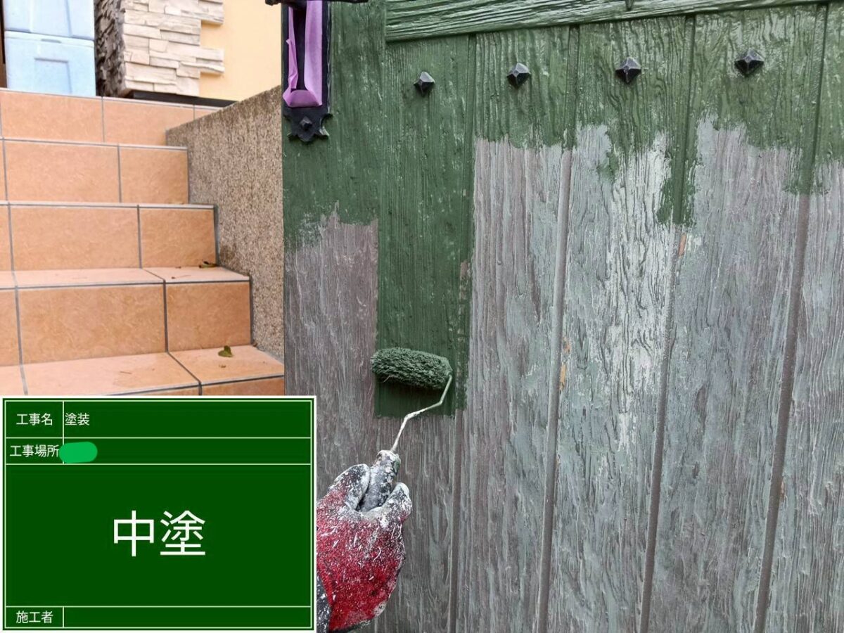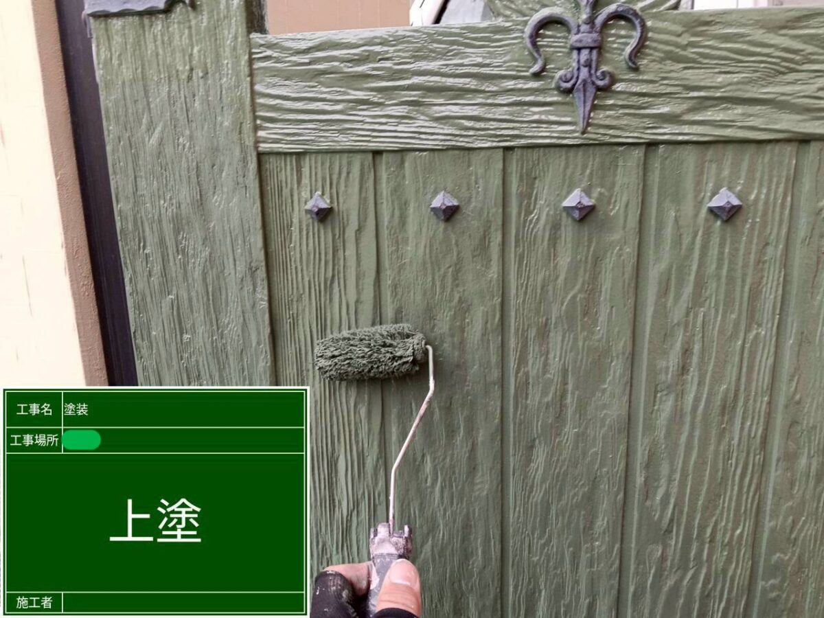 今回の塗装では、どのような色にするのか?施主様に希望の色を伺い、現場で色を作る調色作業をおこない、門扉の塗装をおこないました。可愛らしいグリーン系の門扉になりました。