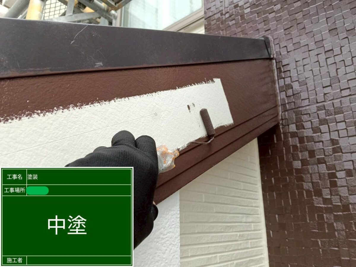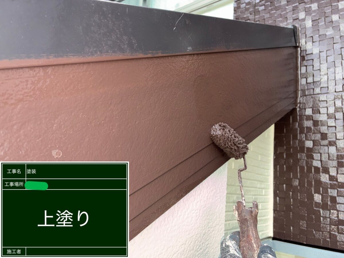 破風の塗装になります。既存の破風はホワイト系の破風でしたが、今回の塗装では、ご覧のようにガラリと色替えをおこない破風の塗装を仕上げました。今回、破風の塗装に使用の塗料は、アステックペイントのマックスシールドNEOのヤララブラウンを使用です。マックスシールドNEOの特徴は、紫外線などによる劣化に強く、外壁塗料と同等レベルの耐久性を発揮し、シリコン塗料でありながら、耐用年数は13~16年の耐久性あり、また、低汚染性の機能もあり、塗膜表面が汚れを付きにくくする性質をもち、長期間にわたって美観を維持します。破風は下塗りの必要がありませんので、中塗り塗装と上塗り塗装の2回塗りで仕上げました。
