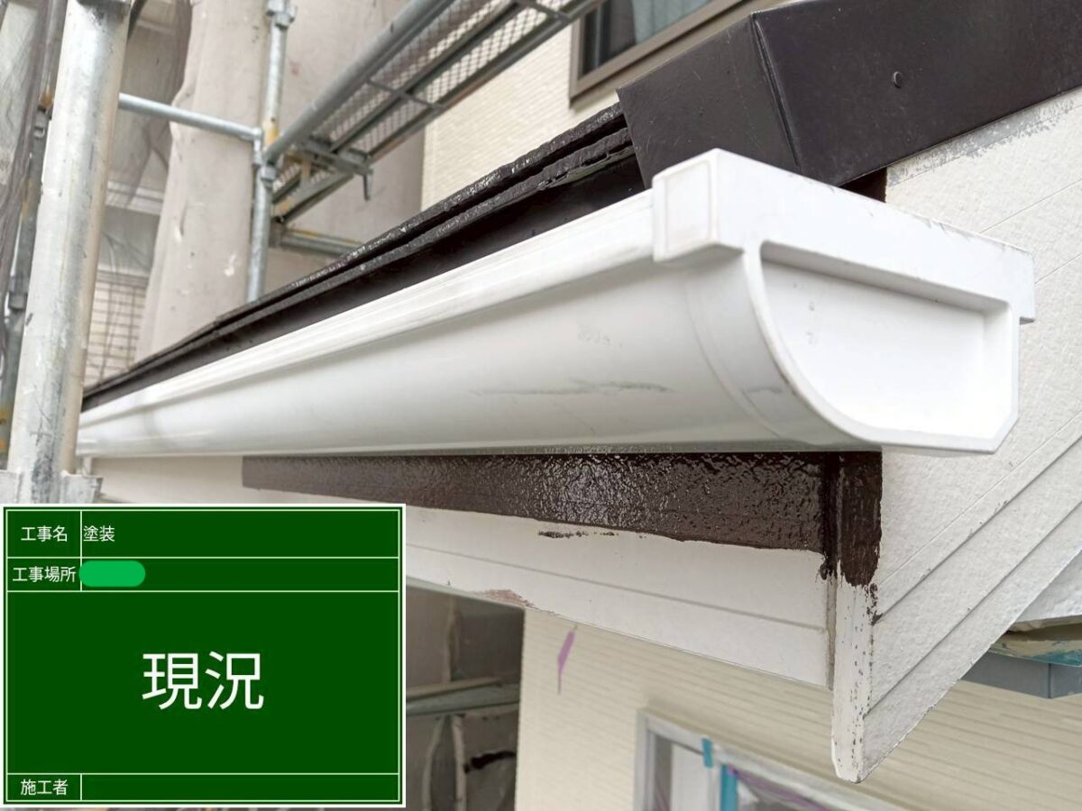 軒樋の塗装になります。今回塗装する、樋の材質は塩化ビニール製になりますので、目粗しのケレン作業後に、上塗り塗装を2回おこない仕上げます。使用塗料は、破風塗装で使用のアステックペイントの1液マックスシールドNEOになります。通常、1液塗料は2液塗料に比べて耐候性が劣る傾向にありますが、マックスシールドNEOは特殊な技術で、紫外線の劣化要因のラジカルを抑制し、1液ながら長期間の保護性能を発揮する塗料になります。また、艶や色の選択があり、艶有・3分艶・標準色の69色+特別色対応もありますので、好みの艶や色で塗装可能ですので、付帯物の塗装におススメの塗料となります。今回、艶は3分艶で塗装しました。