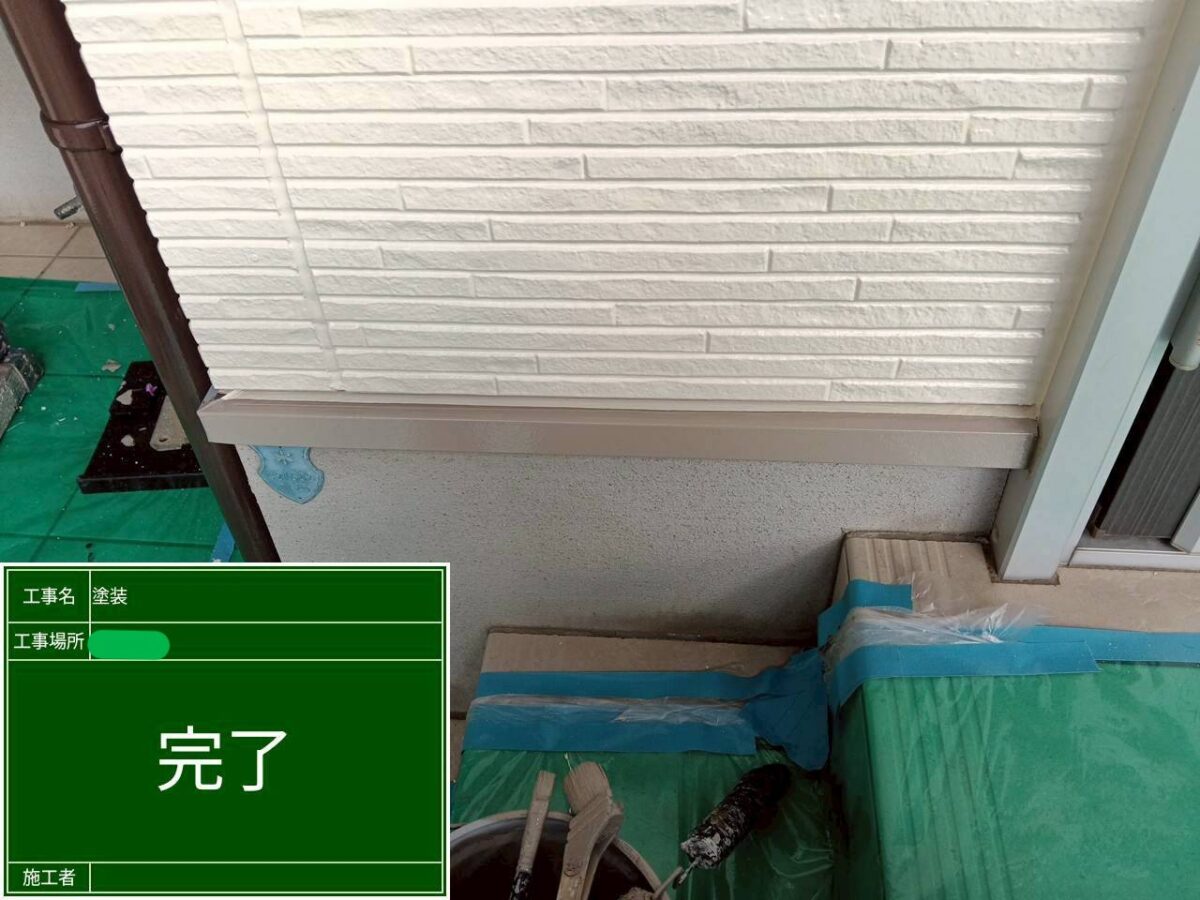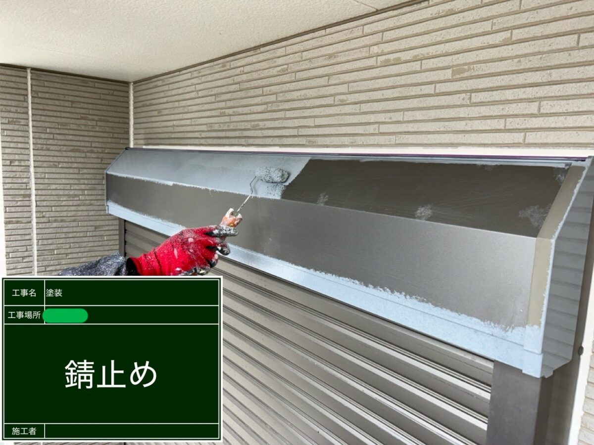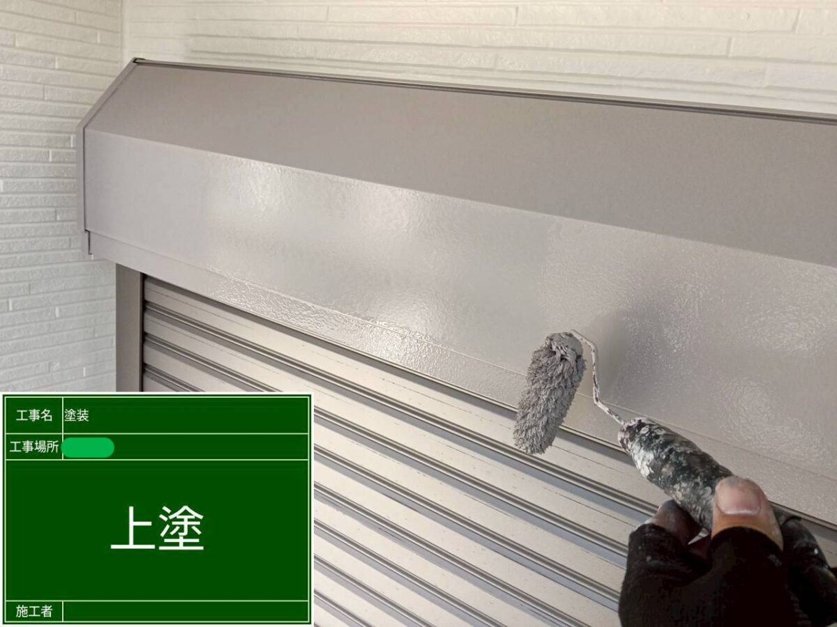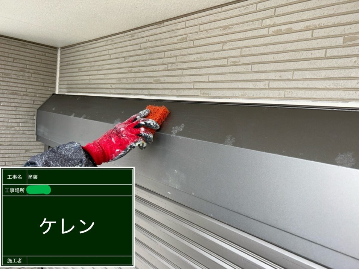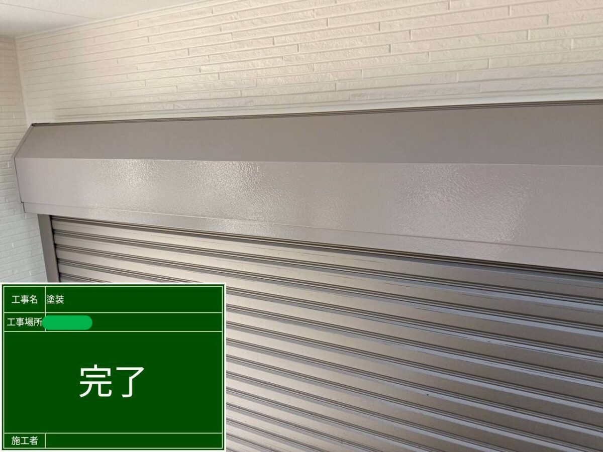 鉄部のシャッターBOXの塗装です。軒下にあるシャッターBOXでしたので、比較的綺麗な状態でした。まずは目粗しのケレン作業をおこない、下塗りの錆止めの塗装をおこないます。錆止めの塗装には、日本ペイントの1液ハイポン・ファインデグロのグレーを使用です。2液型エポキシ錆止め塗料と同等の防錆力があり、サビに強く、鉄部・ステンレスなどの金属部分の下塗りに最適で、乾燥が早く1液タイプの塗料なので作業性がよいのが特徴です。上塗り塗料には、同じく日本ペイントの1液ファインシリコンセラUVを使用です。1液ファインシリコンセラUVは、ターペン可溶1液反応硬化形セラミック変性シリコン樹脂塗料で塗膜が緻密・強靭な構造になり、表面の劣化を抑える・紫外線・雨風などの環境影響に強い・光沢が長時間持続するなどの特徴があり、また、雨だれ汚れが付きにくい・緑色や黒ずみの発生を防ぐ・外観美観を長く維持できる、汚れ・カビ・藻に強い低汚染性がありますので付帯物の塗り替えに適している塗料になります。
