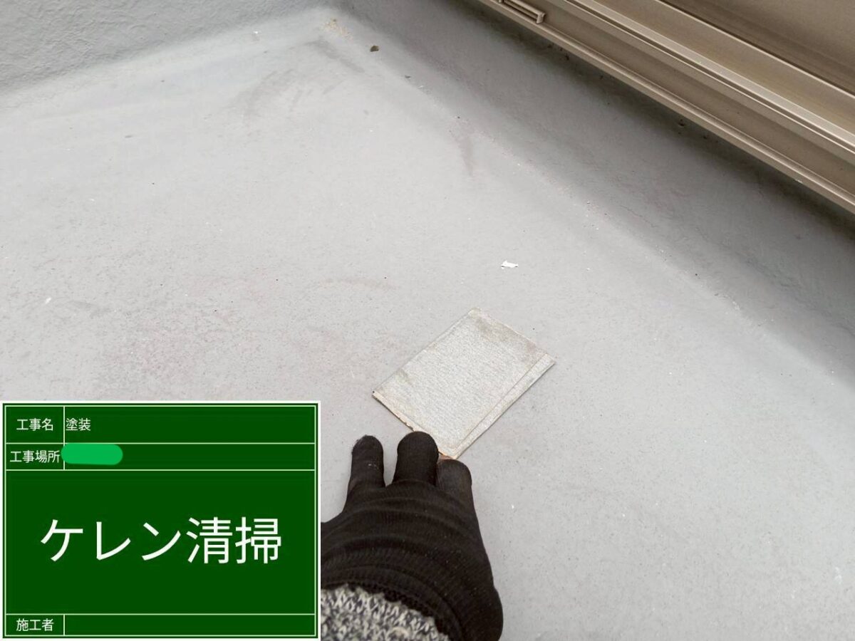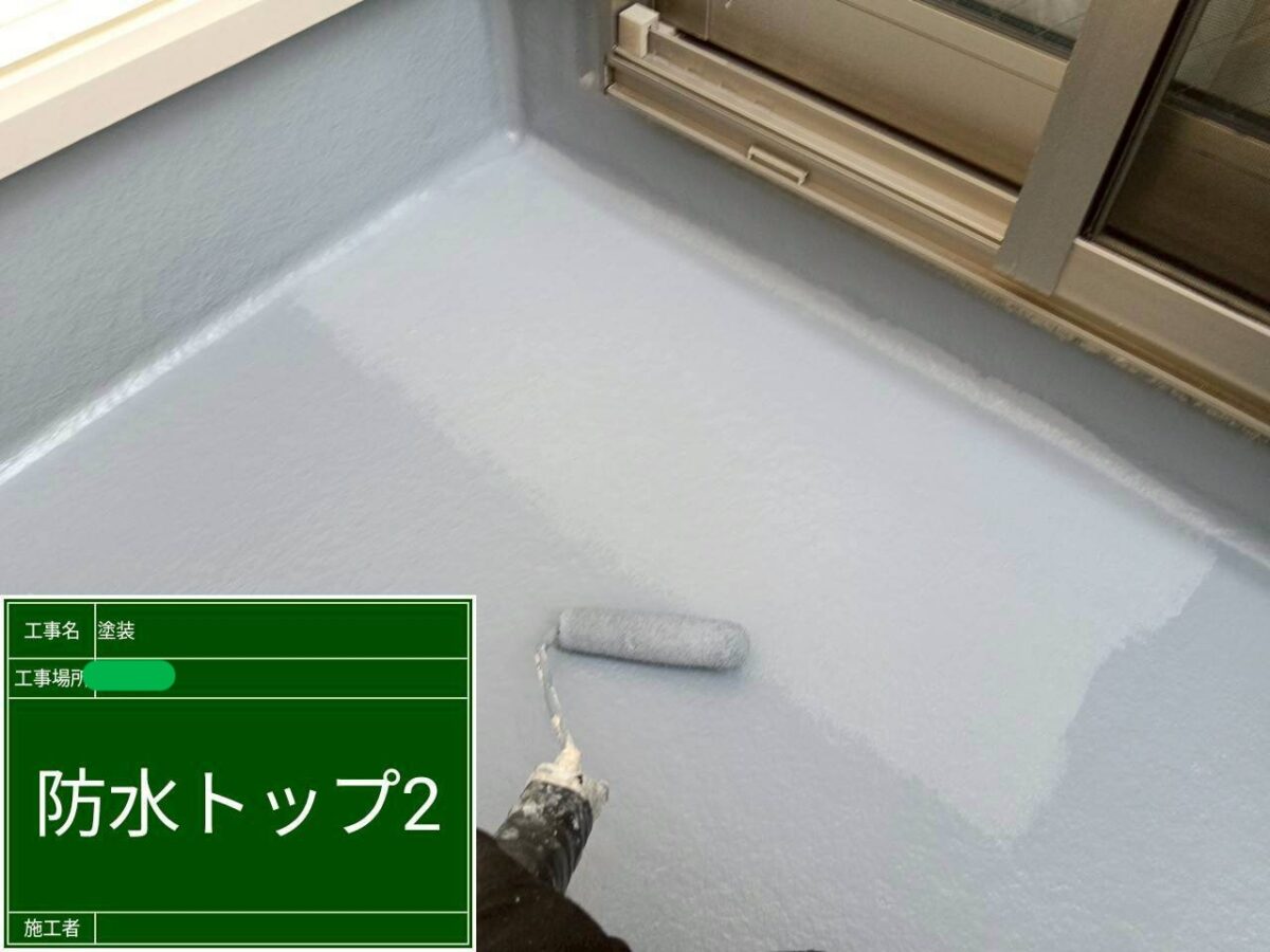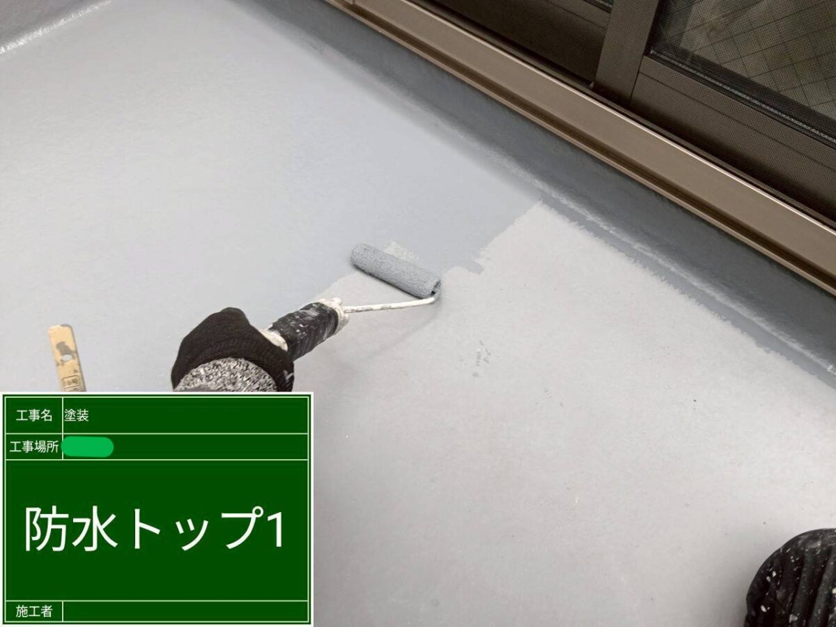 バルコニー床のトップコートの塗装になります。バルコニーは日当たりがよく、経年劣化で色褪せていましたが、補修や下地処理の必要はありませんでしたので、ケレン作業をおこないトップコートの塗装をおこないました。使用塗料は、カナエ化学工業のFRPトップ(骨入り)になります。FRPトップは1液タイプの塗料になり水性塗料になりますので、臭気が少ないのが特徴で、高圧洗浄で汚れを落とせば、アセトン拭きなどの下地処理をおこなわず塗布でき、ポリエステル樹脂とアクリル樹脂をハイブリットした特殊樹脂配合により、従来のアクリル系よりもFRP防水層への密着性・耐久性・耐水性が高い仕上がりになるのが特徴で、FRPのバルコニーの床の塗装におススメの塗料となります。