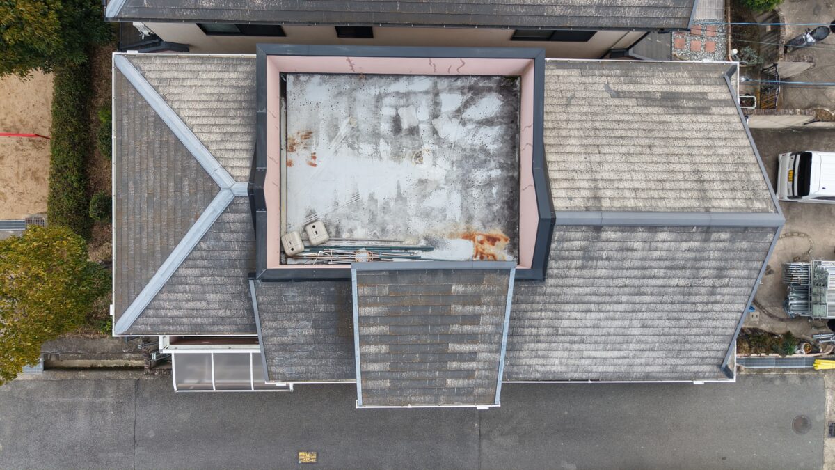 施工前の現況になります。既存の外壁はモルタルの外壁になり、屋根はスレートの屋根になります。外壁は、経年劣化により退色しており、前回塗装した際の補修跡が目立っている状態でした。屋根は色褪せや劣化があり、擁壁の汚れも目立っており、建物全体としては、各所が劣化している状態でした。