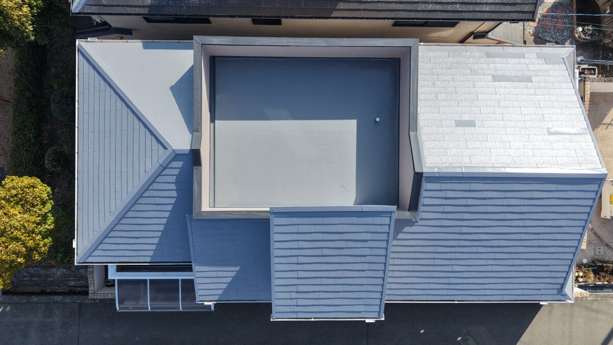 屋根の塗装になります。使用塗料は、アステックペイントのスーパーシャネツサーモF(フッ素塗料)のサンドグレイで仕上げました。期待耐候年数は16年~20年と長く、スレート屋根の塗装におススメです。