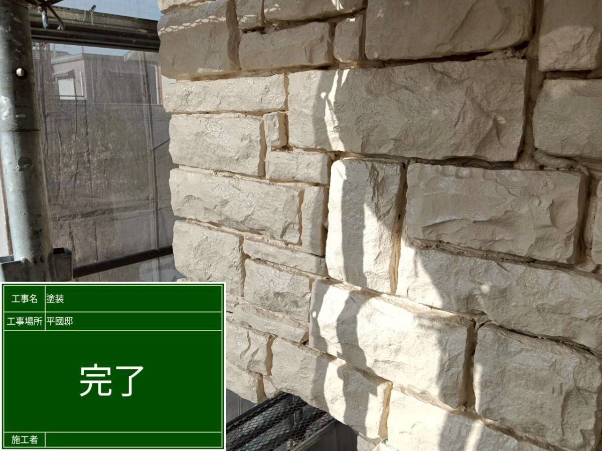 各付帯物と擁壁・屋上の防水塗装となります。付帯物の塗装には、日本ペイントのシリコン樹脂塗料のファインSiを使用です。今回、窓の飾り枠の劣化が酷く、浮いている塗膜を取り除き、カチオン樹脂モルタルやウレタンコーキングなどで下地処理をおこない仕上げました。擁壁の塗装には、SK化研の艶消し塗料のアートフレッシュで仕上げ、屋上の防水は、下地が完全に劣化しておりましたので、既存の防水材をすべて撤去し、下地調整からやり直し、屋上の防水を仕上げました。