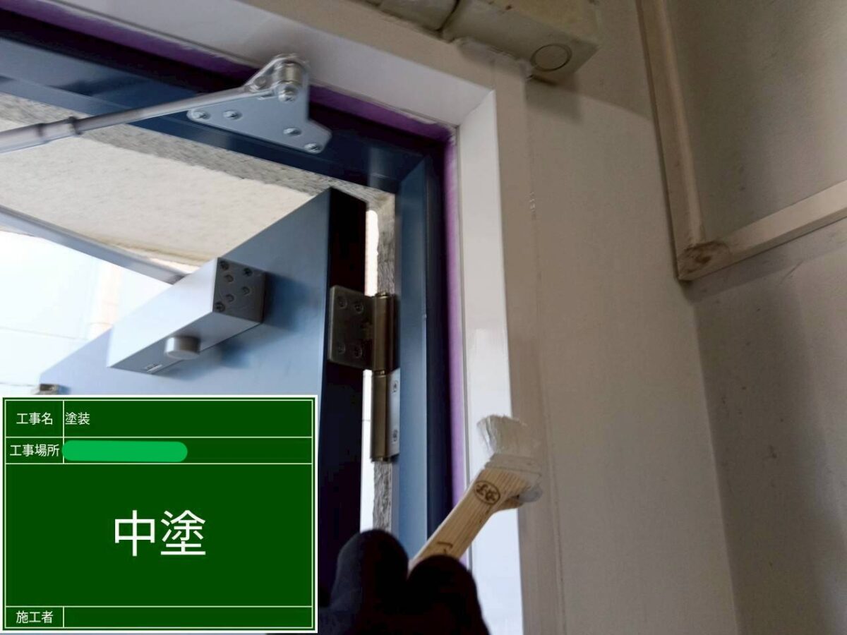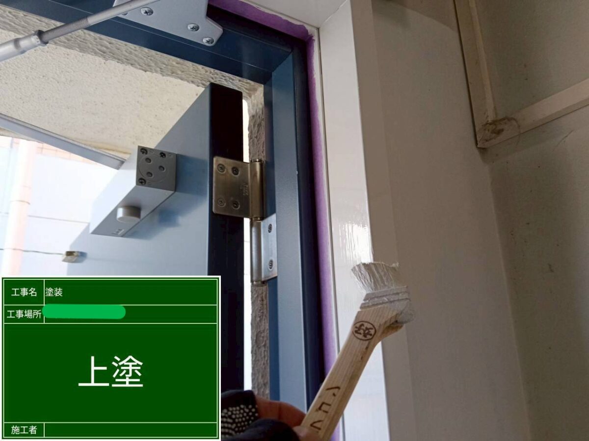 扉の木枠の塗装になります。木枠になりますので、まずは、下塗り塗装の、グランドコートを塗装します。グランドコートは、木部の吸い込み止め・下地を均一にする効果があり、乾燥後に表面が平滑になるようにペーパーがけをおこなうことで、木材表面の粗さや微細な穴をきれいに埋める役割があります。また、平滑になることで、上塗り材との密着がよくなります。中塗りと上塗りの塗装には、日本ペイントのファインSiを使用です。ファインSiは弱溶剤のシリコン塗料系塗料になり、さまざまな下地に塗装が可能で、木部の塗装にも使用可能です。耐候形1種の性能で、長期間美しさを保ち、隠ぺい性が高く、塗りやすいのが特徴で、防藻・防カビ性がありますので、美観を維持します。環境への配慮として、弱溶剤で臭気がマイルド。鉛やホルムアルデヒドを含まず、臭気対策が必要な場所でも施工が可能な塗料になります。今回の施工場所の扉の内側は室内になりますので、このような場所でも、臭いを気にせず施工できます。色は、日塗工の色番で、N-90で木枠の塗装を仕上げました。