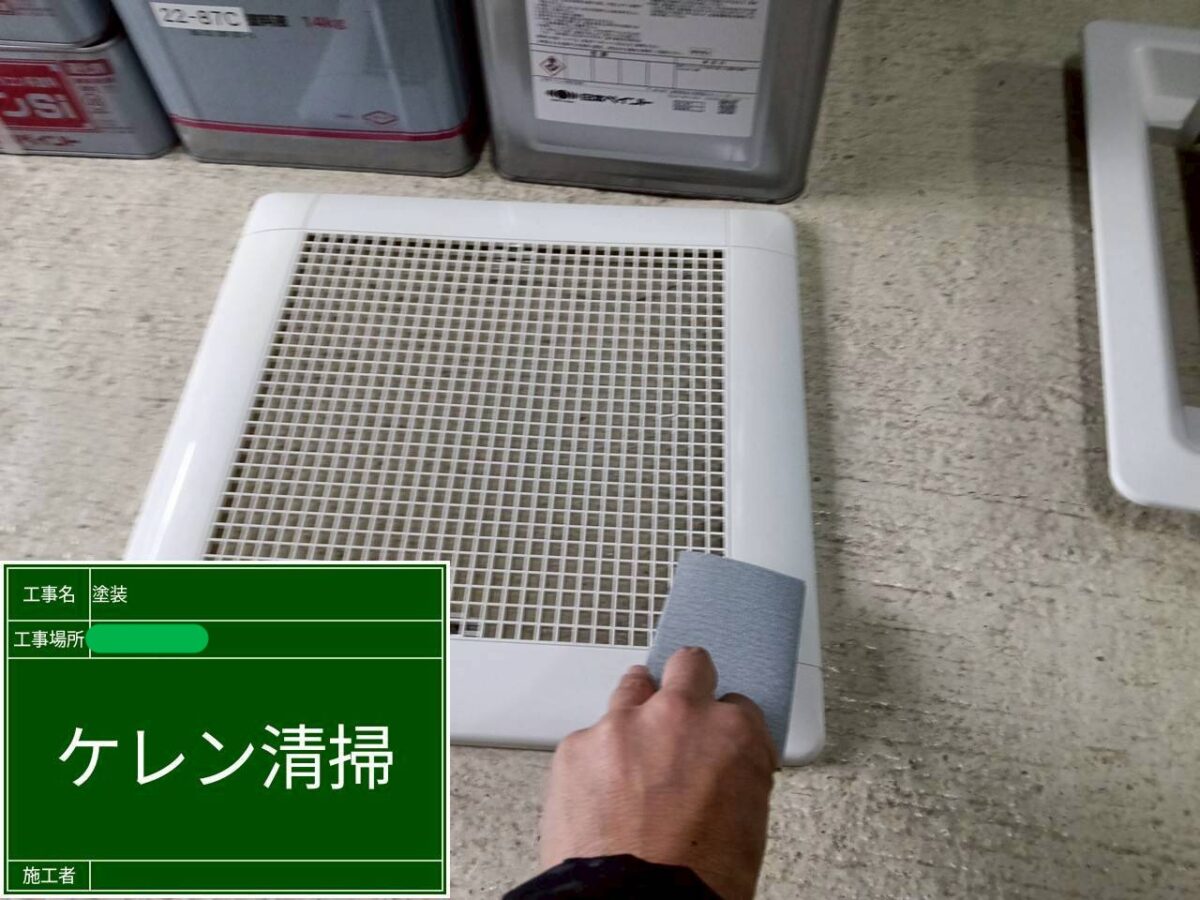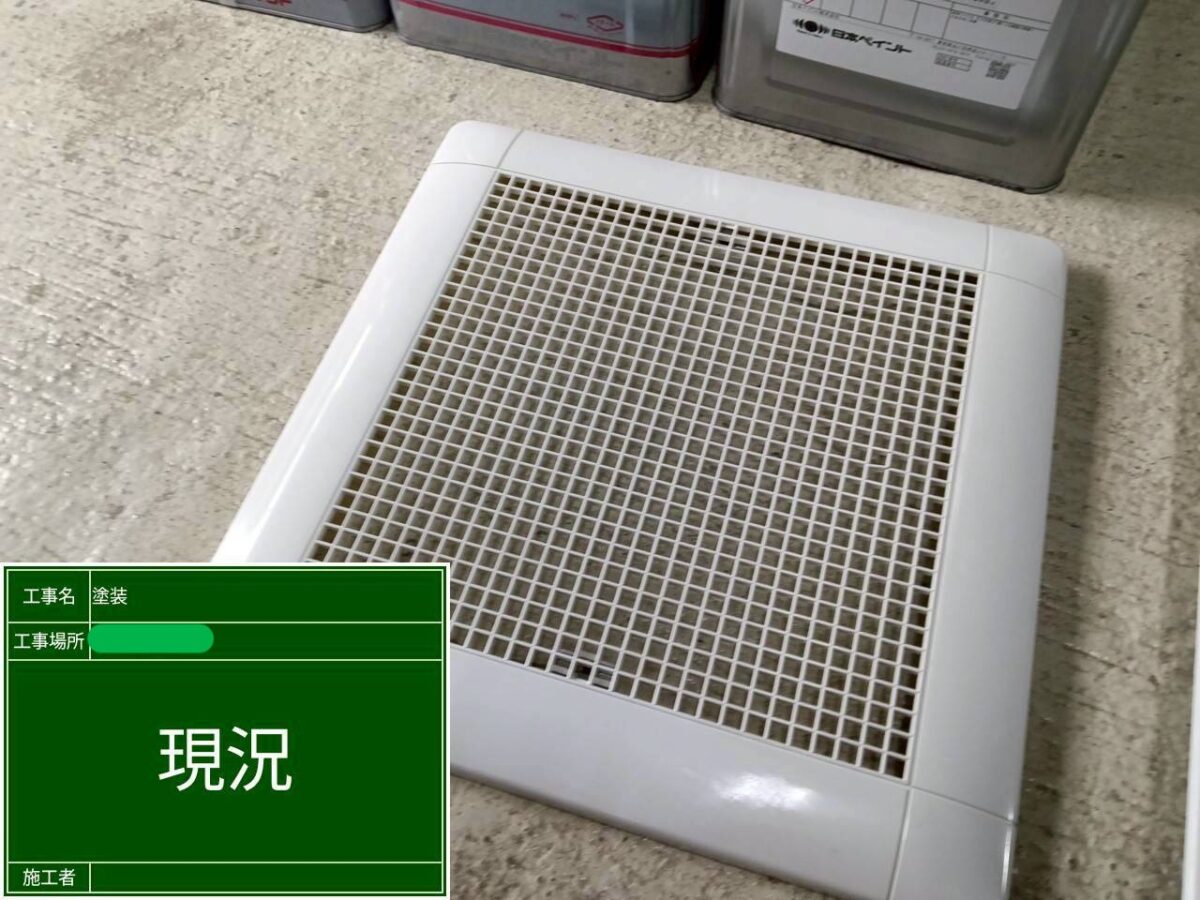 倉庫にて、天井の点検口枠と天井埋込形ダクト用換気扇の塗装をおこないましたので、ご紹介します。