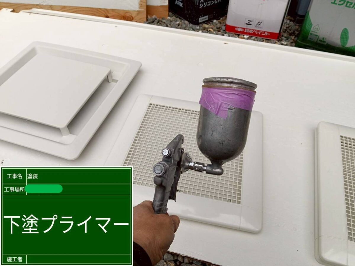 天井に取り付ける換気扇の塗装になります。点検口の枠塗装とは違い。中央部分が網目になっておりますので、刷毛やローラーでは、綺麗に塗装が出来ないと判断し、今回はカップガンを使用し、下塗りの塗装から吹付塗装をおこないました。下塗りの塗装には、同じように染めQテクノロジィのミッチャクロンを塗布し、中塗りと上塗りの塗装の際も、吹付塗装をおこない、換気扇の塗装をおこないました。使用塗料は、日本ペイントのファインSiを使用です。吹付塗装はやっぱり綺麗に仕上がりますね!