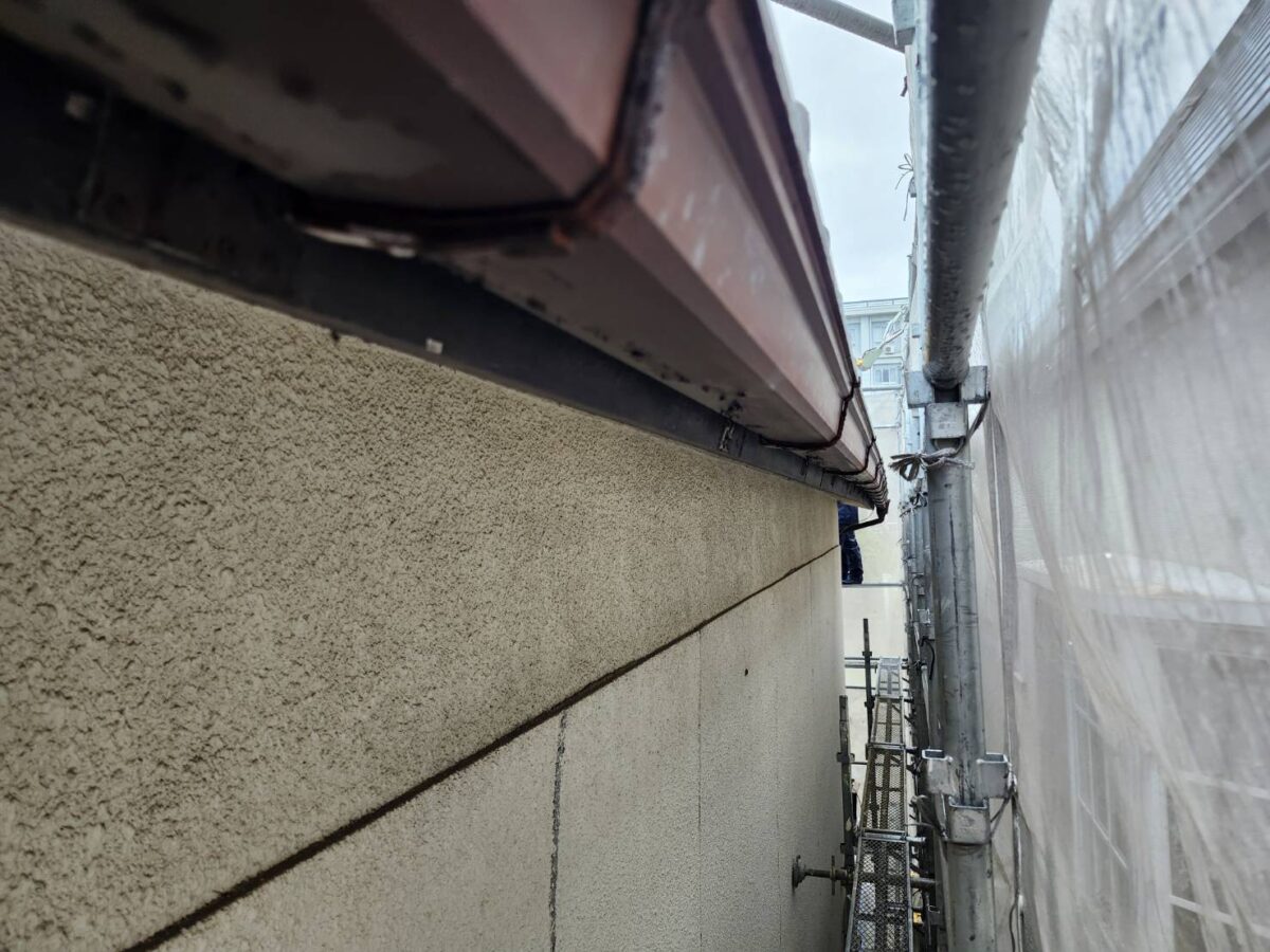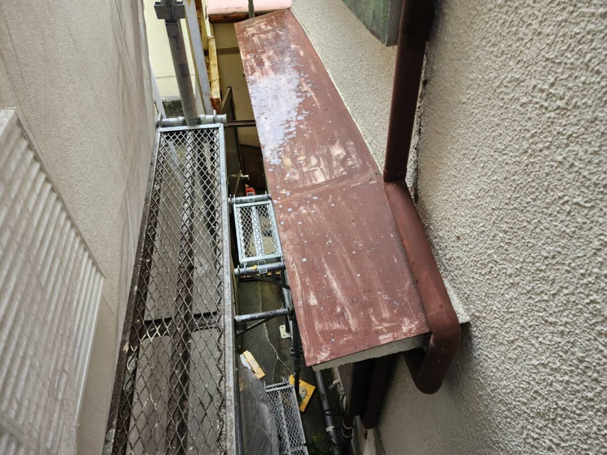 塗装前の付帯物の状態ですが、ご覧のように経年劣化が目立っている状態でした。今回の塗装では、付帯物の塗装が多く、軒樋・縦樋・庇・雨戸・戸袋・水切り・破風板・面格子・バルコニー手摺など、多くの付帯物塗装があります。塗装後が楽しみな現場です。また、現場ブログで塗装の様子をご紹介しますね。