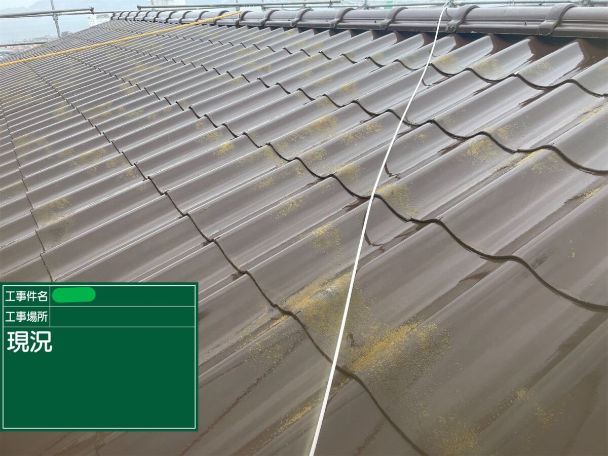 屋根の高圧洗浄になります。既存の屋根の状態ですが、割れている箇所や欠損している箇所などはありませんでしたが、ご覧のように、屋根全体に苔が多く付着している状態でした。高圧洗浄の際は、苔が残らないように綺麗に洗浄作業をおこなうことで、塗装の寿命も変わってきますので、高圧洗浄の作業は、塗装前の重要な工程になります。