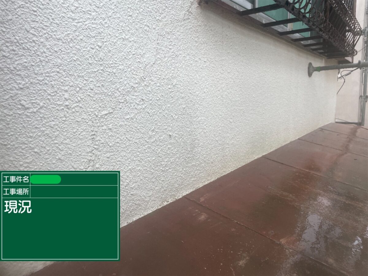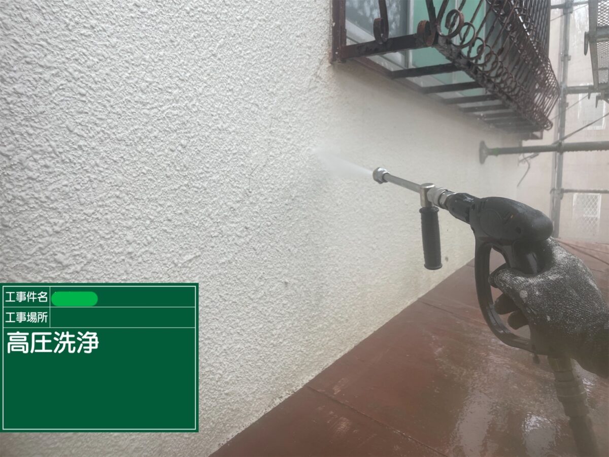 既存の外壁はモルタルの外壁になります。紫外線や雨風の影響を受けて、外壁は劣化し、チョーキングしておりました。外壁の劣化の目安ともされています、チョーキング現象とは、外壁を手で触ると白い粉が手につく状態のことを指します。日本語では「白亜化現象」とも呼ばれております。チョーキング現象が出るということは、塗膜が劣化してきており、外壁を塗り替える一つの目安とされています。チョーキング現象そのものは緊急の危険ではありませんので、塗料の寿命が近づいている合図だとお考えください。外壁の高圧洗浄の際は、出来るだけ表面のチョーキングを除去し、苔や藻などを落とすことが、高圧洗浄の際は重要になります。